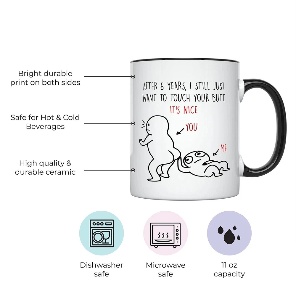 CONTACT US DIRECTLY FOR FREE & PREPAID RETURNS 6 Years Anniversary Mug, 11 Ounces, Funny 6th Anniversary Coffee Mug for Him,... ☕ [Permanent Print on Both Sides] - We use the best quality ceramics, and our images are printed with strong, vibrant, and long-lasting colors. Made using a permanent sublimation process, the print will not fade, peel or chip away so you can use your favorite hilarious coffee mugs every day. The design of this edgy coffee mug is printed on both the front and back so it is perfect for left- and right-handed people. ☑️ [Dishwasher and microwave safe] - Cleaning this coffee cup is easy - simply put it on the top rack of your dishwasher and voila - you are done! More time enjoying your favorite drinks, less time cleaning! Need a hot drink? No worries as these cool coffee mugs with sayings are microwave safe. Enjoy your hot drinks whenever you like with these white coffee mugs! 📦 [is our number one priority] – Your new 6 years anniversary coffee cup will arrive packed in a durable heavy duty box to keep it safe during shipping. If you have any questions or concerns, please us – we are just a click away! 🎁 [Unique 6 years anniversary coffee mug] - Looking for the perfect birthday gifts for husband, 6 years anniversary gifts, 6th anniversary gifts for her, or sixth anniversary gifts for her? Then these novelty coffee mugs are the perfect 6th year anniversary gifts for men or 6th wedding anniversary gifts for him! They come with a unique design - sure to fetch compliments! Share these funny coffee mugs with your wife and show them how much you appreciate them. ♥️ [From Our Family to Yours] - is a family-owned business and we put a lot of love into our products. We know how important your gift recipients are. We take pride in creating unique and thoughtful gifts for every occasion, like Valentine’s Day gifts, Mothers Day or Fathers Day gifts, graduation or birthday gifts, anniversary gifts and Christmas gifts. Our mugs are a simple and fun way to say “Happy Birthday”, “Congratulations”, or “Happy Retirement Day” for husband or wife. REVIEWS The product came very well packaged. I'm very happy. thank you for everything. Seller strongly recommended. This is great! I definitely recommend! Product looks amazing Delivery was fast. Excellent seller, great communication. I advise everyone