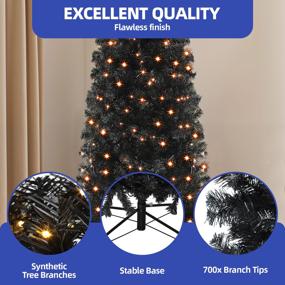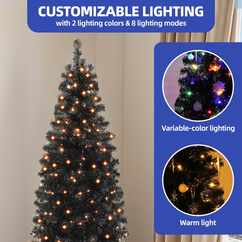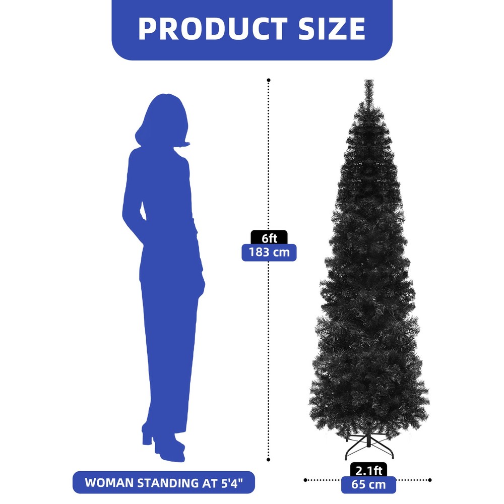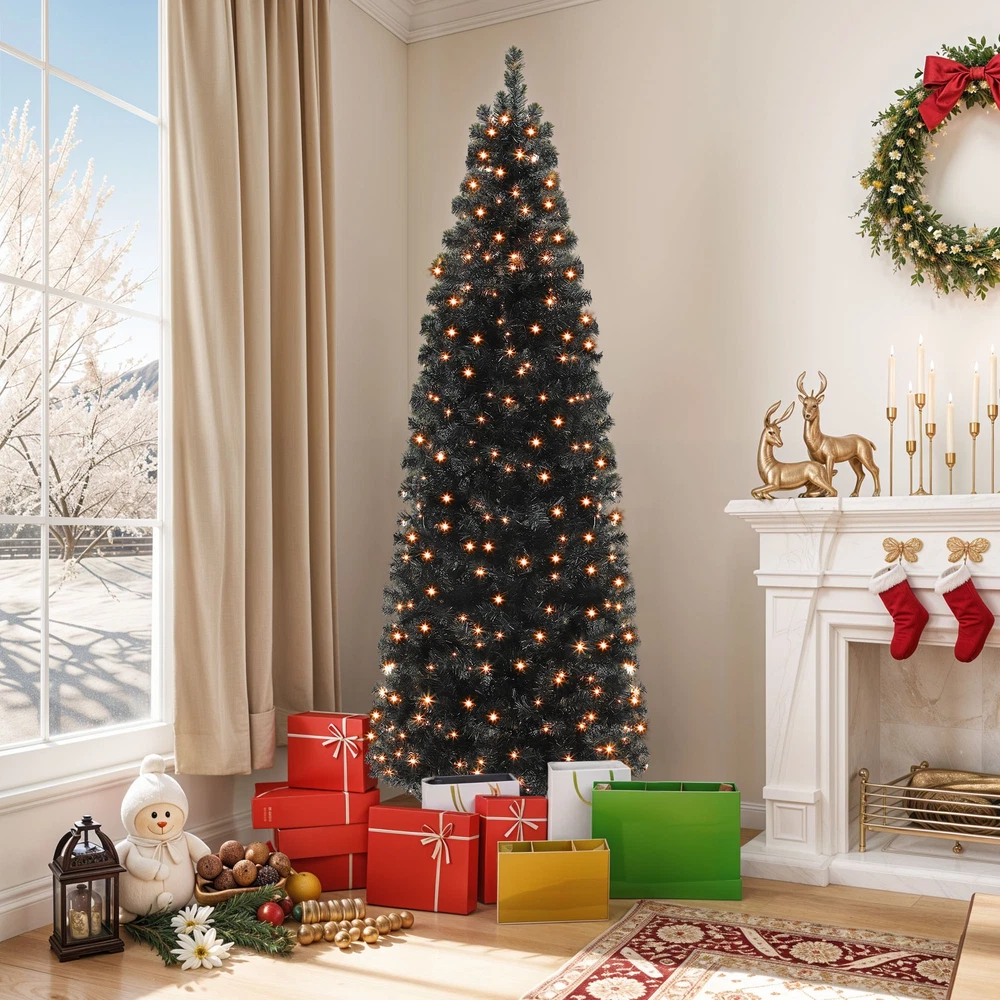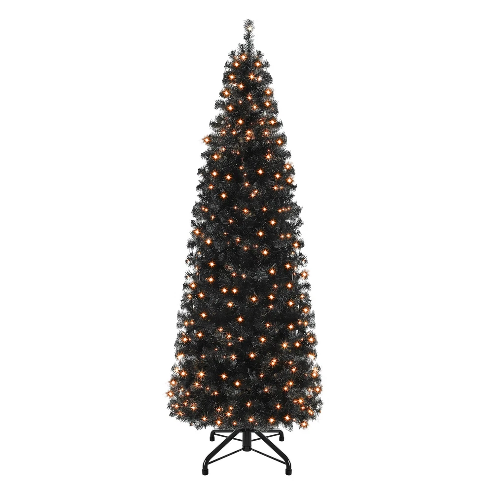 6 ft Prelit Black Pencil Christmas Tree with 200 Lights and 700 Branches for Slim Holiday Decor
