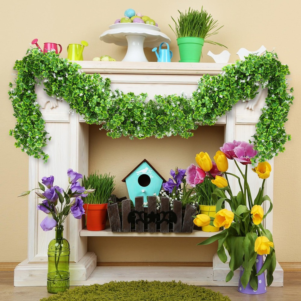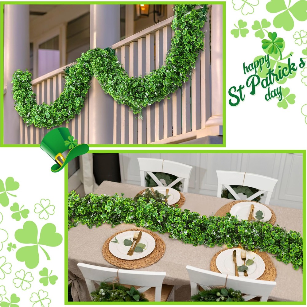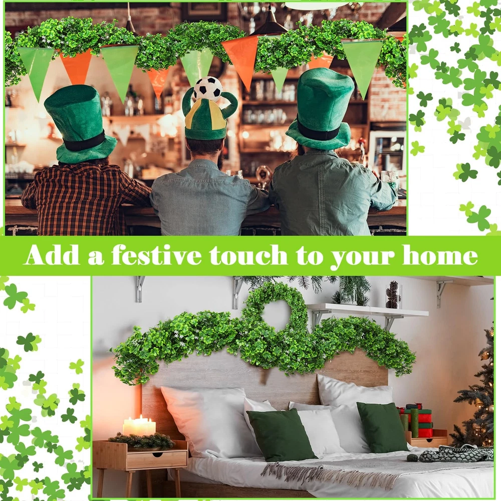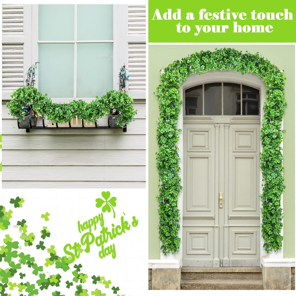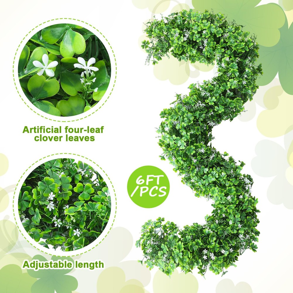 Features: Package include: Celebrate St. Patrick's Day in style with our St. Patrick's Day garland, measuring about a generous 6 feet long and 6.7 inches wide, nice for adding festive charm to any space. Wide application: Ideal for a wide range of settings, this green clover garland looks stunning when displayed on mantelpieces, walls, bedrooms, living rooms or spiral staircase railings. It also beautifully complements other festive decorations without feeling out of place. Specifications: Material: mainly plastic Color: mainly green Size: about 6 feet x 6.7 inches (L x W) Package includes: 1 x St. Patrick's Day garland Notes: Manual measurement, please allow slight errors on size. The color may exist a slight difference due to different screen displays. Vibrant St. Patrick's Day Decoration: enhance your festive spirit with our 6 ft St. Patrick's Day garland featuring realistic green shamrocks that bring a touch of nature into your home, making it the ideal Irish decoration garland for all celebrations Quality Materials: crafted from sturdy and durable plastic with an artificial clover design, our green shamrock garland is designed to withstand various weather conditions, ensuring it won't wilt, fade or easily damage, making it a reliable choice for indoor and outdoor use Flexible Design: the garland made with density floral construction can be flexibly twisted to create your own designs; If any shamrock leaves detach during shaping, they can be easily reattached, allowing for endless creation in your decorations Irish Celebration: our Irish decoration garland is about 6 ft long and 6.7 inches wide; The lifelike green vine design, brings the beauty of nature indoors, making this clover garland for St. Patrick's Day an ideal gift or decoration for your festive celebration Versatile Usage: enhance your home with our St. Patrick's Day decoration that is nice for adorning mantels, walls, bedrooms, living rooms, stair railings, table centerpieces, or combining with other decorations for a cohesive and natural look