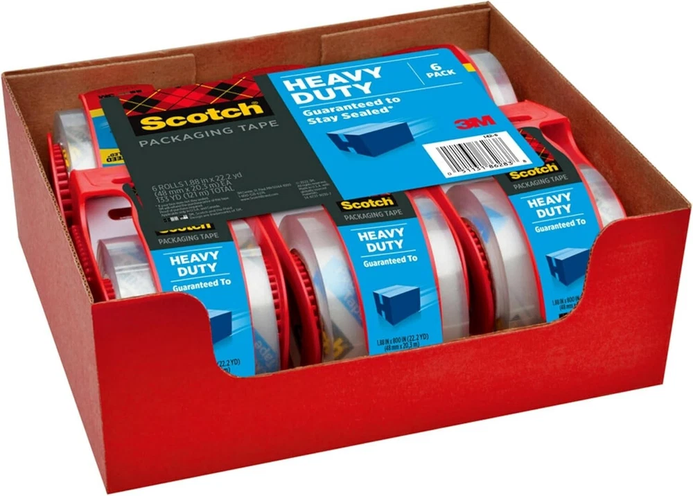 Scotch Heavy Duty Shipping and Moving Packing Tape, Clear, Packing and Moving Supplies, 1.88 in. x 22.2 yd., 6 Tape Rolls with Dispensers Warehouse in USA and Free Shipping in USA About this item PACKING TAPE: 6 rolls of Scotch Heavy Duty Shipping Packing Tape come in dispensers for convenient application and offer excellent holding power for your moving, packing and shipping needs INDUSTRIAL-STRENGTH ADHESIVE: Industrial- strength, solvent-free adhesive adheres instantly to lock in the heavy-duty contents of your boxes and lock out everything else, even through rough handling conditions FOR ALL BOX TYPES: Carton tape that works on all types of boxes, including harder-to-stick 100% recycled boxes JUST ONE STRIP NEEDED: Shipping tape that resists slivering, splitting and tearing to keep your moving boxes sealed with just one strip on each seam IDEAL FOR: It's a great parcel tape for shipping items to your new home, as well as for sealing moving boxes USE WITH TAPE DISPENSER: Dispenser (included) provides precise cuts and features fall-back tabs to help ensure tape doesn’t fall back on the roll, keeping it ready for the next use Thank you for choosing my store and hope all the best things will come to you!