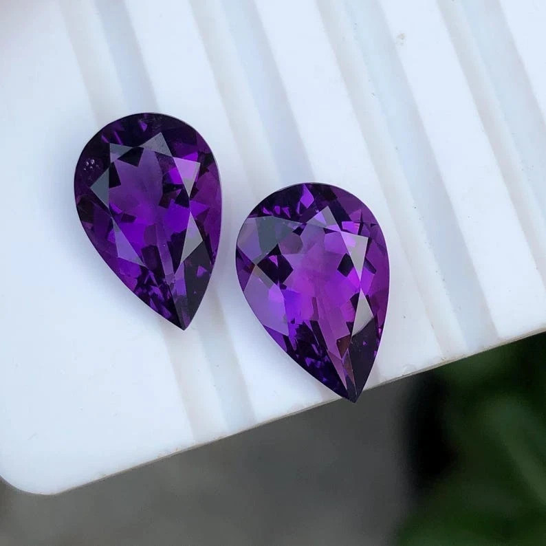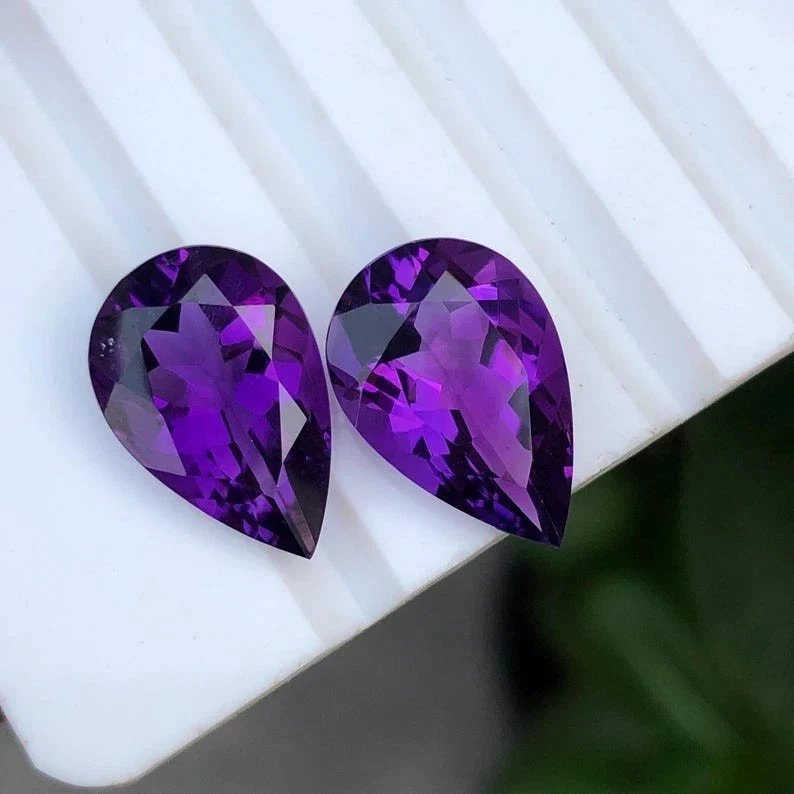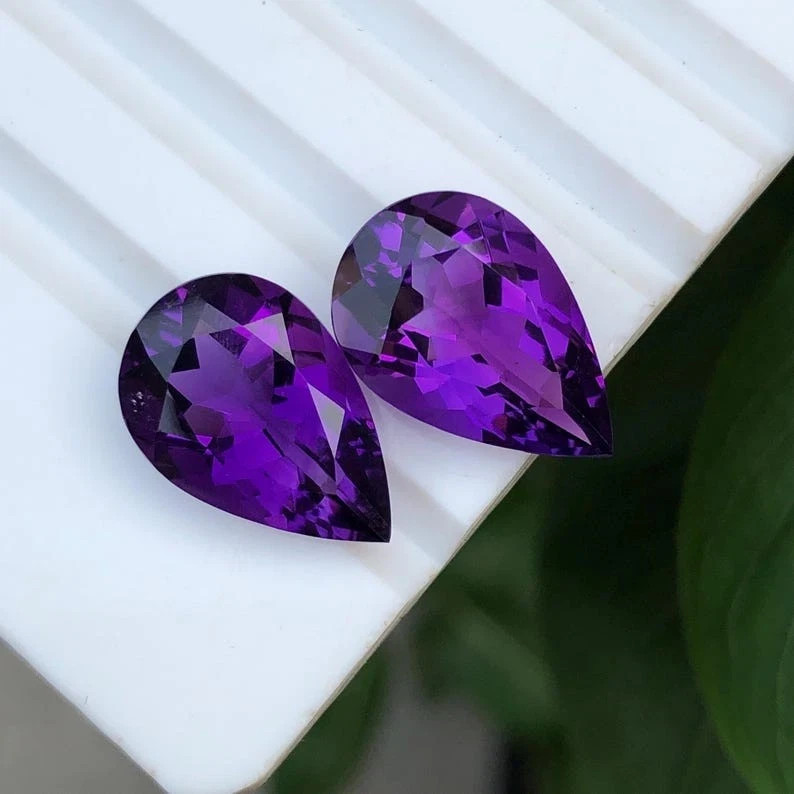 ✨ Gemstone Overview Gemstone: Natural Amethyst Weight: 60+ Carats (Pair Total) Quantity: Matching Pair (2 Gemstones) Shape & Cut: Pear Cut Color: Deep Vibrant Purple Clarity: Excellent Transparency, Eye-Clean Treatment: Heated (Enhances Color & Brilliance) Origin: Brazil – World-renowned source of fine amethyst Certification: Certified Authentic Gemstones ✨ Highlights ✔ Rare matching pair of large pear cut amethysts ✔ Professionally heated for rich purple hue & brilliance ✔ Total weight over 60 carats – impressive for high-end jewelry ✔ Perfect for earrings, designer sets, or collector’s showcase ✔ Certified for authenticity & quality assurance ✨ Why Choose This Pair? A perfectly matched pair of Brazilian amethyst gemstones is hard to find, especially in such large sizes and fine pear cut. Heated to bring out the deepest purple tones, these 60+ carat certified gemstones are ideal for creating luxury statement earrings, pendants, or as part of a premium gemstone collection. 🚚 Ships Worldwide with Tracking 📦 Secure & Protective Packaging ⏱️ Handling Time: 1–2 Business Days 🕒 Estimated Delivery: 10–15 Days (Varies by Location) 🔁 30-DAY RETURN POLICY – BUY WITH CONFIDENCE We offer a 30-Day Hassle-Free Return Policy . Return the item in its original condition if you're not fully satisfied. 🤝 YOUR SATISFACTION MATTERS 💬 Contact us anytime for support, questions, or custom requests. We're available 24/7 to provide fast and friendly service. 🛠️ CUSTOM ORDERS WELCOME 📩 Reach out to Gemoracrafts – Experts in handcrafted luxury design. 🛍️ ABOUT GEMORACRAFTS Gemoracrafts is your trusted source for rare, certified gemstones and bespoke jewelry solutions . Every gem is carefully selected for quality, authenticity, and long-term value.