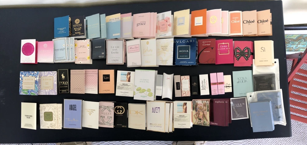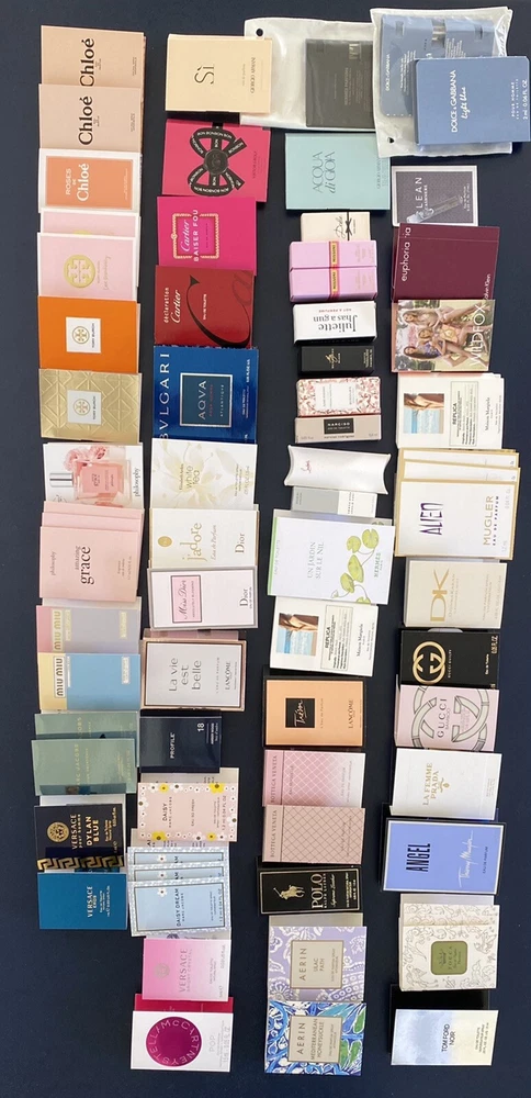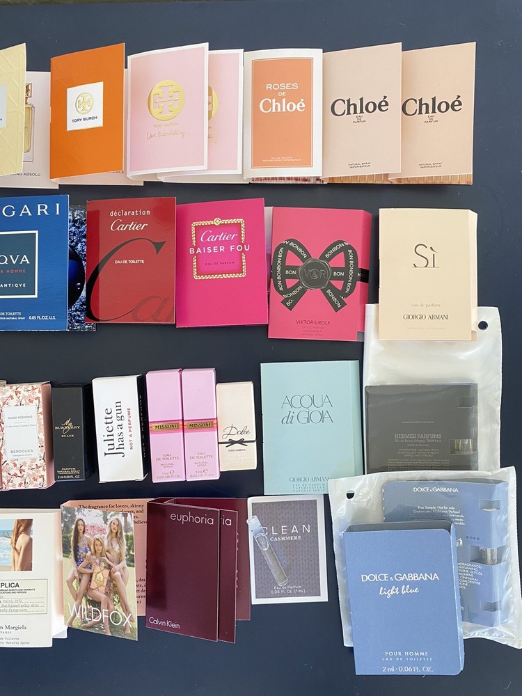 Perfume Samples Lot - 60 Items Dolce, Chloe, Dior, Versace, Gucci Polo Cartier. 70 are in photos but only 60 remain. 60 high end perfume tester & sample size Brand name All New 9 or 10 of the perfumes in the images are missing from the photos due to moving.