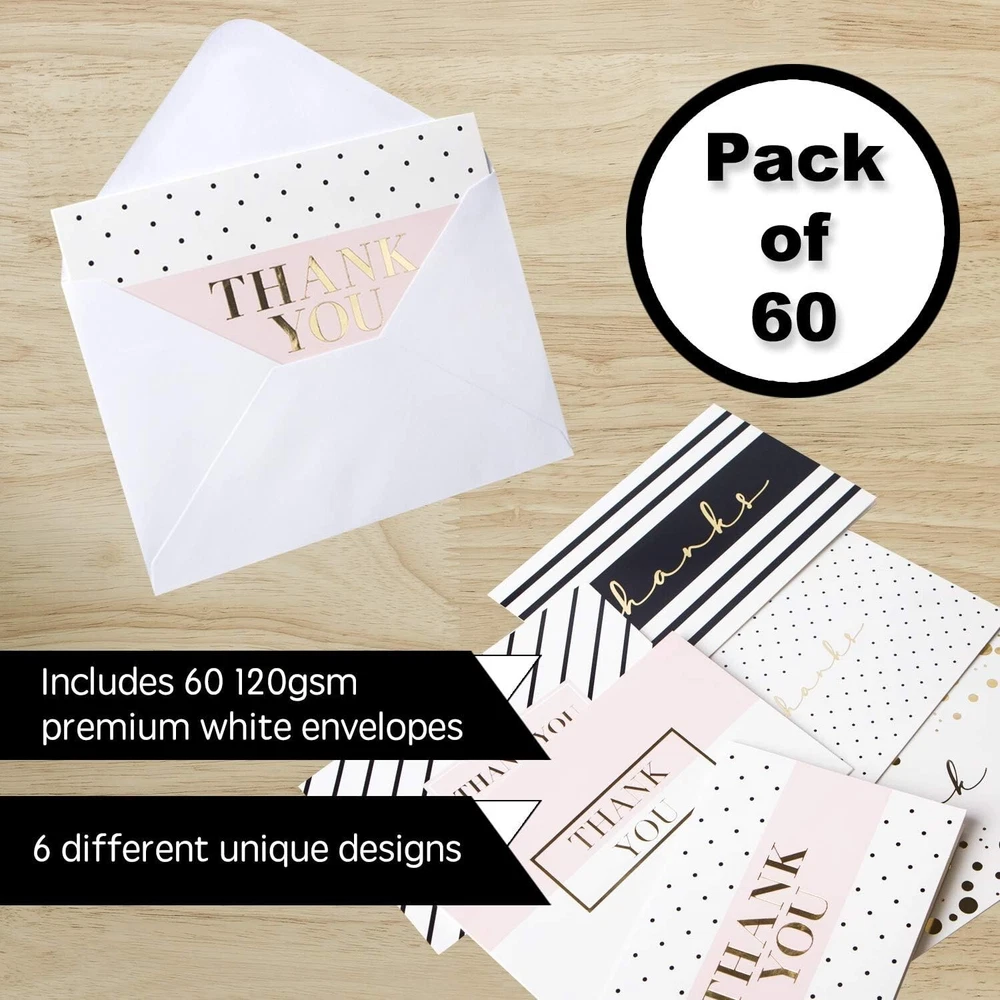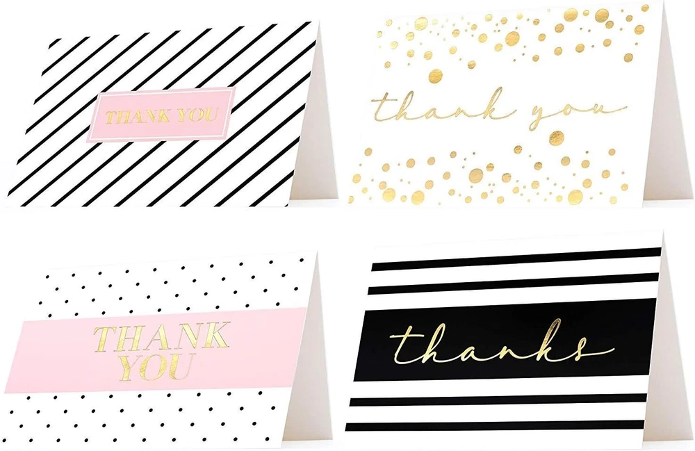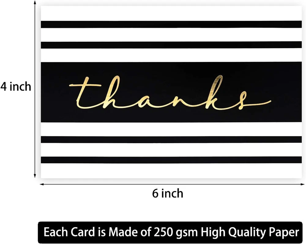 60 Gold Foil Thank You Cards- Elegant Thank You Cards - Thank You Greeting Cards Embossed In Fancy Gold Letters - Baby Shower, Bridal, Wedding Thank You Cards- Include 60 E nvelopes- 4 x 6 inches 6 Different Designs 60 Pack Gold Foil 4 x 6 thank you cards. Each card embossed with word ‘’Thank You’’ in Fancy Gold Foil Letters, with smooth matte finish creates an elegant and retro modern stylish look. Perfect for someone's special big day! ELEGANT & STYLISH - 60 Pack premium gold foil 4x6 thank you cards. Each card embossed with word ‘’Thank You’’ in Fancy Gold Foil Letters, with smooth matte finish creates an elegant and retro modern stylish look. Perfect for someone's special big day! PREMIUM QUALITY - Each card is made with high-quality 250 gsm paper card for extra durability. Each card professionally made in clear details and fancy fonts with no smudges. Each card evenly folded, each envelope flap use high quality glue with easy closing in few seconds BULK THANK YOU CARDS - 60 Pack of thank you cards with 60 Envelopes (price at less than .27 cents a card with an envelope, value pack bundle). CARD DIMENSION: Each card measures 4 x 6 inches, Each envelope measures 4.2 x 6.2 inches. Card color: WHITE BLANK THANK YOU CARDS - Simple and elegant one of a kind Gold Foiled thank you cards comes with blank on inside, plenty of room to write your thoughts and messages. Suitable for Wedding, Friendship, Teacher, Bridal, Business, Newborn, Anniversary, Baby Shower, Mother’s Day, Birthday, All occasions Thank You Card!
