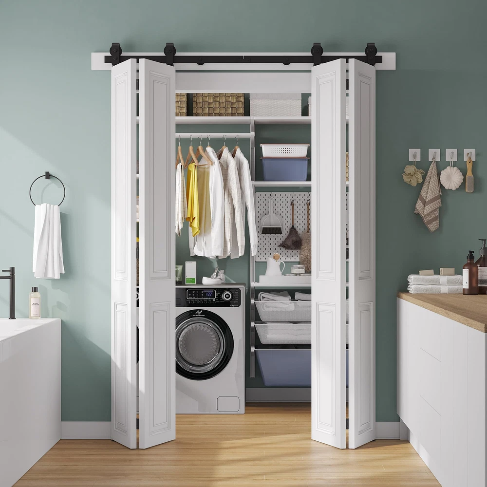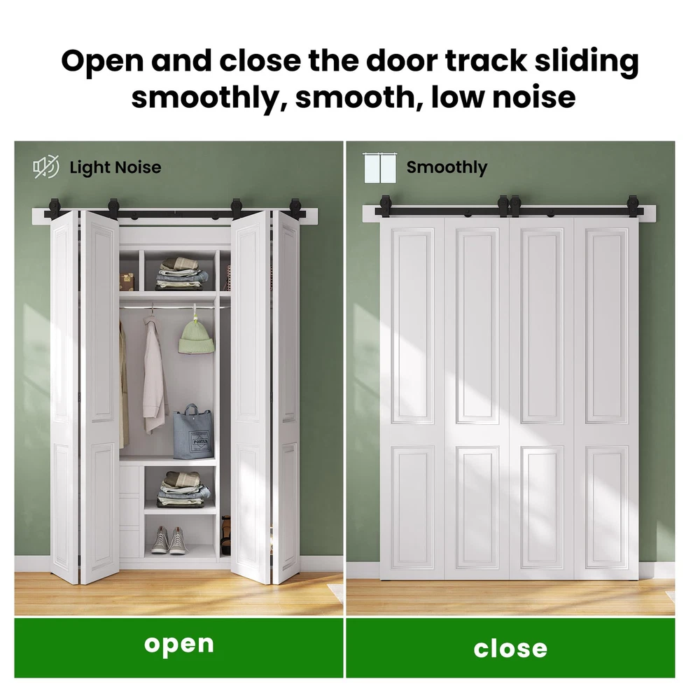Maximize Your Space: Our bi-folding barn door kit is perfect for limited spaces, requires just 6”-8” beside your door opening. Versatile use for multiple door types and suitable for various living spaces, including the laundry room, closet, study, and more. Exceptional Quality: Constructed from heavy-duty black steel, offering robustness, wear and corrosion resistance.The rollers and tracks are designed to minimize friction, making it effortless to open and close the door. Hassle-Free Installation: Comes with a user-friendly manual with sequential instructions. Whether you're a DIY enthusiast or prefer professional help, we're here to assist you online, ensuring a smooth setup process. Dimensions: Fit Door Thickness:1" ~ 1-3/4", Per Door width: Max 14"; Door weight capacity: 180lb.The track length should be door opening size + 4",at least 6" clearance needed from top of door and ceiling. Package Lists: 2x 2.5FT Rails, 4x Rail Spacers, 2x Fixed Roller, 2x Adjustable Roller, 2x Roller Lock Bracket, 2x Bottom Pivot Plate & Sleeve, 4x Top Connector Plates,6x Butt Hinges, 3x Hex Key. All other necessary hardware is included. (Note: Door not included).