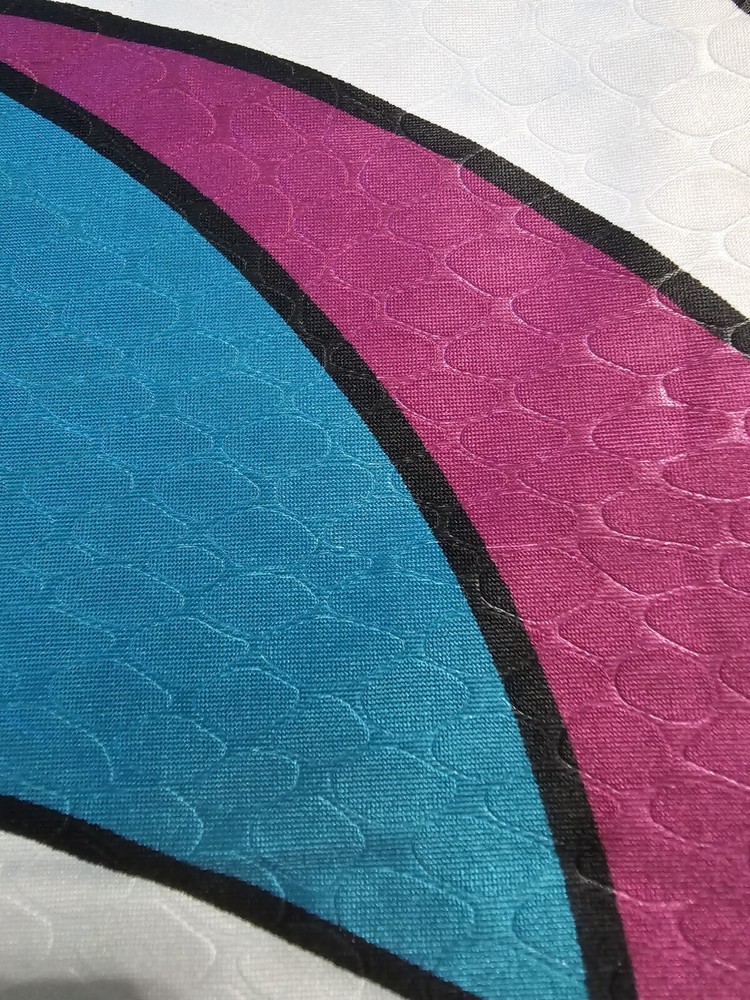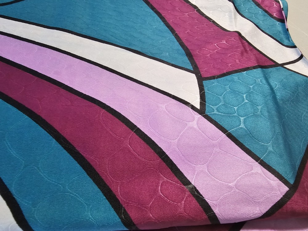 This fabric is absolutely stunning! The vibrant purple, teal, and white snakeskin pattern has a luxurious look, and the stretchy knit makes it perfect for swimwear or fitted apparel. It arrived exactly as described, with great quality and a soft feel. Super happy with my purchase—definitely ordering more!