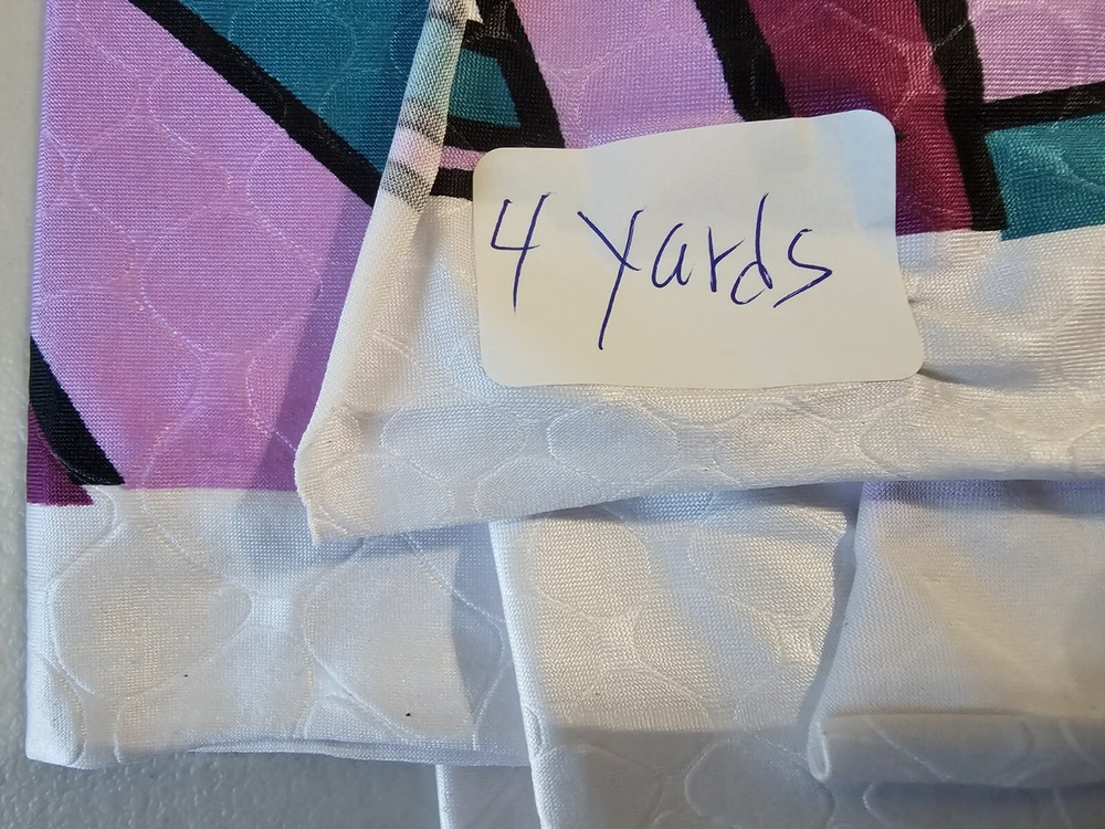 60" wide purple, teal, and white stretch knit fabric with a snakeskin background pattern. This had come from Michael Levine Inc. Los Angeles, CA. Uses include: apparel, activewear, and more. Sold by the yard. If you buy more than 1 yard, it will be cut in a continuous length. Returns accepted within 30 days in same condition as purchased. Buyer pays return shipping. Shipping USPS ground.