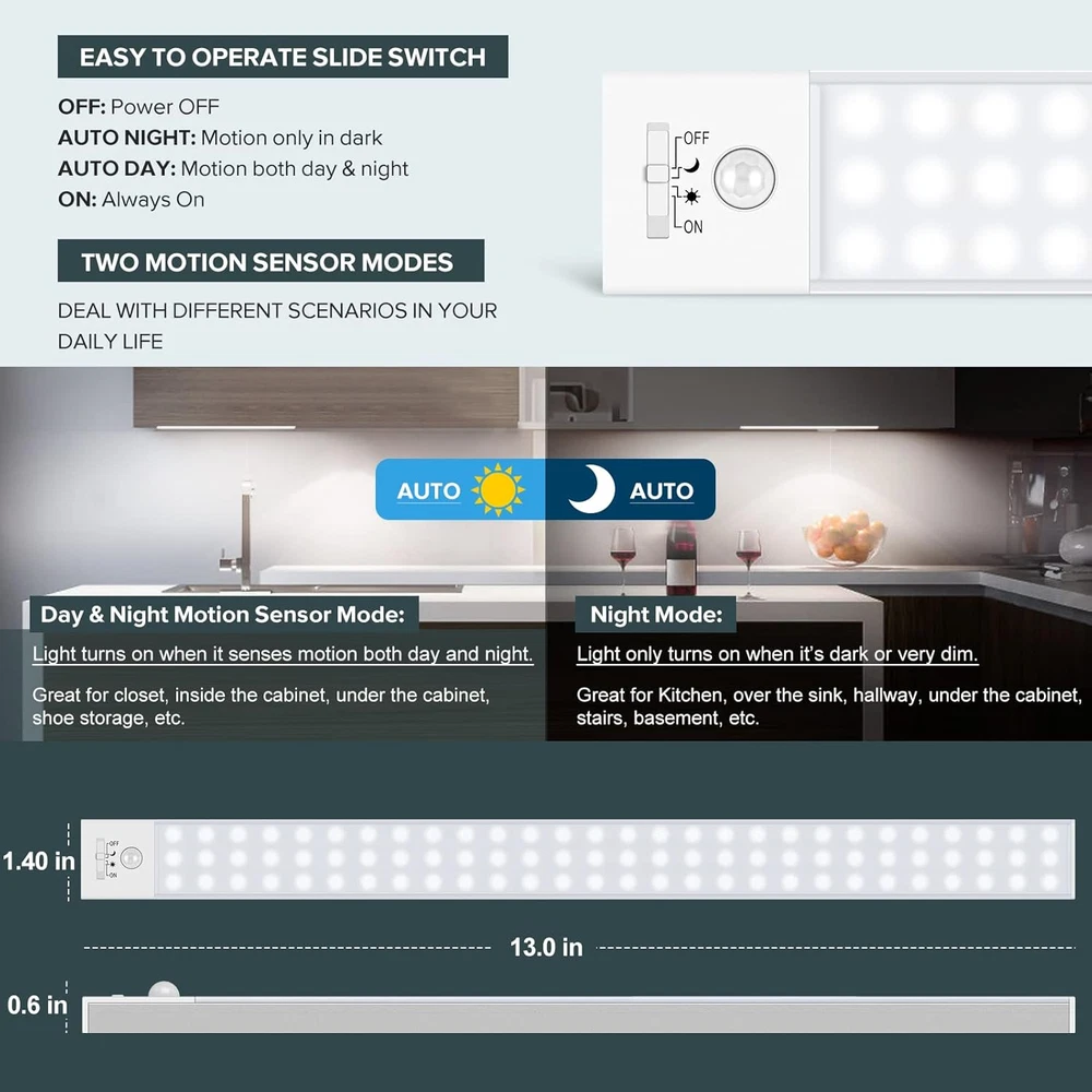 60 SUPER BRIGHT LEDS: Upgraded 60 Super Bright LEDs give out 200 Lumens of 6000K clean white light. LEDs emits no harmful rays and very little heat. Perfect for closet, cabinet, kitchen, stairs, wardrobe, attic, basement, cupboard, drawer, emergency supplies storage room, garage, mailbox, medicine cabinet, gun safe, storage unit, vanity mirror, etc. ULTRA LONG BATTERY RUN TIME: This BLS motion sensor light is equipped with 2400 mAh rechargeable battery. Each charge last up to 120 days (Use it 10 times a day, 20 seconds each time), 2 times battery run time of other similar battery LED lights! No need to purchase batteries, save you time, money and environmental friendly! RELIABLE MOTION SENSOR WITH 2 SENSOR MODES: ON/OFF/AUTO NIGHT/AUTO DAY & NIGHT, 4 modes slide switch. Sliding switch is simple and intuitive, easy to switch between 4 different modes. The two motion sensor modes are suitable for different scenarios in your daily life, motion sensor works every single time. BLS Constant-Sense technology allows it to constantly picks up motions, Stays on as long as you are nearby, and automatically turns off 20 seconds after you walk away. CORDLESS INSTALLATION: The BLS closet light has built-in strong magnet, installation takes a few seconds with the provided 3M Sticker. Easily attached to and detachable from the magnet plate for charging. Premium quality 3M adhesives stick firmly, will not damage your furniture. This LED light can be also be attached to any iron surface, eg. Refrigerator, shelf, storage rack, etc. No wires, tools, screws or nuts are required. WIDE APPLICATION: The stick on lights are ideal for closet, cabinet, kitchen, stairs, wardrobe, attic, basement, bedroom, dressing room, baby room, cupboard, drawer, emergency supplies storage room, garage, mailbox, medicine cabinet, gun safe, shoe storage, vanity mirror, laundry room, etc. Product Description Are you tired of indoor motion sensor light with iffy motion sensor? Are you tired of draining Alkaline batteries or keep charging your battery light every two days? Do you want a rechargeable motion sensor light with better battery life? The BLS T36-13" Ultra Thin Sensor Lights Indoor is created for you. It’s built with large rechargeable battery that provides excellent battery life and high quality 3M adhesives, reliable motion sensor, built-in magnets and more. ULTRA LONG BATTERY RUN TIME This battery operated light is equipped with 2400 mAh rechargeable battery. Each charge last up to 120 days (Use it 10 times a day, 20 seconds each time), 2 times battery run life of other similar LED lights! ) No need to purchase batteries, save you time and money! SMART MOTION SENSOR LIGHT WITH CONSTANT-SENSE The two motion sensor modes are suitable for different scenarios in your daily life: 1.AUTO DAY & NIGHT / Day & Night Motion Sensor Mode: Light turns on when it senses motion both day and night. Great for closet, inside the cabinet, under the cabinet, shoe storage, etc. 2.AUTO NIGHT / Night Motion Sensor Mode: Light only turns on when it’s dark or very dim. Great for Kitchen, over the sink, hallway, gun safe, under the cabinet, stairs, basement, etc. EASY TO INSTALL The light has built-in strong magnet, installation takes a few seconds with the provided 3M Sticker. Easily attached to and detachable from the magnet plate with 3M sticker. Premium quality 3M adhesives stick firmly, will not damage your furniture. This LED light can be also be attached to any iron surface, eg. Refrigerator, shelf, storage rack, etc. No wires, tools, screws or nuts are required. Different Applications: Suitable for different places, bring safety and convenience to you and your family! Under Cabinet Lights Specification: LED: 60 Rechargeable Battery 2400mAh Timer: 20 senconds with constant sense Package Includes: 1 x 60-LEDs motion sensor lights 1x Magnet Plates with 3M Adhesives 1 x USB charging cable 1 x Manual Closet Light Different Applications: Offer Extra Lighting for Anywhere in Your Home: closet, kitchen, sink, cabinet, gun safe, bedroom, wardrobe, workshop, kitchen cupboards, bookcase, shed, garage, hallway, stairway, laundry, drawers, steps etc. Sink Light Our Brand: At BLS, we strives to make the best Closet Light on earth. Bring safety and convenience to you and your family! We provides 100% satisfactory after-sales service and lifelong quality support for all BLS products! Purchase now and enjoy your low carbon life with us.