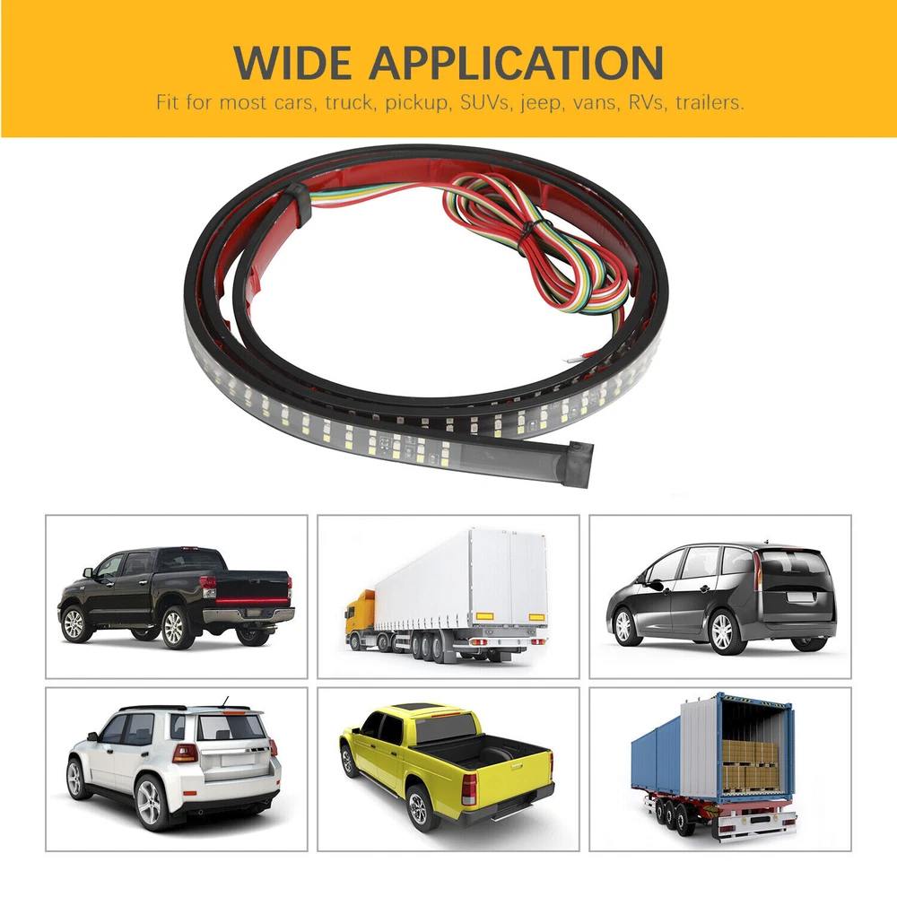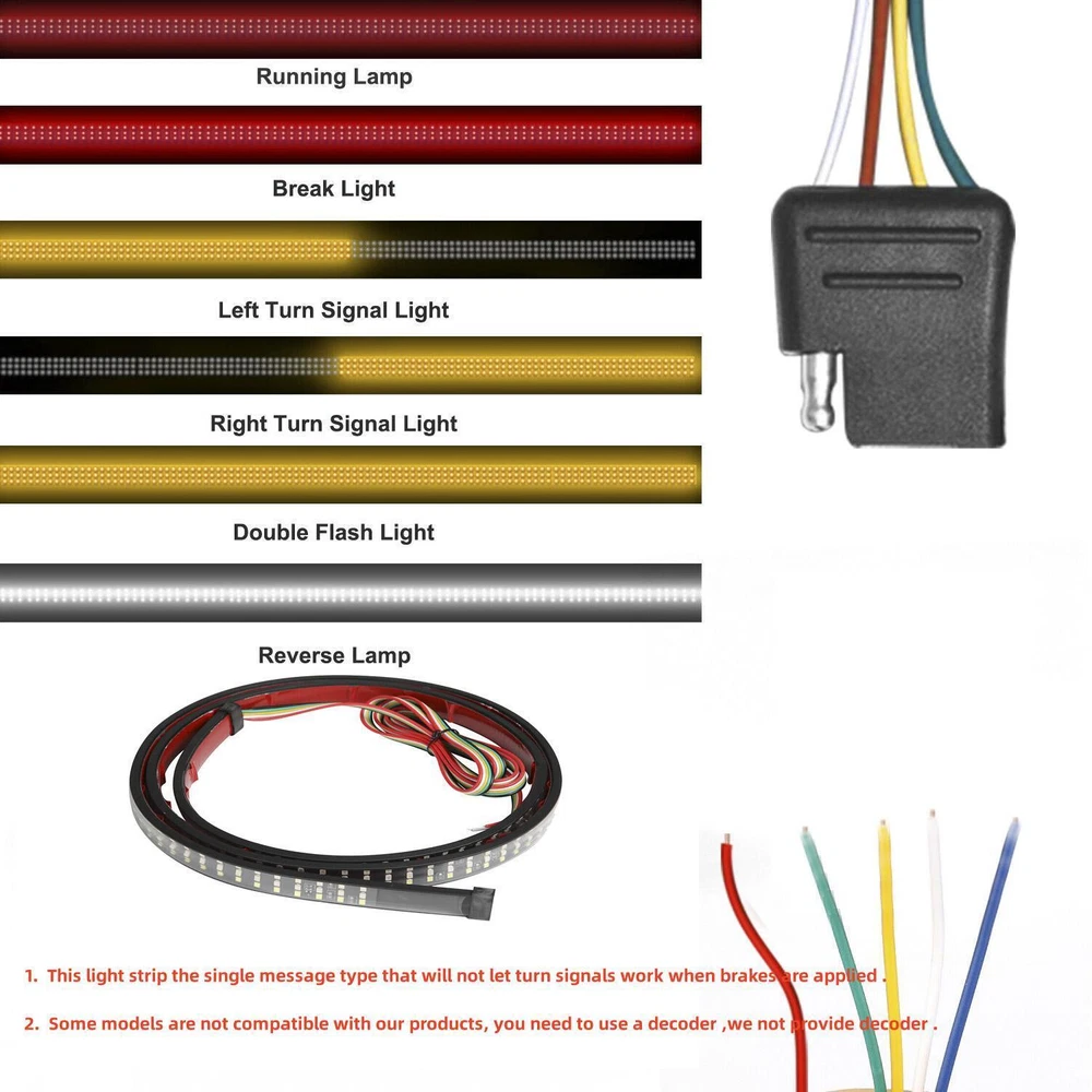 Store category Sign Up Now ! You may also like 60" LED STRIP TAILGATE LIGHT BAR REVERSE BRAKE SIGNAL FOR CHEVY FORD DODGE TRUCK Description : Brand New,100% high quality. Input voltage: DC12V LED power: 6W Strip light Length: 60 inch Strip light width : 0.63inch Waterproof: IP68 Material: SMD LEDs+Silicone Led quantity: 432pcs (144pcs Red SMD + 144pcs White SMD + 144pcs Amber SMD) Light Color: Red for DRL and Brake, White for Reverse Lights,Yellow for Flow Turn Signal and Double Flash . Note : 1. This light strip the single message type that will not let turn signals work when brakes are applied . 2. Some models are not compatible with our products, you need to use a decoder ,we not provide decoder . UPGRADED 6-Function : Running mode, all red LEDs light up(dipped beam) Brake mode, all Red LEDs light up(high beam) Reverse mode, all White LEDs light up Turn left mode, left Amber LEDs sequentially light up Turn right mode, right Amber LEDs sequentially light up Hazard Emergency Double Flash Mode:left & Right indicator sequentially flowing from center to both sides. Features: Plug into your trailer adapter , White wire must connect reversing light . Universal Fit for most truck, SUV, jeeps and RV. Can attach to any smooth surface by its double-side tape on the back. Flexible and easy to installation even can mounted to the rear window,party household decoration and so on. Long lifespan,over 50000 hours. Made by OEM approved & ISO certified manufacturers in materials that meet or exceed strict OEM requirements. Package included: 1 x LED strip tailgate light. Payment Delivery details return policy feedback Contact us Payment •We accepted PayPal payment ONLY. •If you don't have a PayPal account, it is very convenient to sign up and learn more about PayPal at Https//:www.paypal.com. •All payments must be completed within 7 days. •Items will be shipped within 24hs after getting your verified payment( except Weekend & Holiday). •Estimated delivery time is 2-4 working days. Shipping We will ship your order within 24 hours after receiving your verified payment (Excluding Weekends and Public Holidays) •The estimated delivery time is within 3-7 working days (not including the weekend). United States:2-5 working days (not including the weekend) Canada:5-7 working days (not including the weekend) •We ONLY ship to the confirmed address provided by PayPal. Before you pay, please make sure your address in PayPal matches the address you would like us to ship to. Terms of sales •All our products have 1 year warranty. •Return items must not be used or have any sign of abuse or intentional damage. •Buyer is responsible for all return shipping charges. •We reserve the right not to refund S&H when the item has been posted. About us •WElCOME TO MY STORE. •If you like our product,you can add us to favourite seller. •And if you want to see more products, you can visit. Contact us If the items lost\damaged in the shipping . We promises 100% refund or resend. On Jan 16, 2025 at 08:45:12 PST, seller added the following information: