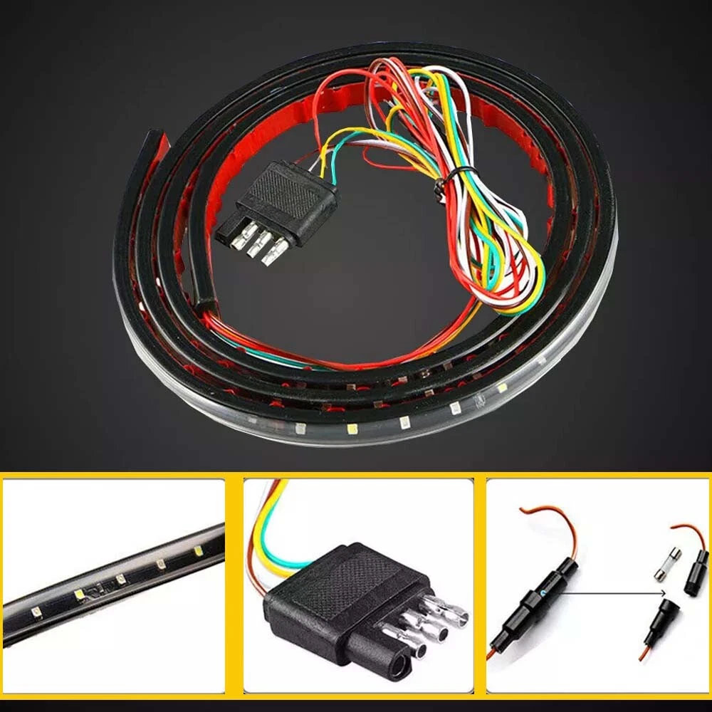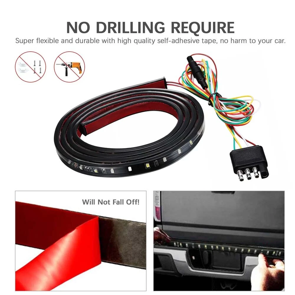 Fitment: for most Pickup,trucks, SUV, RV trailers for jeeps Led quantity: 108 LED ( 36 White / 72 Red ) Waterproof Rate: IP67 Housing Color: Black Type: Car Truck LED Strip Tailgate Light Bar Function: Reversing Lamp, Turn Signal Lamp and Work Lam Lighting Technology: LED Number of Bulbs: 1 Manufacturer Warranty: 1 Year Lens Color: Clear+Black UPC: Does not apply Package include: 1x 60" inch 150cm LED strip tailgate light Placement on Vehicle: Rear Features: DOT-Certified, OE-Certified, Red for turn signal and parking and brake, The standard 4-pin flat plug and self-adhesive tape, white for reverse lights Voltage: 12 V Light Color: Red+White Manufacturer Part Number: Does not apply gtin13: Does not apply Brand: Unbranded Length: 60inch/60" Wattage: 6 W Material: Soft Rubber, plastic Universal Fitment: Yes