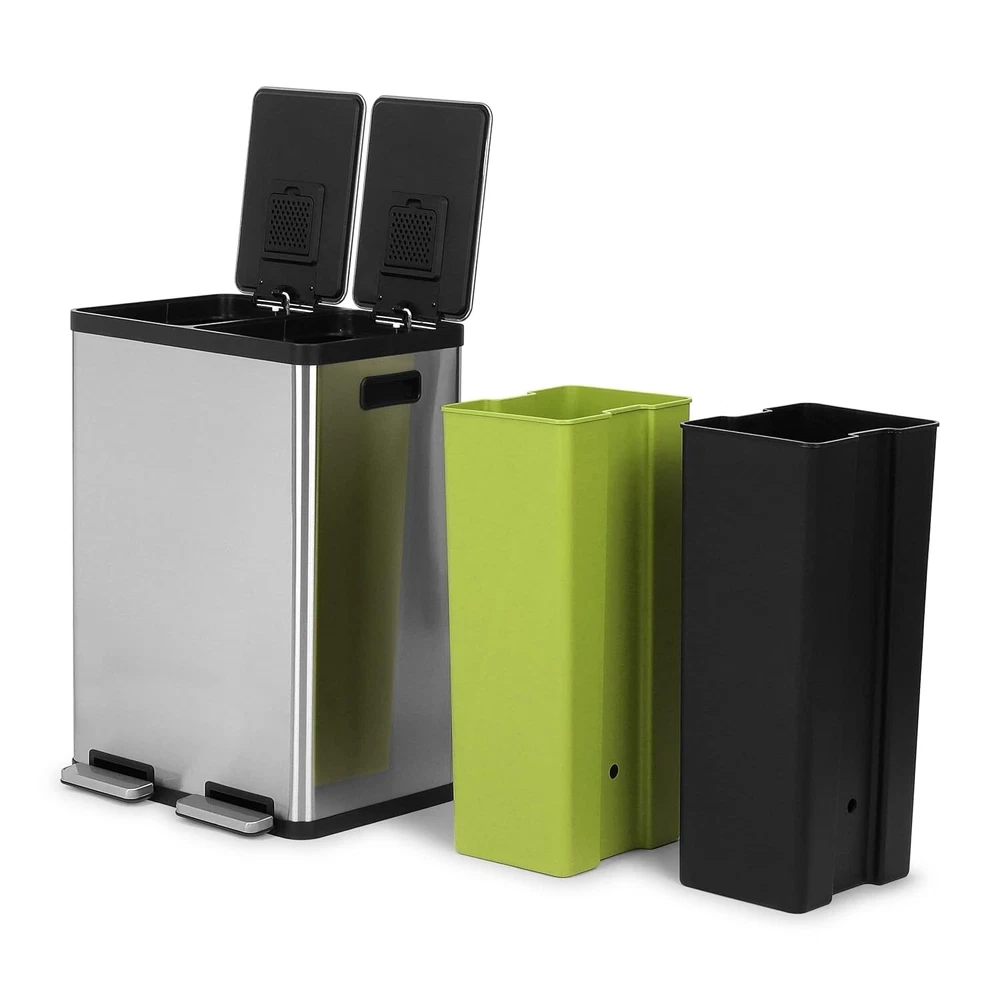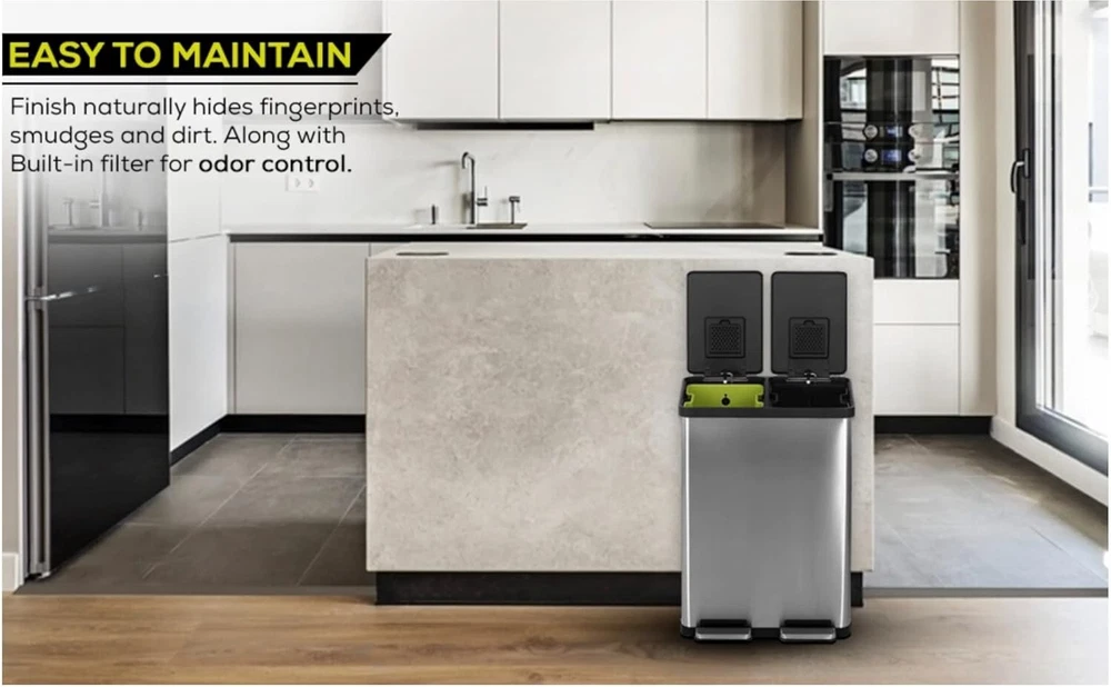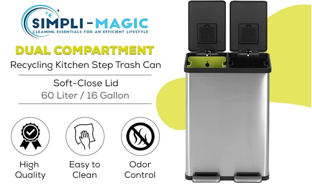 60 Liter / 16 Gallon Rectangular Hands-Free Dual Compartment Recycling Kitchen Step Trash Can with Soft-Close Lid, Brushed Stainless Steel HIGH CAPACITY WASTE AND RECYCLING SOLUTION: Color coded liners in Green (30L) and Black (30L) allow for easy sortation of waste and recycling, without sacrificing waste capacity, and fit standard liners using bag cinch. HANDS-FREE USE: The stainless-steel foot pedal stands up to daily use and removes the need to touch the lid during waste or recycling disposal to keep hands clean. SLOW CLOSE LID: Quiet, controlled lid closure is designed to reduce unwanted noise and ease down LOCK: Extended open lid lock keeps the container open for longer tasks and chores. BUILT IN FILTER FOR ODOR CONTROL. EASY TO MAINTAIN: Finish naturally hides fingerprints, smudges and dirt. 60 Liter / 16 Gallon Rectangular Hands-Free Dual Compartment Recycling Kitchen Step Trash Can with Soft-Close Lid, Brushed Stainless Steel