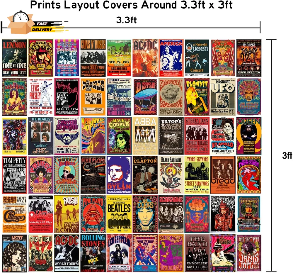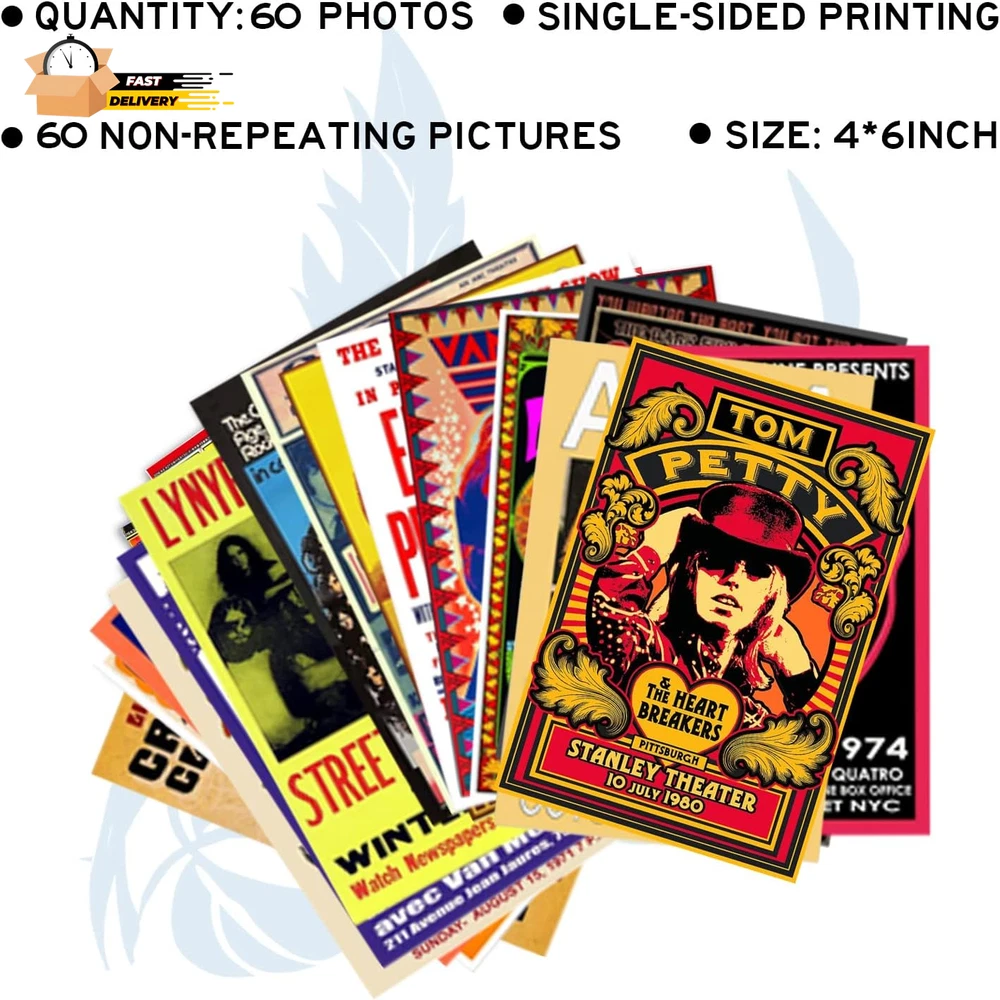 Finish Type: Semi-gloss Cover Material: Cardstock Type: Does not apply Paper Finish: Semi-Gloss Package Type: FFP Recommended Uses For Product: Bedroom wall decor Unit Count: 60.0 Count Number Of Panels: 60 Number of Items: 60 Item Shape: Rectangular Color Family: Vintage Paint Type: Watercolor Brand: Does not apply Special Features: Retro Concert Prints Orientation: Landscape Item Weight: 8.11 ounces Wall Art Form: Poster Pattern: Printed Indoor Outdoor Usage: Indoor Size: 60 SET, 4X6 INCH Material: Paper Frame Type: Unframed Mounting Type: Wall Mount Color: Vintage Band Concert Posters Theme: Rock band, Music Item Dimensions L x W: 36"L x 36"W Room Type: Bedroom Style: Retro Age Range Description: Teen Frame Material: Unframed