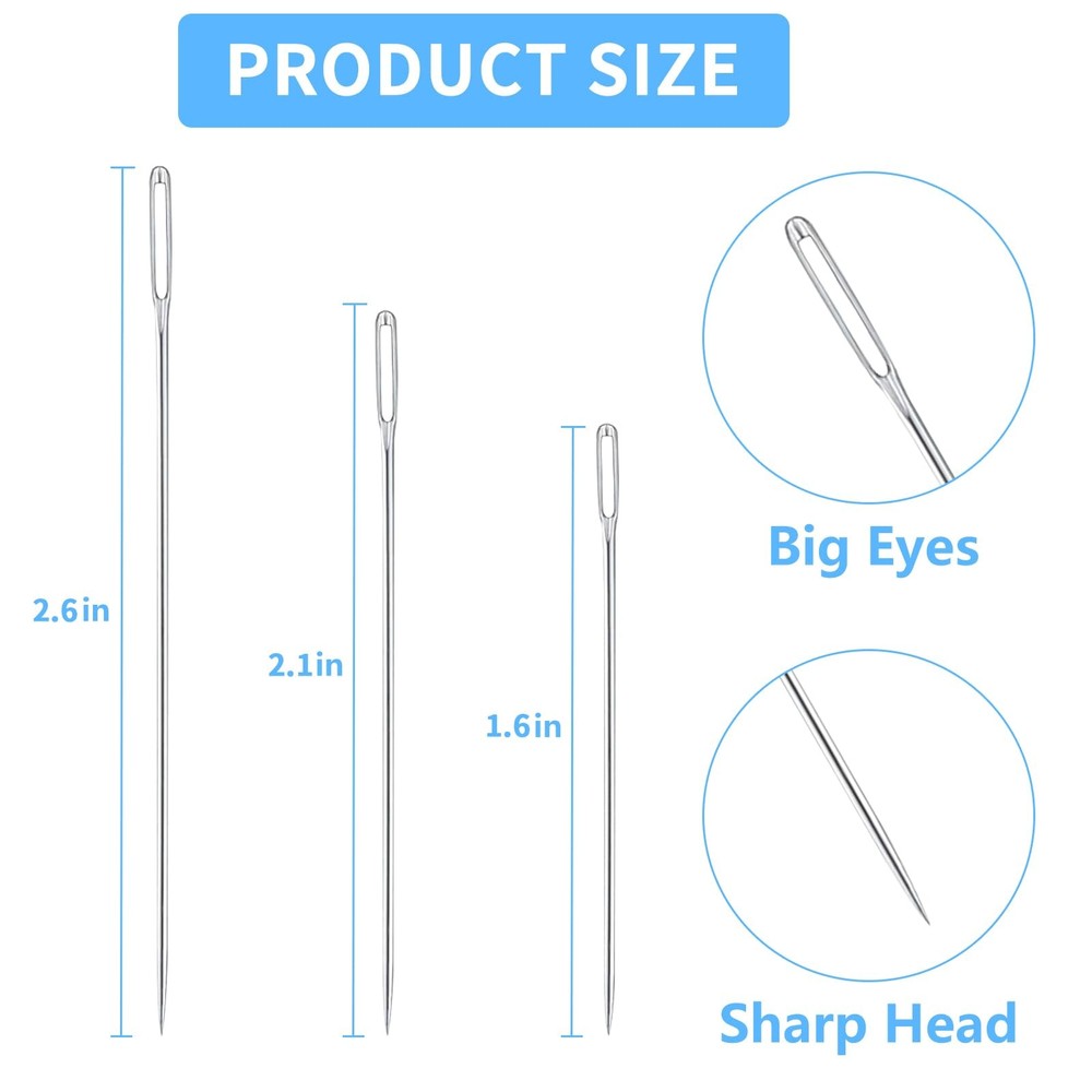 60 PCS Large Eye Hand Sewing Needles Set - 3 Sizes Leather Embroidery Thread Needles, Stainless Steel Hand Quilting Needles with Threader - Ideal for Hand Sewing, Art, and Crafts 【Safe and Durable Materials】Upgrade your sewing experience with our premium stainless steel large eye pointed stitching needles. These needles offer sharp tips, a smooth surface, and exceptional durability. They are designed not to bend easily, and are resistant to rust and corrosion, ensuring long-lasting use. The small resistance through cloth and leather makes them effortless to use. 【Versatile Sizes】Our set includes 60 large eye sewing needles in three different sizes: 20pcs x 2.6 inch/67mm, 20pcs x 2.1 inch/54mm, and 20pcs x 1.6inch/42mm. With these various sizes, you can choose the perfect for your project, ensuring precision and efficiency in your sewing tasks. 【Wide Range of Applications】From handsewing and crafting to repairing carpets, upholstery, coats, tents, canvas, mattresses, embroideries, furs, leather, and more, these sewing needles are invaluable tools for all your sewing needs. Versatile and reliable, they will help you complete your projects with ease and precision. 【Effortless Usage and Portability】Each pack includes 2 bottles with a total of 30 pieces of sewing needles, neatly organized in tubes for convenient storage and easy access. Their compact and lightweight design makes them portable, allowing you to carry them wherever you go without taking up much space in your bag. Perfect for on-the-go use, these large eye needles are essential for all your sewing endeavors. 【Satisfaction Service】: We are confident in the quality of our sewing needles and offer satisfaction service. If you are not completely happy with your purchase, please reach out to us for a refund or replacement. 60 PCS Large Eye Hand Sewing Needles Set - 3 Sizes Leather Embroidery Thread Needles, Stainless Steel Hand Quilting Needles with Threader - Ideal for Hand Sewing, Art, and Crafts 【Safe and Durable Materials】Enhance your sewing game with our high-quality stainless steel large eye needles. These needles are sharp, smooth, and built to last. They won't bend easily, and they're resistant to rust and corrosion, ensuring they'll stand the test of time. The low resistance through fabric and leather makes them a breeze to use. 【Versatile Sizes】Our set includes 60 large eye sewing needles in three different sizes: 20pcs x 2.6 inch/67mm, 20pcs x 2.1 inch/54mm, and 20pcs x 1.6inch/42mm. With these various sizes, you can choose the perfect for your project, ensuring precision and efficiency in your sewing tasks. 【Wide Range of Applications】From handsewing and crafting to repairing carpets, upholstery, coats, tents, canvas, mattresses, embroideries, furs, leather, and more, these sewing needles are invaluable tools for all your sewing needs. Versatile and reliable, they will help you complete your projects with ease and precision. 【Effortless Usage and Portability】Each pack includes 2 bottles with a total of 30 pieces of sewing needles, neatly organized in tubes for convenient storage and easy access. Their compact and lightweight design makes them portable, allowing you to carry them wherever you go without taking up much space in your bag. Perfect for on-the-go use, these large eye needles are essential for all your sewing endeavors. 【Satisfaction Service】: We are confident in the quality of our sewing needles and offer satisfaction service. If you are not completely happy with your purchase, please reach out to us for a refund or replacement. Shipping We offer FREE shipping on all orders! We ship within Three business days of payment, usually sooner. We use a selection of shipping services such as UPS, FedEx, USPS etc. We only ship to the lower 48 states, no APO/FPO addresses or PO Boxes allowed. Local pickups and combined shipping options are not provided at this time. Return You can return a product for up to 30 days from the date you purchased it. Any product you return must be in the same condition you received it and in the original packaging. Please keep the receipt. Payment We accept payment by any of the following methods: PayPal Please pay as soon as possible after winning an auction, as that will allow us to post your item to you sooner! Feedback Customer satisfaction is very important to us. If you have any problem with your order, please contact us and we will do our best to make you satisfied. Contact Us If you have any queries, please contact us via ebay. We usually respond within 24 hours on weekdays. Please visit our eBay store to check out other items for sale! Thank you for shopping at our store.