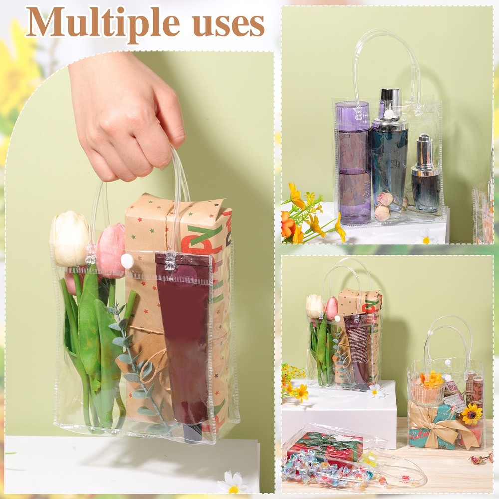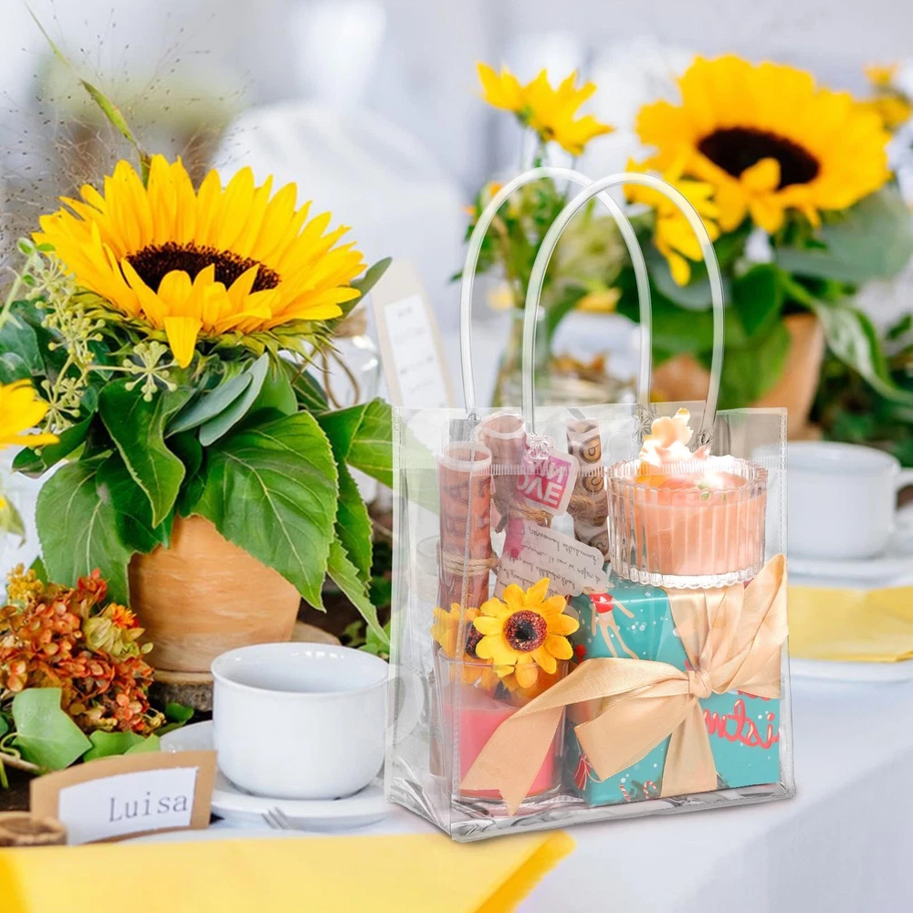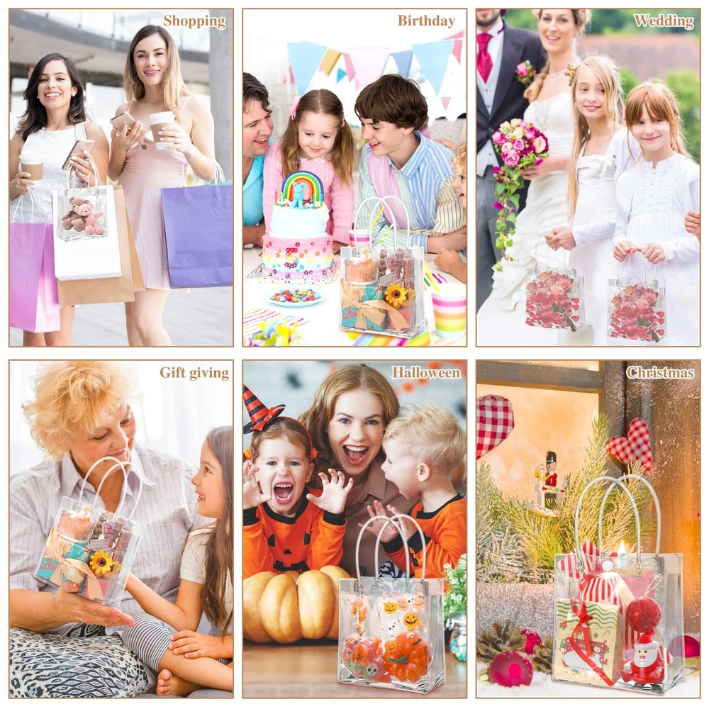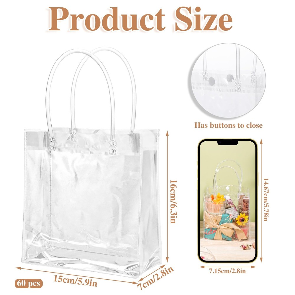 b>Specifications Material: PVC Color: Clear Size: 6.3"*5.9"*2.8" / 16 x 15 x 7 cm Features: 1. The package contains 60 clear gift bags, enough quantity can meet your multiple demands. 2. Clear bags for party favor are made of high quality PVC plastic material, which is waterproof, sturdy and reusable. 3. Small gift bags can hold candy, snacks, retail goods, gifts, etc. Suitable for weddings, birthday, baby showers, Halloween, Christmas,Valentine's Day etc. Package Include: 60 pack plastic gift bags with handles 【Small Size】Package comes with 60 pack clear plastic gift bags, the small clear bags is 6.3" x 5.9" x 2.8" / 16 x 15 x 7 cm, cute and easy to carry. Please CHECK the SIZE before buying ! 【Bulk Gift Bags】Clear gift bags can pack candy, treats, perfume, flowers and other gifts, suitable for weddings, birthday, baby showers, Christmas, merchandise boutique and schools. LARGE QUANTITY to meet your needs! 【Create Your Own】The mini Christmas gift bag for favors not only allows you to display delicate personal items or gifts, but also can be matched with ribbons, stickers, cards to create your own cute gift bag! 【Practical Design】Each gift bag comes with handles and snaps for easy portability. The bottom of the PVC clear gift bag is square, easy to stand. If there are wrinkles, you can tidy it up and press it with a heavy object for a while. 【Reusable】Clear party favor bags are made of PVC plastic material, which is waterproof, sturdy, reusable, and has better load-bearing capacity. The transparent appearance is cute, durable and easy to clean.