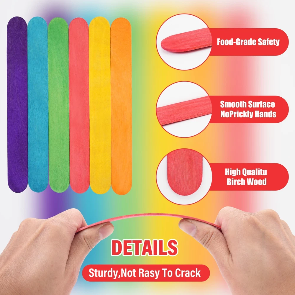 【Popsicle Sticks Bulk】60 pcs natural premium jumbo colorful craft sticks with a length of 8 inches and a width of 0.94 inches. The size is large enough to make craft sticks jumbo easier for you to make your favorite crafts and DIY craft projects. 【High Quality Material】The colored popsicle sticks for crafts are made of high-quality natural wood, with smooth circular edges and flat surfaces that are not only easy to decorate and make handicrafts, but also do not harm children's skin, ensuring their safety when making craft projects. 【Multifunctional colorful popsicle sticks】colored sticks in jumbo size have a wide range of uses and are very suitable for handicrafts, toy boxes, wooden houses, wooden pen boxes, home decoration projects and school activities. These wood craft sticks are very suitable for collective activities with children, and the rainbow ice cream sticks will be an excellent auxiliary tool for cultivating children's creativity and promoting teacher teaching. 【Other Uses】You can use these large popsicle sticks as plant labels to help you better manage your garden. You can also use it as wooden stir sticks for epoxy and Library Markers that can can help you find and return books in their corresponding locations faster, and better manage and classify books. 【6 Different Colors wood sticks】Including yellow, green, purple, blue, red, and orange, provide you with multiple choices. You can mix and match them to find your inspiration and design your own Colorful wooden sticks model manipulative.
