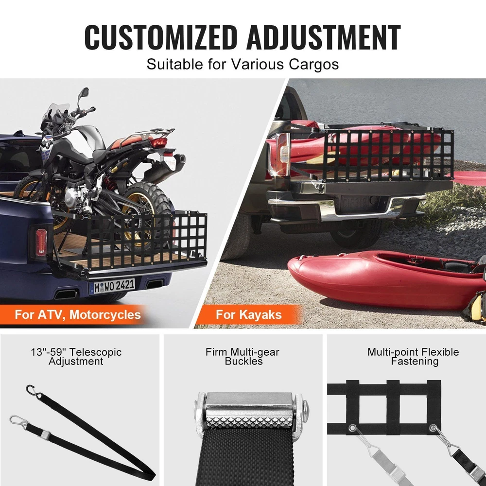 60" x 18" Tailgate Net for Moving & Transportation tailgate net has a load bearing capacity of up to 600 lbs, 60" x 18" is more suitable for full-size trucks. Moreover, our tailgate net is also suitable for securing a variety of extra-long and heavy-duty cargos, which makes the transportation of cargos is more secure. Made of heavy-duty industrial-reinforced PP material, our tailgate net is wear-resistant and weather-proof, and the extra-wide nylon edge design avoids wearing and tearing caused by stretching, which can accompany you for a longer period of time. Our tailgate net is suitable for trucks, SUVs, pickups, jeeps and trailers, etc. The mesh design accelerates air flow, which reduces drag and improves fuel efficiency. Each telescopic strap comes with a carabiner and S-hook, easy to install and disassemble without tools. Note: Tailgate net requires fixed anchors or bolts to be used. Our tailgate net equipped with 4 adjustable telescopic straps up to 59" long and 14 metal fixing grommets. You can secure different sizes and shapes of items according to your needs, expanding the capacity of your vehicle's boot.