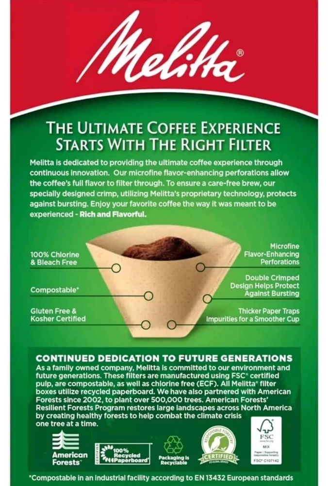 CONE COFFEE FILTERS: These super premium Melitta cone coffee filters fit all 2-6 cup electric – as well as most 1 cup cone-style pour-over coffee makers. Our filters trap more bitter oils & impurities for a better cup of coffee. ADVANCED DESIGN: Our coffee filters feature Microfine Flavor Enhancing perforations that allow the full coffee flavor to filter through & a double crimped filter design to help protect against bursting. QUALITY FILTERS: Our cone, basket and single serve filters are all designed to brew rich, flavorful coffee. They are all compostable & made of high quality paper that won't tear for mess-free brewing. PERFECT BREWING: Our products are designed to provide the perfect brewing experience with a complete selection of cone coffee filters, pour-over coffee filters, basket coffee filters, single serve coffee filters & tea filters. JOIN THE PURSUIT FOR BETTER COFFEE: Melitta is dedicated to providing the ultimate coffee experience with our premium coffee filters, coffee pods, pour-over brewers, coffee makers & premium coffees.