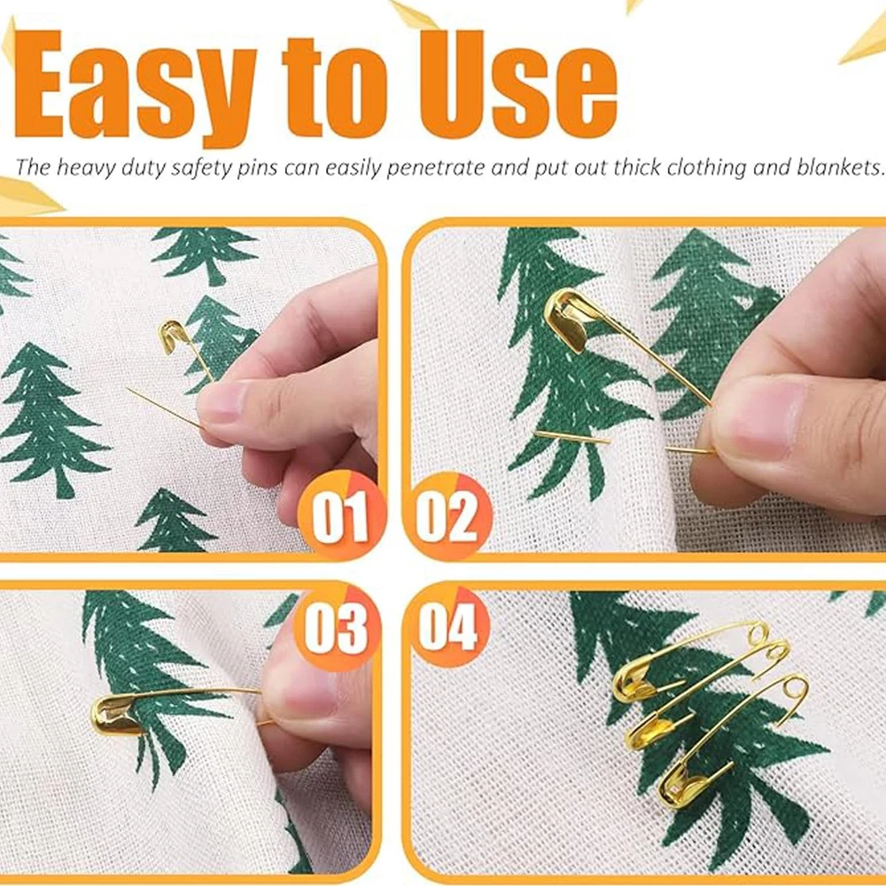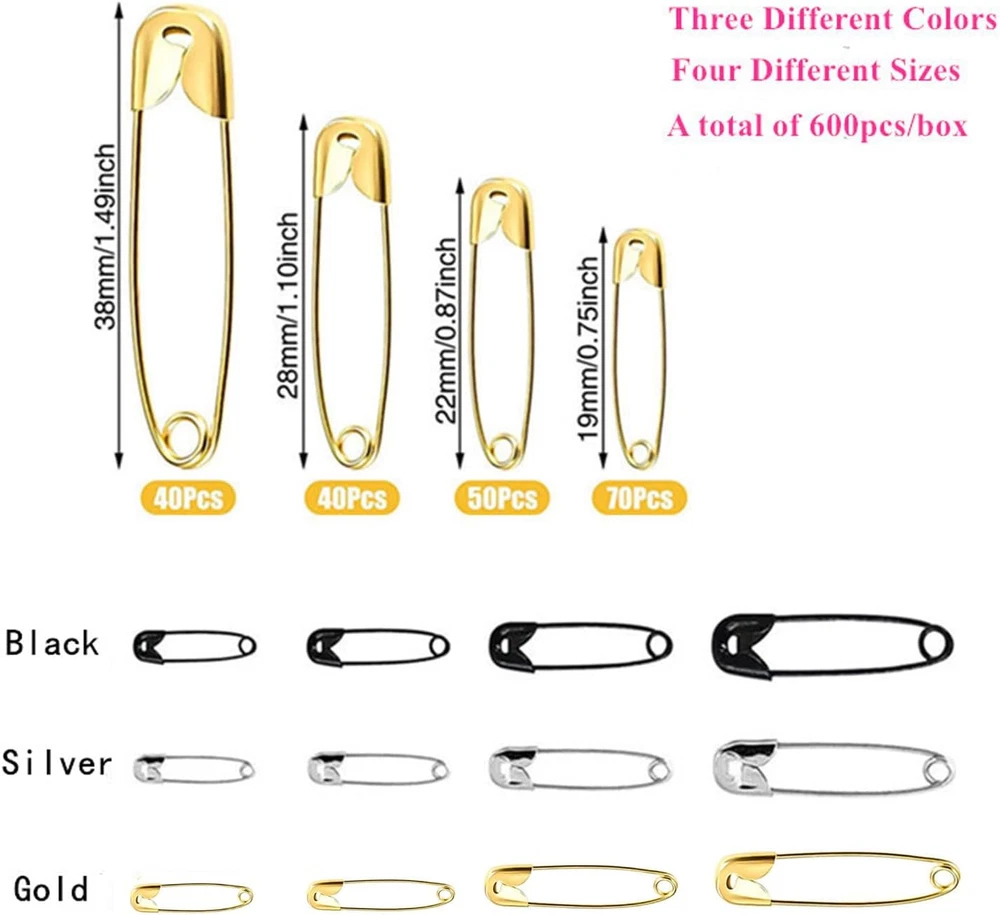 【Great value sets】The package includes 600 Pcs safety pins for all your needs. 3 colors: gold, sliver and black. Each color safety pins come in 200 pcs. Divided into 4 sizes - 19mm(0.75 in), 22mm(0.87 in), 28mm(1.1 in), 38mm(1.49 in). You will be sure to have the right size available, no matter what you need it for. 【Durable Material】The safety pins are made of anti-rust nickel plated steel. They are durable, well manufactured and less prone to bending, rusting and corrosion. Stable and durable safety pins can meet your daily usage needs. 【Easy to Storage and Use】The safety pins are classified and placed in a transparent box. You can pick up the safety pins of various colors and sizes according to your needs in different compartments of the box, without any effort to find them, which is convenient and fast. 【Safety Setting]】The tip of the safety pin is covered when locked, which can protect your fingers from the impact of accidents. Warm tip: This is a sharp product and should be kept away from children. 【Wide Application】Our safety pins comes in a variety of colors and sizes to meet your diverse needs, making them suitable for handmade, clothing, sewing, jewelry making, clothing fixation, DIY crafts, etc. Product Information Product Name: Safety Pin Kit Material: Alloy Size: 19mm, 22mm, 28mm, 38mm Color: Gold, Silver, Black Quantity: 600Pieces Package Includes: 19mm - 70 Each for Silver,Black and Gold 22mm - 50 Each for Silver,Black and Gold 28mm - 40 Each for Silver,Black and Gold 38mm - 40 Each for Silver,Black and Gold Features: The safety pins are made of high quality alloy material, which is sturdy and durable for long-term use. These 600 pcs safety pins come with a convenient storage box, easy to find, carry and use. Different safety pins have 4 different sizes, 3 colors, 600 pieces in total, enough for your daily needs. Suitable for craft projects, jewelry, dressmaking, sewing and more. The safety pins have sharp points, keep them away from children under 6 years old Warm Tips Due to differences between different displays, there may be a slight color difference. If you have any questions about how to use the safety pins for clothes, please feel free to contact us, we will answer your questions as soon as possible.
