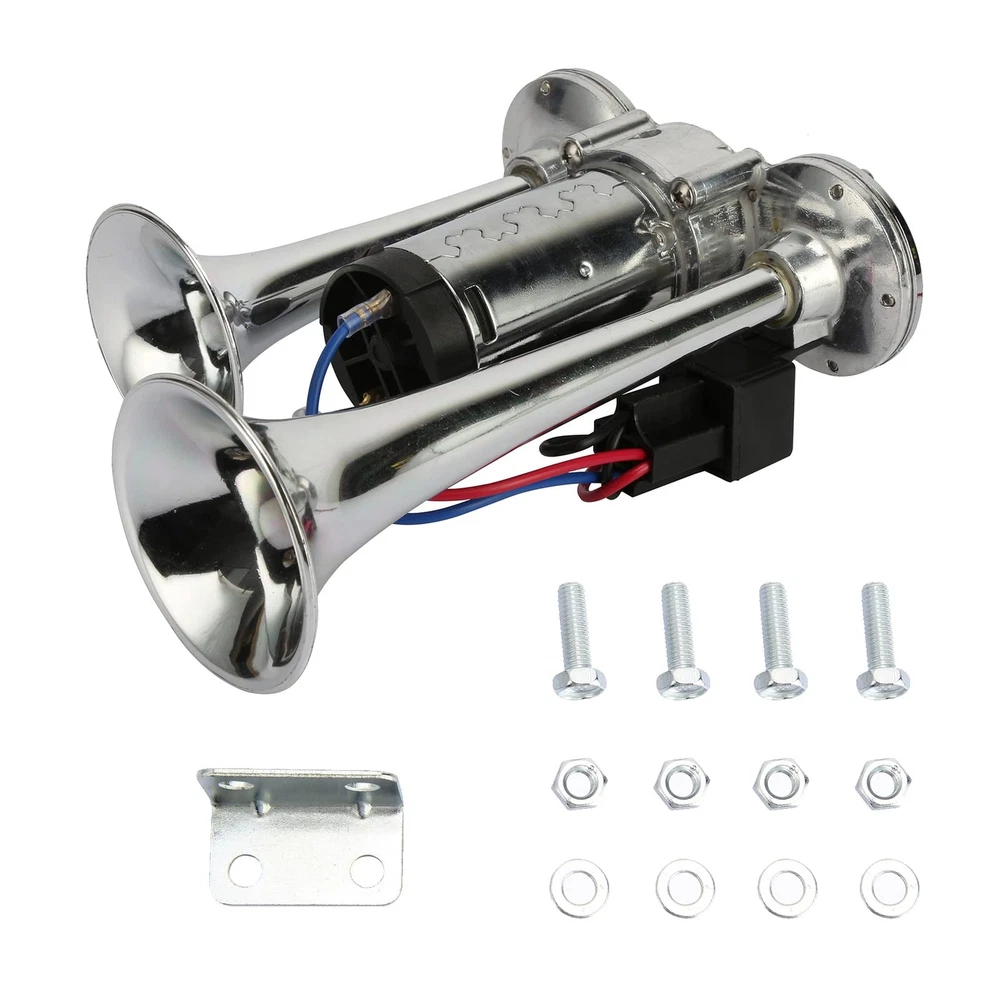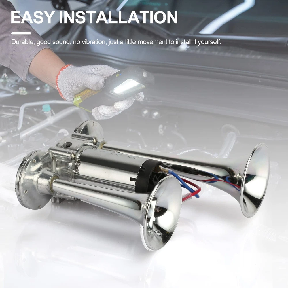About this item [Materials of Air Horn]: Our air horn is made of excellent chrome-plated zinc and high-quality ABS plastic, which is waterproof, wear-resistant and corrosion-resistant, so you can still use the air horn without worry even on rainy days. The purpose of our products is to let you use them for a long time, so you don't need to worry about its quality. [Easy to Install]: Our train horn kit is very easy to install. You just need to connect the horn wire on the car and the two wires from the air horn, and it will work normally Positive to positive, negative to negative(The installation instructions for the product are attached to our products, and you can install them by checking the instructions). [600DB Super loud]: The upgraded air compressor and larger coil can be made into stronger air pressure, which promotes louder and clearer sound from the horn [Widely used]: The air horn is suitable for all 12V vehicles, Can be used for SUV, motorcycle, yacht, boat, off-road vehicle, bus, train, etc.....