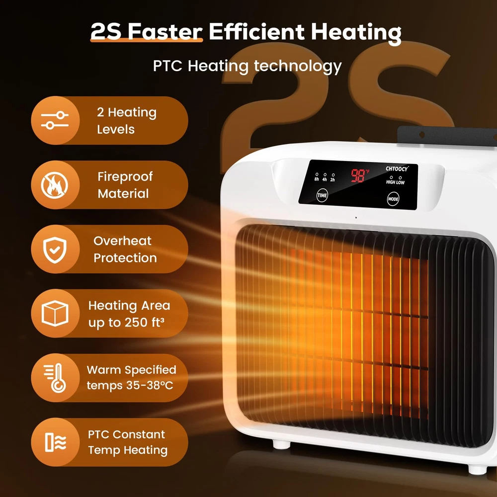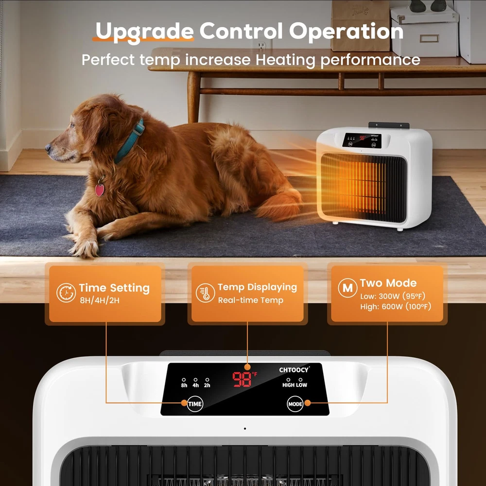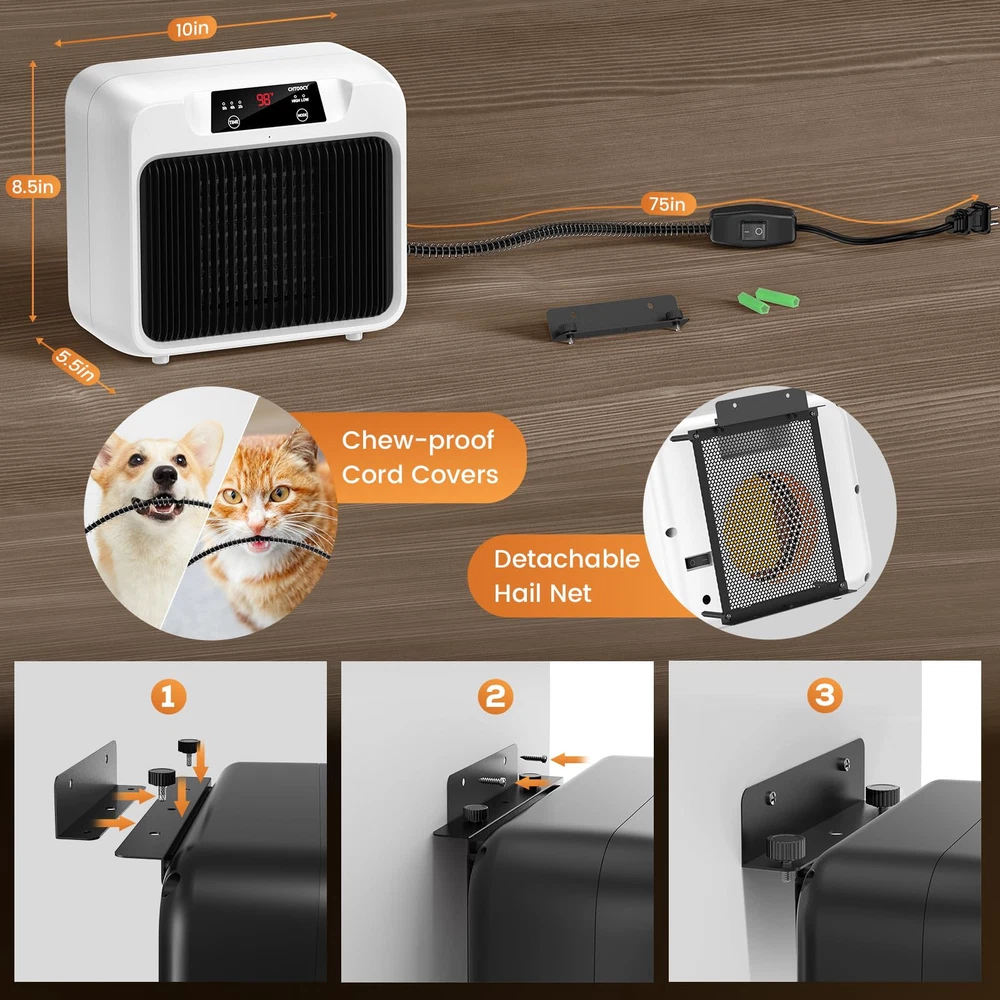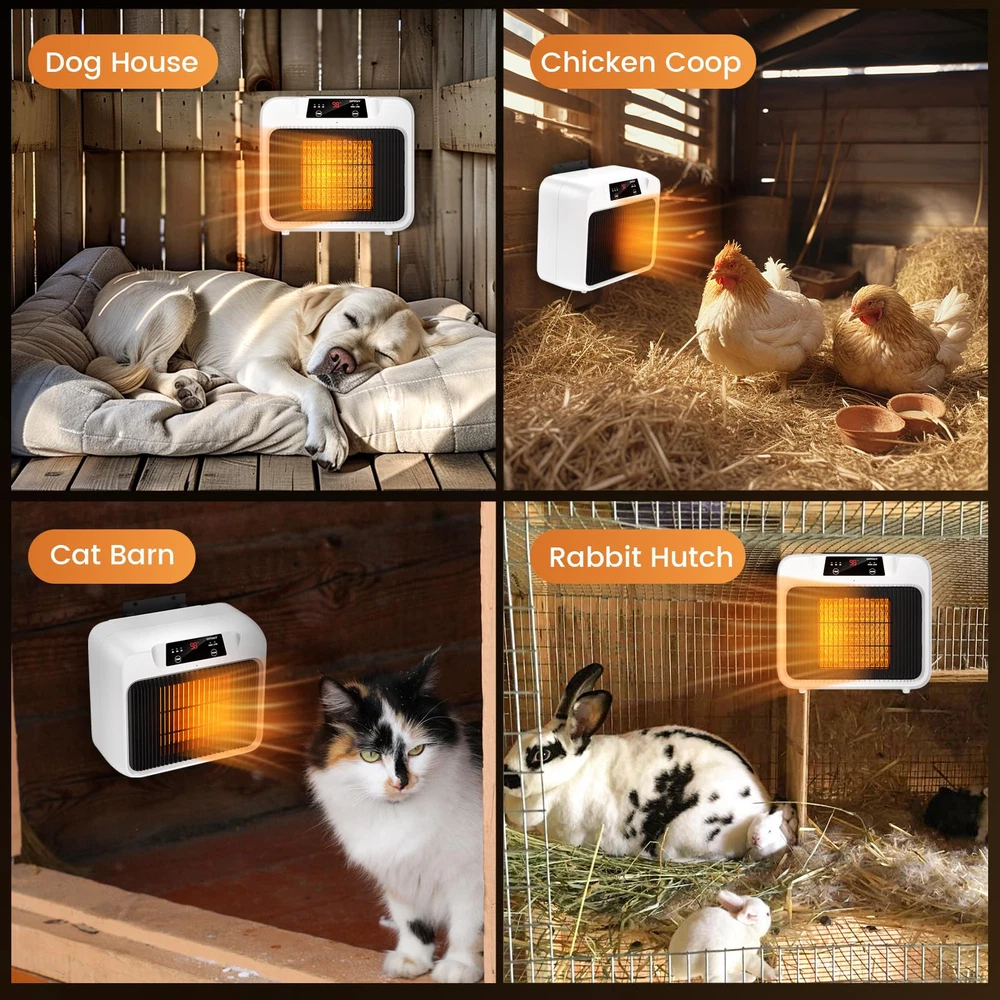 ๐Ÿ‘๐ฌ ๐…๐š๐ฌ๐ญ ๐‡๐ž๐š๐ญ๐ข๐ง๐  ๐Ÿ๐จ๐ซ ๐๐ž๐ญ ๐‡๐ž๐š๐ญ๐ž๐ซ: The outdoor dog house heater features a 600W PTC heating system that quickly raises the temperature in just 3 seconds.A safe&powerful dog heater with built-in fan circulates hot air to heat up to 150 ftยณ of pet house outdoor kennel. Using the low (300W) or high (600W) heating levels, you can switch the heat level depending on how cold it is outside. ๐€๐๐ฏ๐š๐ง๐œ๐ž๐ ๐“๐ข๐ฆ๐ž ๐’๐ž๐ญ๐ญ๐ข๐ง๐  ๐‚๐จ๐ง๐ญ๐ซ๐จ๐ฅ: With a 2 4 8 H time button and an easy-to-read LED screen, itโ€™s simple to maintain a comfortable environment for pets.Our heaters are effective for outdoor pet houses, chicken coops, rabbit hutches, as well as environments for other small livestock. They're especially beneficial for pregnant animals, newborn pets, and older animals by providing them with a warm haven during winter. Also fit |Outdoor Protable Greenhouse Heater. ๐‡๐จ๐ฐ ๐“๐จ ๐€๐๐ฃ๐ฎ๐ฌ๐ญ ๐ญ๐ก๐ž ๐Œ๐จ๐๐ž?? You Can Control on High or Low setting: Note: if your environment exceeds 100ยฐF (38ยฐC), the heating element will stop working and the heater will only blow air, not heat up; The heating element will restart and continue to heat up only when the temperature is below 95ยฐF (35ยฐC). Before pick us, Please measure the size of the dog house and where it will be installed in advance. ๐๐ž๐ญ ๐–๐š๐ซ๐ฆ ๐…๐ซ๐ข๐ž๐ง๐๐ฅ๐ฒ ๐ข๐ง ๐Ž๐ฎ๐ญ๐ฌ๐ข๐๐ž ๐–๐ข๐ง๐ญ๐ž๐ซ: Designed with your pet's safety and comfort in mind, this product features a heat-insulating metal construction to prevent any risk of scalding your dog. Additionally, the 6.2 ft. chew-resistant power cord is built to withstand the most playful puppy's attempts to chew, ensuring the durability of the product while keeping your pet safe from potential harm. ๐„๐š๐ฌ๐ฒ ๐ญ๐จ ๐‚๐ฅ๐ž๐š๐ง ๐ƒ๐จ๐  ๐‡๐จ๐ฎ๐ฌ๐ž ๐‡๐ž๐š๐ญ๐ข๐ง๐ : The Outdoor Heater design with mesh air outlet to prevents pets from going into the heater and reduces dog hair from entering the heater. The built-in filter allows internal debris and hair to be cleaned easily by removing the outer shell. ๐ƒ๐ž๐ฌ๐ข๐ ๐ง ๐ฐ๐ข๐ญ๐ก ๐’๐š๐Ÿ๐ž๐ญ๐ฒ ๐‚๐จ๐ง๐œ๐ž๐ซ๐ง๐ฌ: pet heater is the new generation dog heater, with an adaptive variable temperature system applied๏ผˆ95ยฐ&100ยฐF๏ผ‰. The highest working temperature can reach 95ยฐF. The temperature will stop and keep space warm on 95ยฐF after reaching the highest temperature, then goes back to 95ยฐF. The processes will repeat over and over again. This dynamic heating process is designed to protect your pet from being burned and saves energy as much as possible. ๐…๐ข๐ญ๐ฌ ๐Ÿ๐จ๐ซ ๐€๐ง๐ฒ ๐€๐ง๐ข๐ฆ๐š๐ฅ ๐๐ž๐ญ ๐‹๐ข๐ฏ๐ž๐ฌ๐ญ๐จ๐œ๐ค: With its small and lightweight wall-mounted design, you can use it in a dog house, cat house, chicken coop, rabbit cages, or for other small livestock.