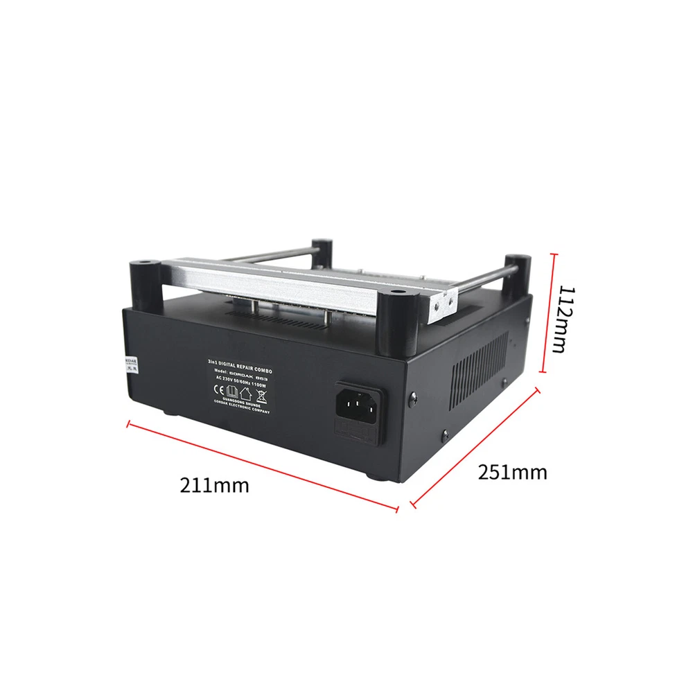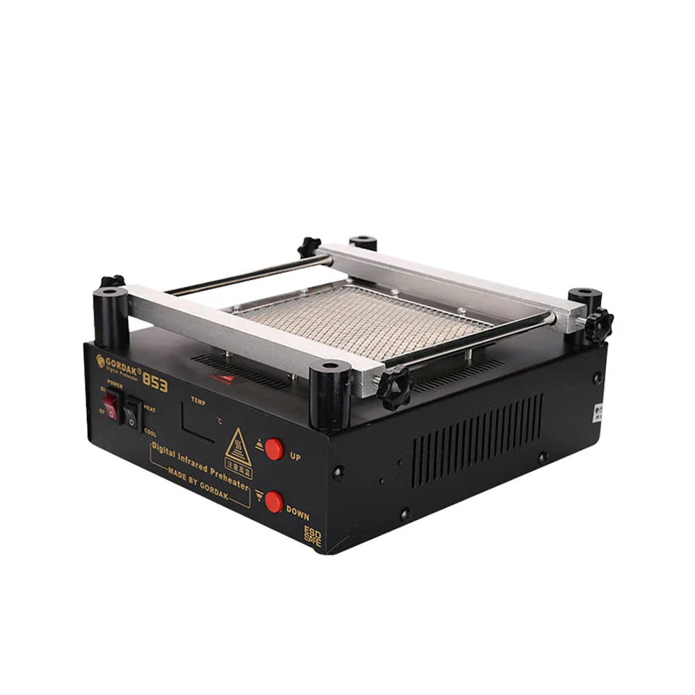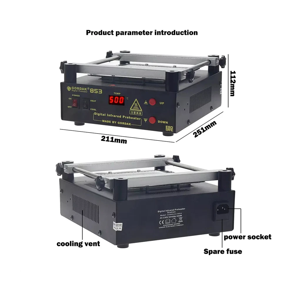 Gordak 853 Bottom Heating Preheating Station PCB Preheater Soldering Station BGA Rework Station Phone Repair Tools Feature: 1. ESD safe by design, wide temperature area design de-soldering system, high precision intelligent control circuit, LED display, easy operate. 2. Use big power 120mm*120mm far infrared heater, rapid heating. 3. Original heat insulation by design, increase the temperature erea greatly. 4. Could remove could soldering, fit for deal with big area BGA and computer mainborad extend groove's knock down and fix. Technical Specifications Technical Parameter: Brand: Gordak Model: 853 Rated voltage: AC230V Maximum power: 605W Heating method: Infrared heating plate Temperature range: 100 -500 Celsius Heating size: 120x120mm Dimensions: 221x251x112mm Weight : 3.5KG