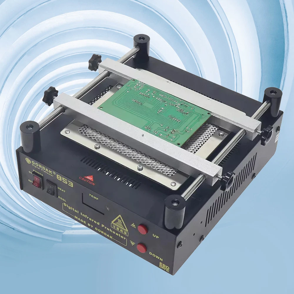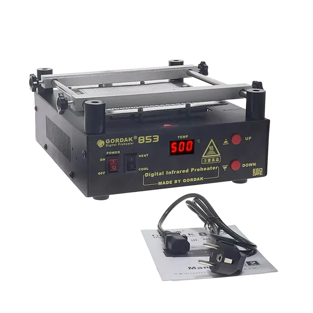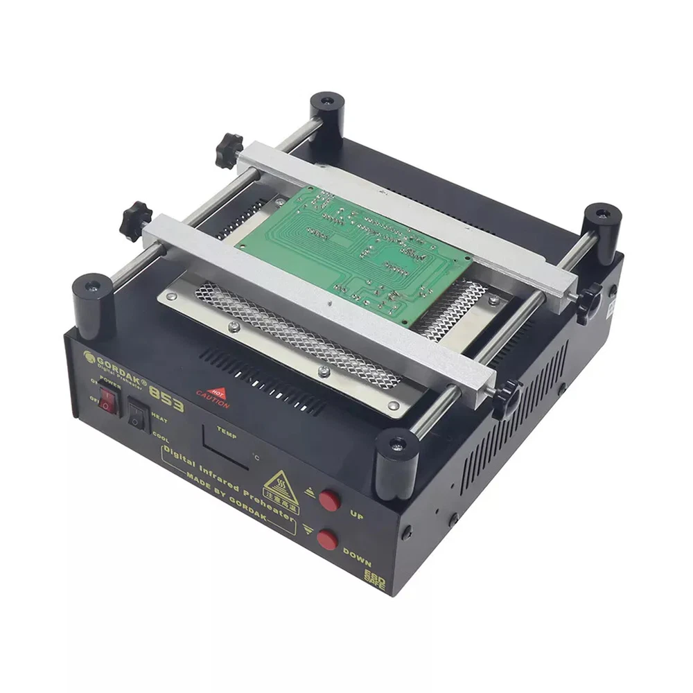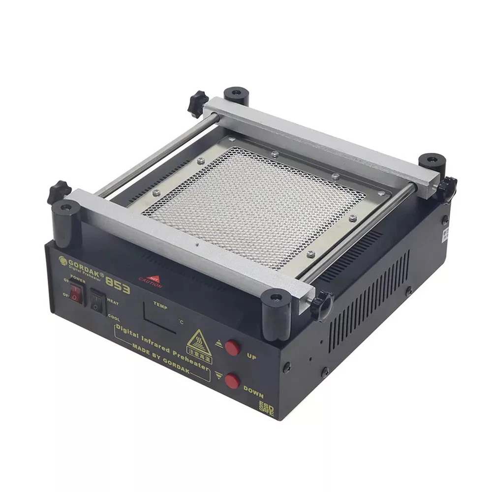 Gordak 853 Bottom Heating Preheating Station PCB Preheater Soldering Station BGA Rework Station Phone Repair Tools Feature: 1. ESD safe by design, wide temperature area design de-soldering system, high precision intelligent control circuit, LED display, easy operate. 2. Use big power 120mm*120mm far infrared heater, rapid heating. 3. Original heat insulation by design, increase the temperature erea greatly. 4. Could remove could soldering, fit for deal with big area BGA and computer mainborad extend groove's knock down and fix. Technical Specifications Technical Parameter: Brand: Gordak Model: 853 Rated voltage: AC230V Maximum power: 605W Heating method: Infrared heating plate Temperature range: 100 -500 Celsius Heating size: 120x120mm Dimensions: 221x251x112mm Weight : 3.5KG