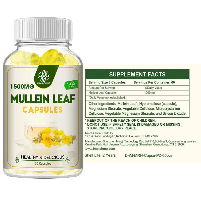 About the item: Item Type: Mullein Leaf Capsules Quantity: 60/120 pcs capsules Shelf Life: 2 years MULLEIN LEAF CAPSULES – Formulated with PURE Fresh Mullein Leaves blend formula and Absolutely NO Junk! (No Filler, chemical, preservatives, dyes, etc) added. Our MULITTEA natural Mullein leaf capsules are made with carefully picked fresh mullein leaves from Hawaii and contains 1000 mg per serving. MULLEIN & KEY BENEFITS - Mullein leaves have been used for centuries to help support respiration. This versatile herb has a long history of traditional use for a wide range of respiratory disorders. Mullein is traditionally used for its ability to promote the discharge of mucus as well. So now at MULITTEA we are bringing back the nature’s best version of mullein. How to use: Take 1-2 softgels daily with water or a meal. Store in a cool, dry place. What you can get? 1*60/120pcs Mullein Leaf Capsules Note: These statements have not been evaluated by the Food and Drug Administration. This product is not intended to diagnose, treat, cure or prevent any disease.