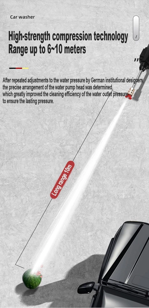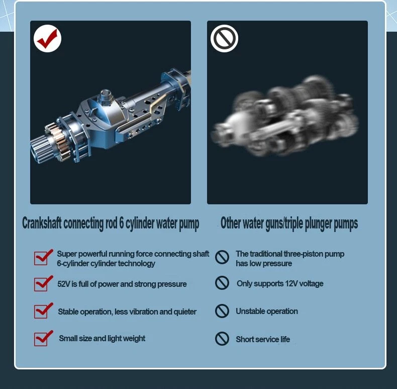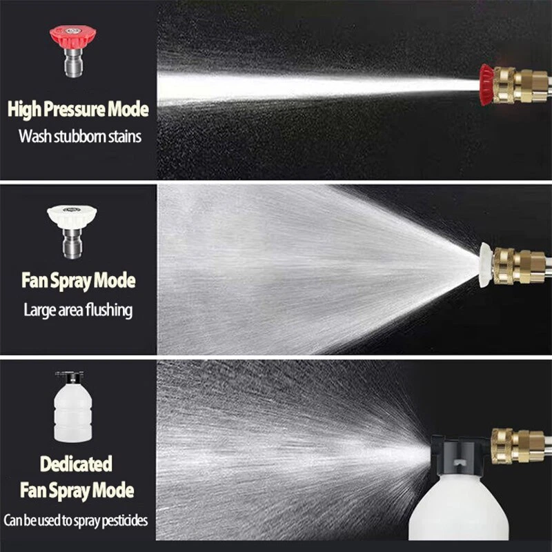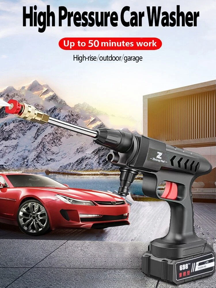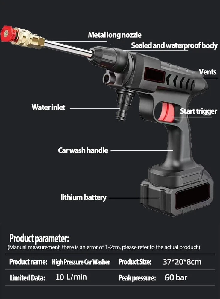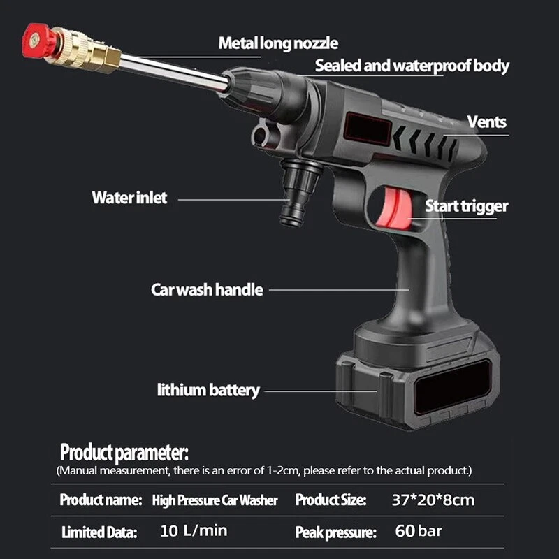 Specification : 100% New: We check every machine with water. it flow out some water is normal Product name: Wireless car washing machine Material: ABS and copper Power Supply:Lithium battery Weight:20000mAh (2.09KG) /30000mAh(2.34KG) Product pressure: 60Bar Drive: Lithium battery wireless drive Speed: 20,000 rpm Maximum flow: 10L/min Jet stroke: 6-10 meters Color classification: 10-section floor-standing wireless car washer, 15-section floor-standing wireless car washer Water pipe length: 5 meters Car washing equipment type: household car washing machine Water source type: faucet self-priming Scope of application: car washing, watering flowers, watering vegetables, spraying, garden cleaning, etc. Features : 1. Special material waterproof, water and electricity isolation is safer 2. Self-priming/faucet 2 water inlet methods, more convenient to take water 3. 3 Water types adjustable 4.With temperature protection function, automatic shutdown of over temperature and overload, eliminating safety hazards 5.Large amount of water, easy to absorb water 6. A variety of high-quality extension accessories, cleaning is more convenient and clean 7. Multifunctional high-pressure cleaning, very suitable for car washing, garden watering, agricultural irrigation and daily cleaning 8. Simple installation, quick plug-in installation of all interfaces Package included: 1x Washing Machine 1x Lithium battery 1x Charger 1x 5m Water pipe 1x 0° Outlet head 1x 45° Outlet head 1x Coke bottle adapter 1x Extension rod 1x Filter 1x Foam pot 1x Manual Q & A Q & A Q1: Why does the car washing machine not start after turning on the switch?he water pressure so small? A1: Maybe the battery is out of power, please charge Q2: Why is there no water after turning on the car washing machine A2: Observe whether the water pipe is bent and the water cannot be released; press the car washer for more than 15 seconds and wait for the water to be sucked into the car washer Q3:Water leaking from multi-function nozzle,Sudden increase in water pressure A3:The multifunction nozzle is blocked,replace the nozzle Q4:Water flows out after the machine is turned off A4:There is water residue in the pump door after the machine is turned off Q5:Foam bottle can't spray ? cleaning agent A5:Drain the water completely before storing foam bottle clogged,clean with water Q6: It can be started, but there is little or no water from the nozzle? A6: It may be that the water connector is not pressed tightly. Press the water connector directly twice for the second time until you hear a click. It may be that air has entered the fuselage or the water pipe. You can directly fill the fuselage with water with a tap to drain the air, and then spray water by self-priming. Q7: Battery indicator light off? A7:Use a screwdriver to disassemble the battery case, and press and tighten the four iron pieces at the four corners of the circuit board. Q8: Battery charged but won't start? Product does not start? A8:It may be because the inserts inside the machine are loose or wet. Use a screwdriver to disassemble the battery case to see if the battery circuit board is wet. If it is only a little wet, it can be air-dried. If the entire circuit board is wet, scrape off any rusted areas and air dry. If it is not wet, just clamp the corners of the battery circuit board and a few iron pieces in the middle. If you don't know how to disassemble the machine, you can try knocking the gun head down on the ground or on the table a few times. During use, be careful not to seepage of water in the battery, it will be recharged every time it is used up, and the battery will be thrown upside down. If you encounter any questions that you don't understand, please contact customer service to handle it for you! grateful! Warm Tips: 1.After the car wash machine is used, it should run empty for a few seconds to drain the residual water in the machine, avoid oxidizing dirt and freezing for weather reasons, and store it in a dry and cool place. 2.Do not store in the trunk of the car in hot weather to avoid fire caused by high temperature. 3.Batteries need to be kept away from water.Remove the battery after use, so as not to High Pressure Car Washer Up to 50 minutes of battery life High-rise/outdoor/garage 300W Copper motor A good machine needs a strong heart. It can work continuously at 20000rpm and has a long life without burning the machine. Crankshaft connecting rod 6 cylinder water pump : Super powerful running force connecting shaft 6-cylinder cylinder technology 52V is full of power and strong pressure Stable operation, less vibration and quieter Small size and light weight Other water guns/triple plunger pumps : The traditional three-piston pump has low pressure Only supports 12V voltage Unstable operation Short service life High-strength compression technology Range up to 6~10 meters After repeated adjustments to the water pressure by German institutional designers, the precise arrangement of the water pump head was determined, which greatly improved the cleaning efficiency of the water outlet pressure to ensure the lasting pressure. Power surging Multifunctional nozzle Switch water type at will Meet different car wash needs 0 ° Outle t/ 45 ° Outlet Metal long nozzle Sealed and waterproof body Vents Water inlet Start trigger Car wash handle lithium battery Product parameter : (Manual measurement, there is an error of 1-2cm, please refer to the actual product.) P roduct name: High Pressure Car Washer Product Size : 37*20*8cm Limited Data : 10L/min Peak pressure:60 bar High Pressure Mode Wash stubborn stains Fan Spray Mode Large area flushing Dedicated Foam pot spray Can be used to spray pesticides Automatic water absorption design Unlimited venue, available anytime, anywhere Automatic suction design, can be used in bucket/river water/pond/full scene