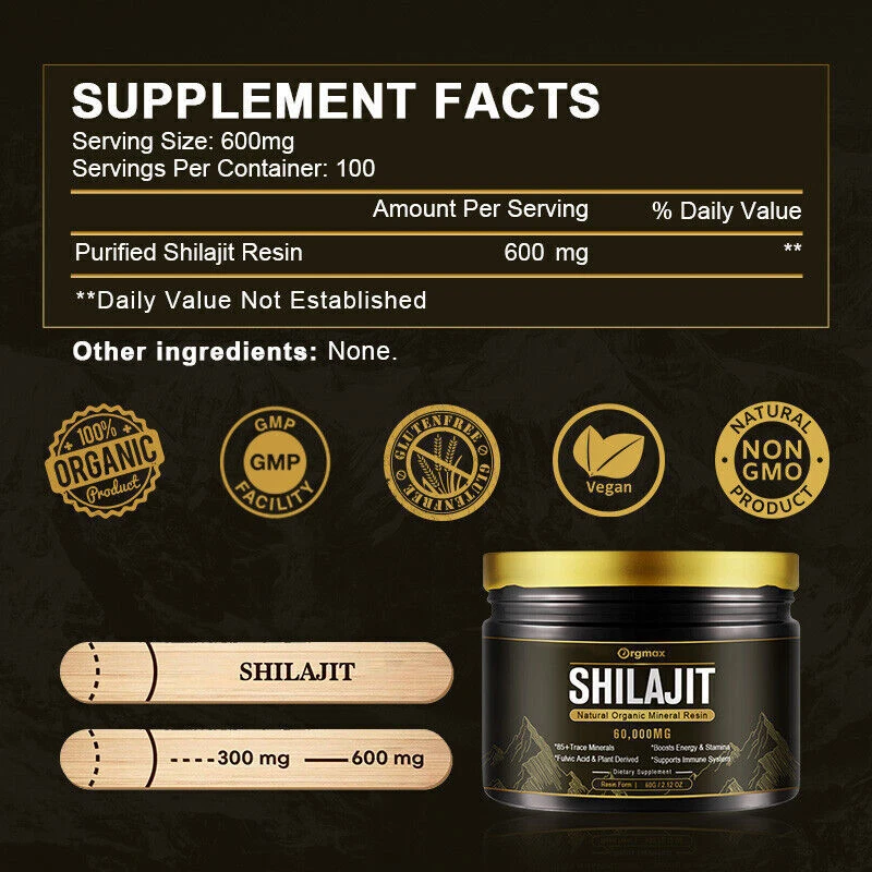 Specification: Brand:Orgmax Shelf Life: 2 years Net Content: 60g Applicable Objects: Adults Storage:Store in a cool, dry place. Note: 1.Do not exceed recommended dosage. 2.Not formulated for use in Children. 3.Do not use if imprinted seal under cap is broken or missing. 4.Store tightly closed, in a cool, dry place away from heat and light. 5.Keep out of the reach of children. 6.If you are pregnant, nursing, taking medications, consult your physician before use. 7.If you experience any adverse symptoms after use, discontinue use of this product and consult your physician. 8.These statements have not been evaluated by the Food and Drug Administration. This product is not intended to diagnose, treat, cure or prevent any disease. Shilajit is the most important drug in Ayurvedic health preservation and the most natural and high-quality source of humic acid. It is a deep red adhesive substance composed of a compact and abundant combination of herbaceous plants and organic matter. The biggest benefit of Shilajit is that it works with other herbs to enhance its bioavailability and promote the movement of minerals, especially calcium, phosphorus, and magnesium into muscles. Shilajit helps transport nutrients deep into the body's tissues, eliminating deep-rooted toxins. Helps accelerate processes, protein and nucleic acid metabolism, and promotes energy supply responses. Contact Us & Feedback Your feedback is very important to us. We will leave positive feedback for you as soon as payment is received and hope you will take a moment to do the same for us. If u are satisfied with the item, please be kind to leave us positive feedback and a good rating. If you are not satisfied with the item or you have not received your parcel in the estimated time, we sincerely request from you contact us through the "My Message" section Or "Ask Seller Questions" BEFORE taking critical action. We will try our best to solve the problems to make our customers satisfied. All emails will be cos within 2 business day. If you do not receive our reply, please kindly re-sent your emails and we will reply to you ASAP. Payment The only acceptable payment methods are Payoneer, Credit Debit card & Paypal. Before your payments, please make sure you have a valid/active account. Our shipping services are valid only for verified eBay addresses. Therefore, please make sure to verify your eBay address. Moreover, your verified eBay address and the Paypal registered addresses are should be the same. Shipping We will ship the product about 2-3 days on confirmation of payment. The shipping method is Standard Registered Parcel Post. It includes 100% free shipping for most of our products. Nevertheless, this free shipping method might be changed for heavyweight items because of the huge amount of shipping cost. Returns 100% Satisfaction Guaranteed. We accept product returns within 30 business days from the delivery of the item. If you are not satisfied with the item or its condition, please feel free to contact us before taking action. We will try to solve any dispute and try our best to make our customers fully satisfied.