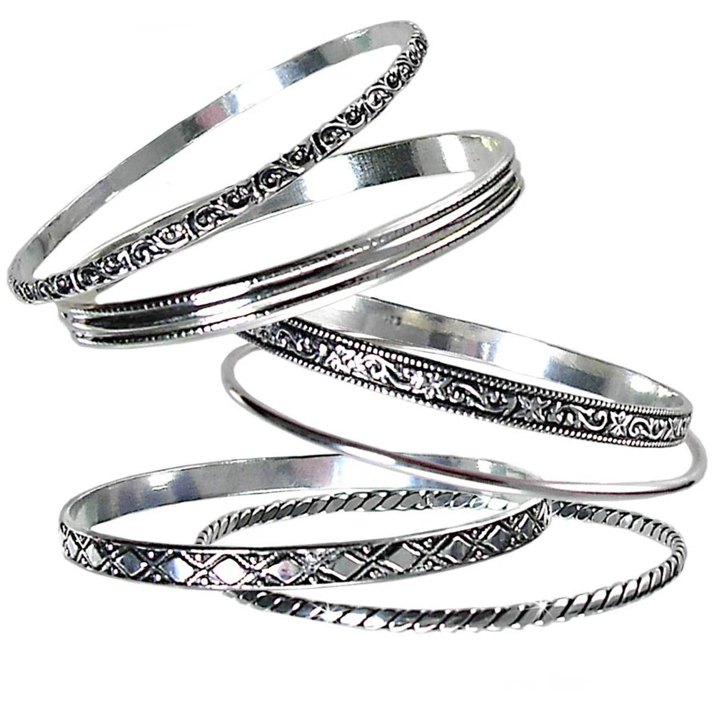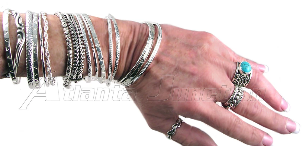 ATLANTA JUNCTION Bali Designer 60MM_SET OF 5_HIGH POLISHED EMBOSSED TRIANGLE BANGLE BRACELET_#05-S 60MM_SET OF 5_HIGH POLISHED EMBOSSED TRIANGLE BANGLE BRACELET_#05-S 925 STERLING SILVER OF THE HIGHEST QUALITY DESIGNED BY ARTISANS ALL OUR JEWELRY IS BRAND NEW AND DISCOUNTED 50% - 70% OFF RETAIL **KNOW YOUR PRODUCT** What you see on other eBay auctions may not be what you want. Cheaper items sold on eBay may look exactly the same but they are made of Brass and will turn your skin a greenish-black. Sellers will try to deceive you or hide this fact in small print. All our Jewelry is stated clearly on each listing 925 Sterling Silver . We sell High-End Quality items that you will be proud to wear. DETAILS: Comments: SAVE OVER $36.00 on the 5-PC. SET HIGH POLISHED BANGLE BRACELET. . . NICKEL FREE 925 Sterling Silver -Embossed Triangle design goes completely around bracelet. Very beautiful! We also sell 65MM bangles like this set and also separately. Stack 'em, Rack 'em, Mix & Match 'em Check out our other bangle bracelets. They are fun to mix with other bangles and stack them. Add to your Bangle Collection now or start a new collection. We have twelve (12) different styles and designs in our collection. A beautiful Classic Bracelet that will never go out of style. Metal: NICKEL FREE - 925 Sterling Silver Weight: Approx. 50 grams-total weight Measures: approx. 1/8" wide Various widths range from approx. 1/8" to 3/16" -- for detailed width on each bracelet see the listing for individual bracelet. Diameter or Open space across is 2-5/16" -- or -- 60mm Inner-Circumference is approx. 7-1/4" Will fit most Small/Medium boned wrists. To find your size see instructions & example below. Size: 60mm (Small/Med) NOTE: Everywhere I go people compliment me on my bracelets. They really look good stacked. I wear these bracelets all the time, never take them off. That's the great thing about silver is that you never have to polish them if you wear them all the time...even in the shower. They will last forever... WHICH BANGLE SIZE DO I NEED? : WHICH BANGLE SIZE DO I NEED? To wear a solid bangle that does not open, your hand has to be able to fit through it. To find out which bangle size will fit you, please do the following: Wrap a soft measuring tape around the widest part of your hand (hold the hand as if it is fitting through a bangle), forming a complete circle and get a measurement at where it overlaps. The tape should go around the knuckles of your hand. If you cannot find a soft measuring tape, you can follow these steps: 1. Find a piece of string. 2. Wrap it around the widest part of your hand (hold the hand as if it is fitting through a bangle) 3. Use a pen to mark the point on the string where it overlaps, forming a complete circle 4. With a ruler, measure the length from the starting end of the string to the pen mark The length you get is the minimum size of a solid bangle you will barely fit through, since most bangles are not as flexible. EXAMPLE: The tape measure around my knuckles (photo-right) is approx. 8" inches. I wear the small 60mm bangles. I believe this would be the MAX for this size as it is a tight fit over my hand. I would guess that if you are over 8" that you would need to get the 65mm which we also have.