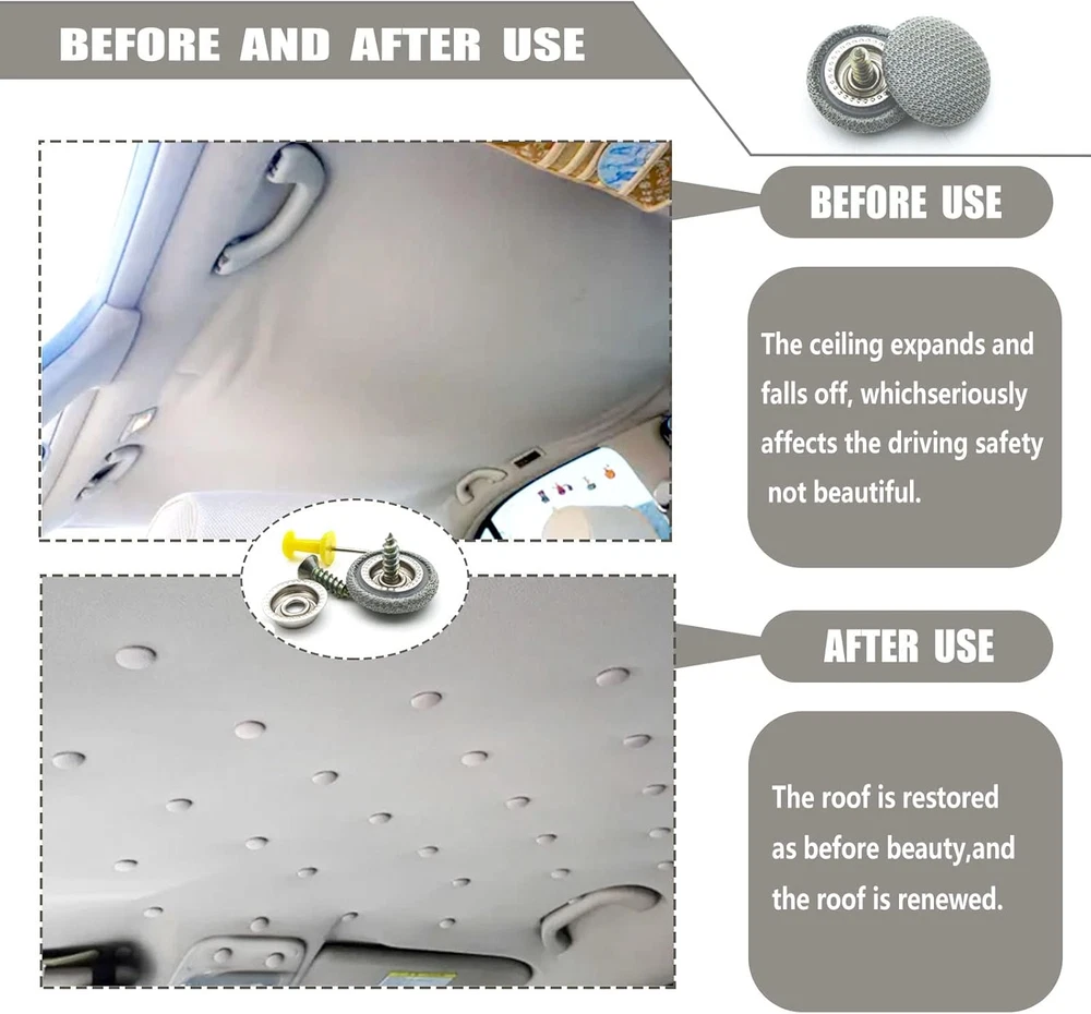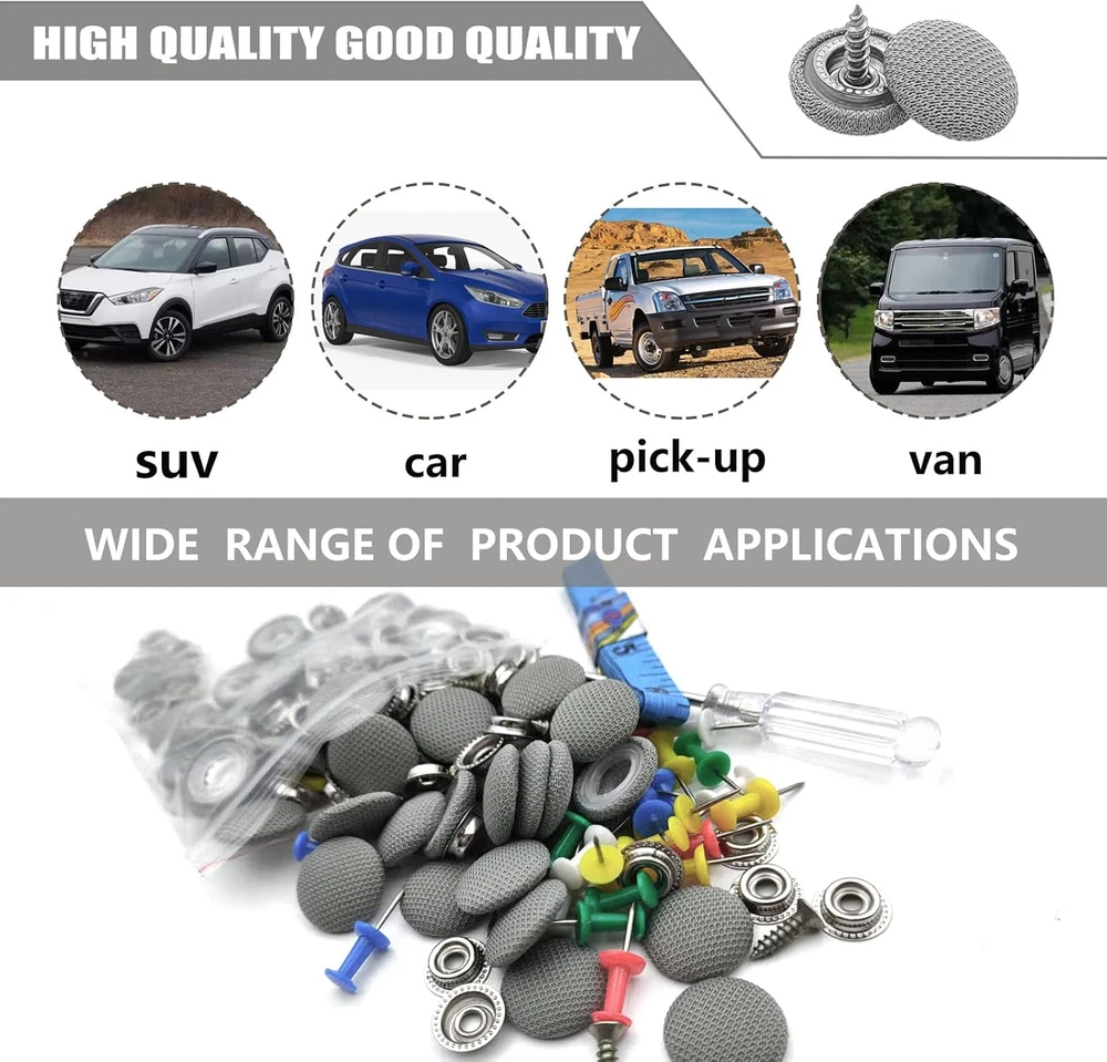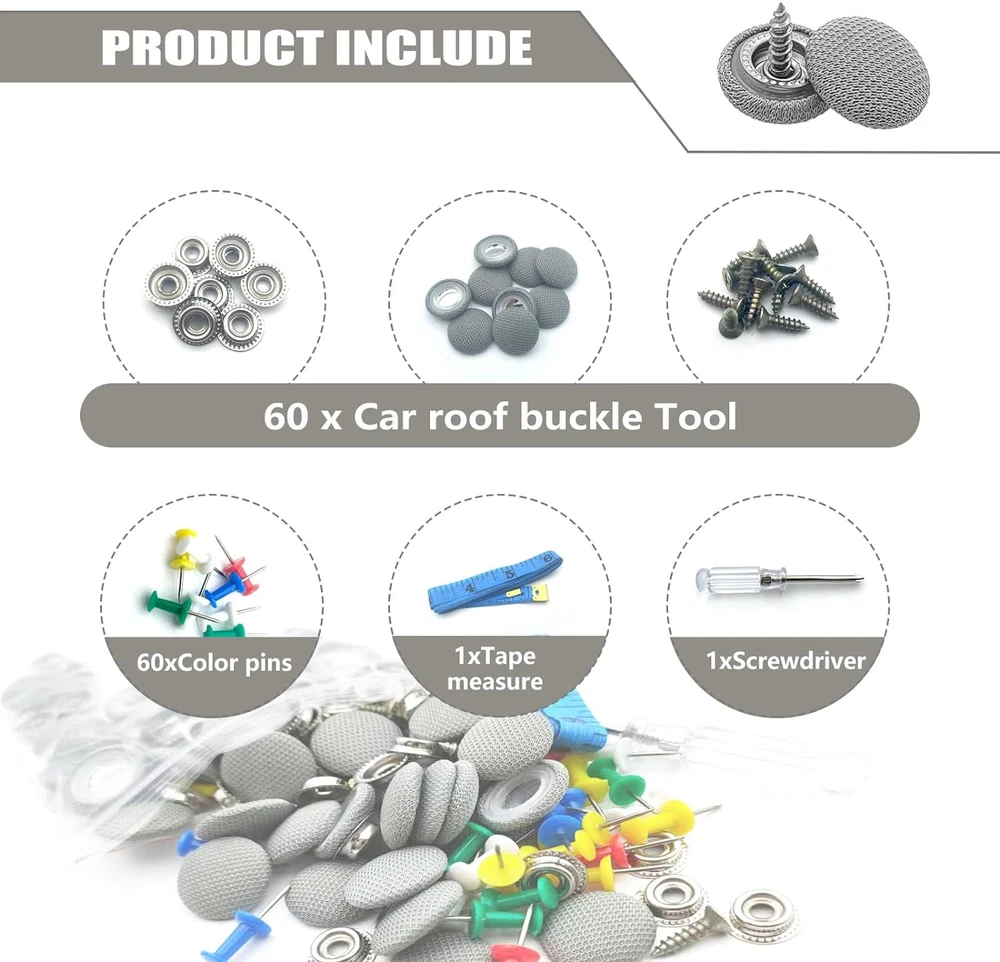 Neighborhood service 60PCS Car Roof Headliner Repair Kit, Auto Roof Snap Rivets Retainer for Interior Ceiling Cloth Fixing Repair Buckle with Installation Tool (Grey Grid) ENJOY THE FEATURES 【Universal Car Roof Repair Rivets】:60pcs universal car proof repair rivets for all cars;We tried it on thousands of cars and found no problems, so it must fit your love cars. 【Durable&selected material】:Made of grid durable fabric clothes, the color is light and can be combined with a variety of automobile interiors. with special coating keeps the pop rivets from rusting. 【Tools for repairing】:60 pcs car roof buckle, 60 pcs colorful push pins, 1 pc screwdriver and 1 tape measure. No need other tools and won't break the original vehicle. all you need in included in the package. 【Simple Operation】:You can put them on your car ceiling, very easy to operate and they will make your car interior looks roomy and no more saggy roof. 【Money Save】:This auto roof repair kit will help you save money,this kit is easy to install. It only need patient.It'll help you save money by mending the car at home. Describe: Name: Universal Car Roof Repair Rivets It is mainly used to decorate the upper part of the car interior to fix the interior roof of the car,for Interior ceiling cloth fixing screw cap roof repair buckle for all cars The color of the product is light and can be combined with a variety of automobile interiors. Can be used in cars, trucks, motorcycles, buses, trains, airplanes, caravans, etc. Package Includes: 60 x Car roof buckle & 60 x Colorful push pins 1 x Screwdriver & 1 x Tape measure How to install Fix it from the middle of the drooping cloth. Install the buckles evenly in the middle. Repeat the process until no more sagging. Item model number -Clips Item dimensions L x W x H 0.1 x 0.1 x 0.1 inches Fastener Type Cap Color Grey Item Diameter 0.1 Inches Country of Origin China Manufacturer Part Number -Clips Item Weight 5.9 ounces Shape Car Number of Pieces 60 Size One Size 0.1 inches x 0.1 inches x 0.1 inches. Weight: 5.9 oz PAYMENT We accept all payments via Ebay using Credit Cards , PAYPAL , Apple Pay and many others SHIPPING We are always working hard to ensure your package arrives as soon as possible. Please understand that some factors like weather, high postal traffic, and the performance of shipping companies are outside of our control. We offer free shipping to the lower 48 states and ship within 3-5 business days of payment, usually sooner. We do not accept P.O. Boxes. Please provide a physical address. We do not ship internationally at this time. DELIVERY & RETURN POLICY We do not offer returns unless the item violates eBay policies. Please be aware these polices only make sellers accept returns if the item violates eBay's Buyer Guarantee. If you would like to learn more about this please visit eBay's Help Page. Thank you for your business