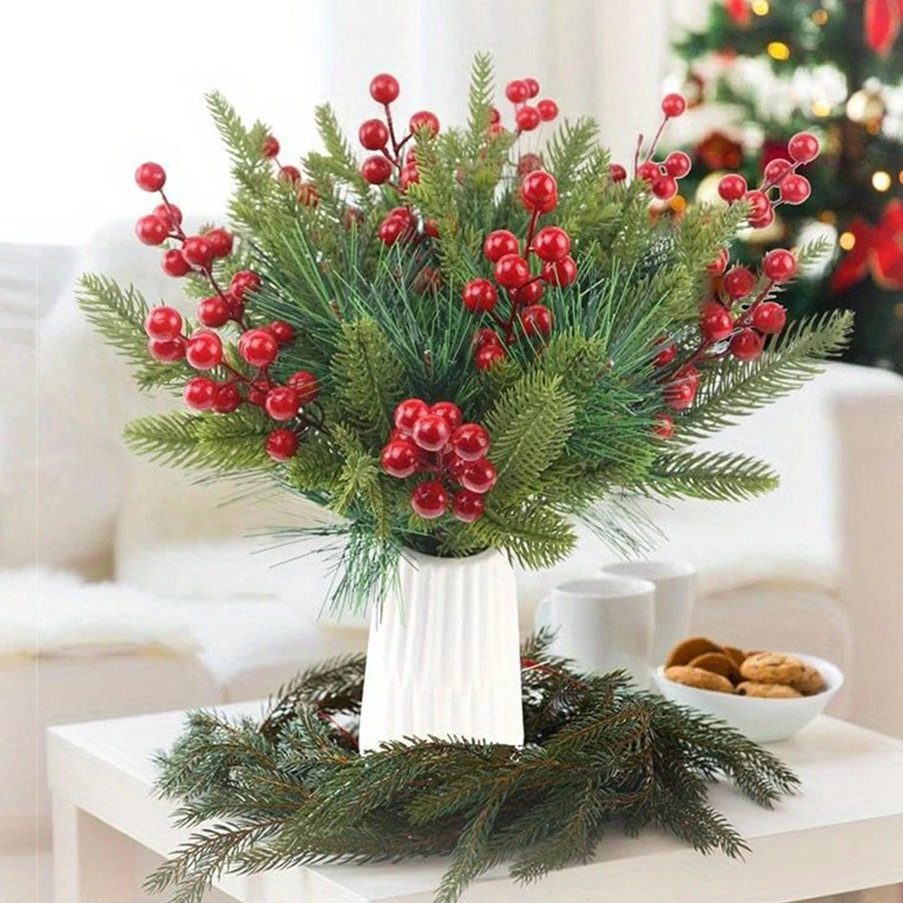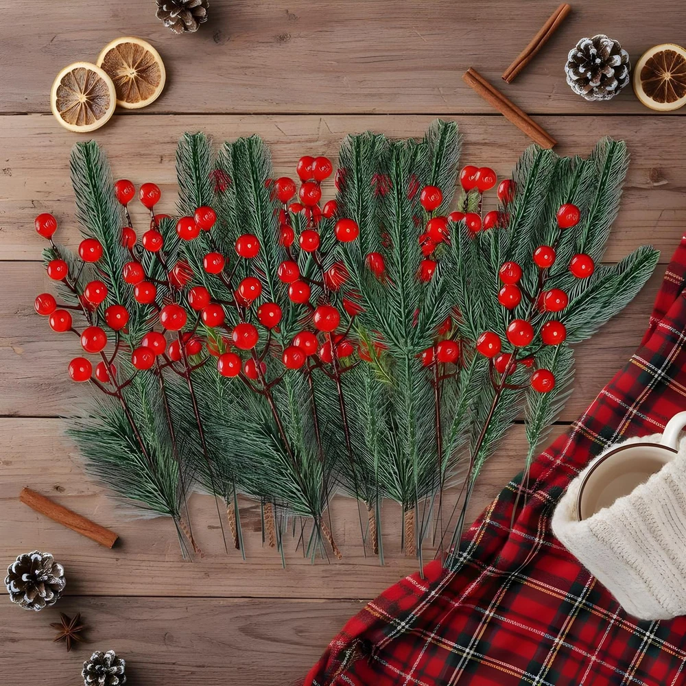 $ 15.345 Pcs Artificial Pine Branches with Red Berry Stems, Christmas Greenery Sprigs