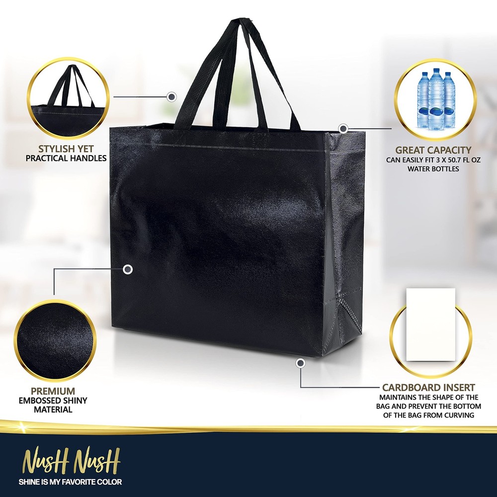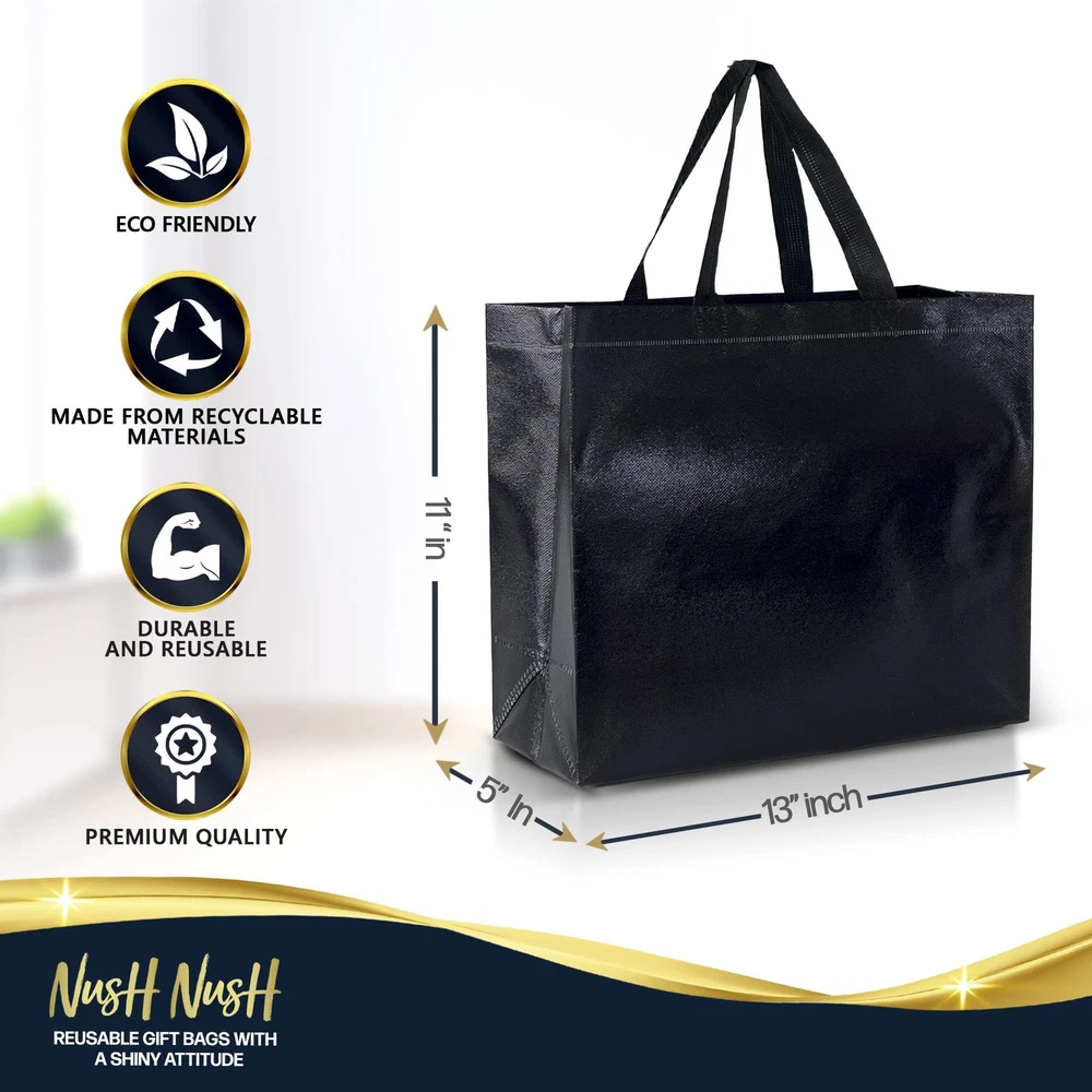 What makes bags different? TAILORED FOR SMALL BUSINESSES: our eco-friendly 60-pack option delivers the same high-quality reusable BLACK gift bags in a larger, more economical pack size, catering to the demand for sustainable gift bags in bulk. BRING ON THE SHINE – Featuring a stunning laser surface our black gift bags with handles create beautiful reflections under different light conditions and are perfect as birthday bags, gift bags for women, welcome bags, wedding gift bags, party bags, etc. REINFORCED BOTTOM – Each of the 13(W)x 5(D)x11"(H) large black gift bags comes with a cardboard insert to prevent the bottom of the bag from curving and maintain the tote bag shape even when the bag is empty. GO PAPERLESS – Our shiny reusable black gift bags are made from Polypropylene ( the same material reusable bags in the supermarkets and stores are made from) , these are not your generic old paper gift bags but a new breed of party gift bags designed for those who seek to combine glam and sustainability. PLANET FIRST GIFTING - In our commitment to lessen our environmental footprint, we've partnered with renowned non-profit Climate Partner. By dedicating 10% of profits, we offset all carbon emissions associated with the full life cycle of our products.