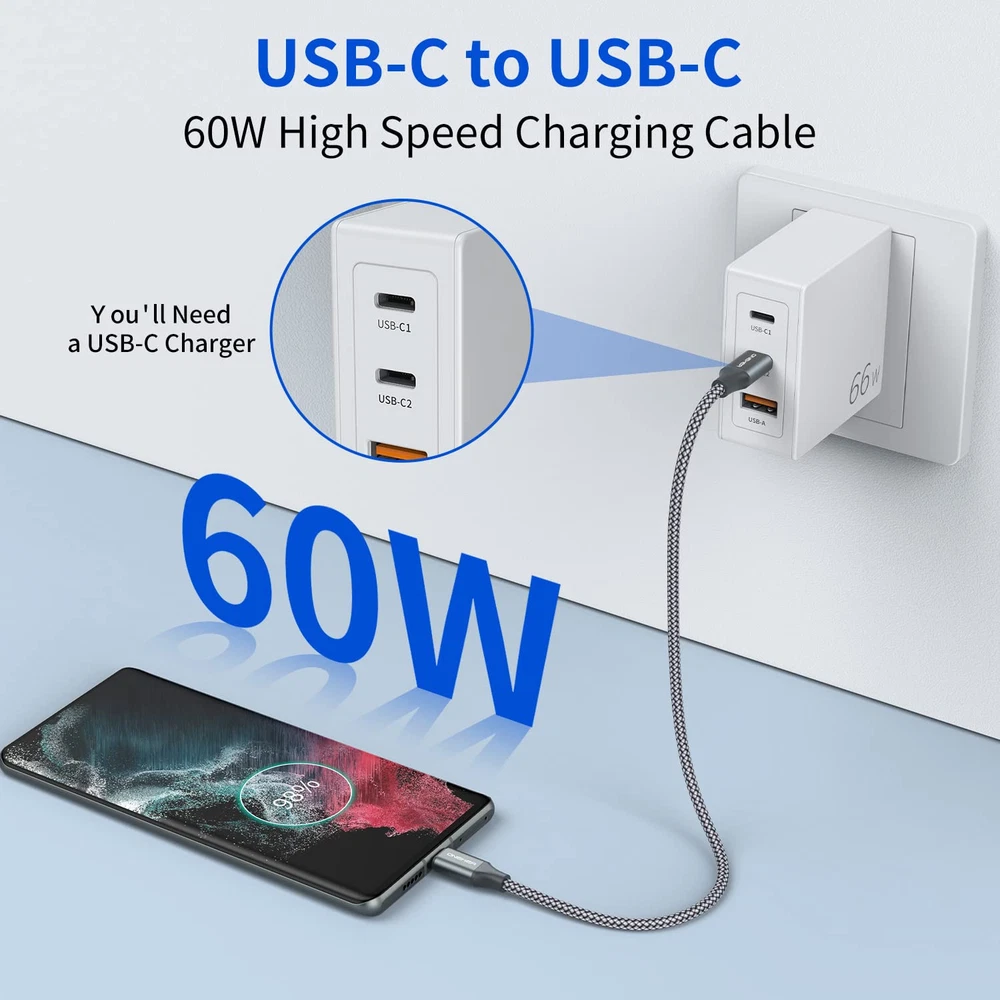 [Compatibility List]:This USB C to USB C Cable can fast charge your Samsung Galaxy S24/S23/S22 / S21 / S20 / S20+ / S20 Ultra / Note 10 / Note 10 Plus / A80 Nexus 6P 5X, Google Pixel 2 3 4 XL, or other compatible model. It can also charge your Pro,MacBook 2015, MacBook Pro 2016 13-inch, MacBook Pro 2017 13-inch, MacBook Air 2018 with the original charger (Look into Product Description for details) [USB C to USB C]: This is a USB-C to USB-C cable not USB-C to USB-A cable, which means it has the same USB C plug on both ends, so you need a USB C wall charger to charge your device [Reliable and Stable]: Premium nylon braided cable adds additional durability and tangle free. Special Strain Relief design, can bear 10000+ bending test [Fast Charge and High-Speed Sync]: Output power up to 20V, 3 A, which is ensured by high-speed safe charging, and the USB 2.0 supports data transfer speed up to 480Mbps. NOTE: This product can NOT support video output [What You Get] : We provide 3 Pack Nylon Braided USB 2.0 Type-C Cable, if you have any questions,we will resolve your issue within 24 hours