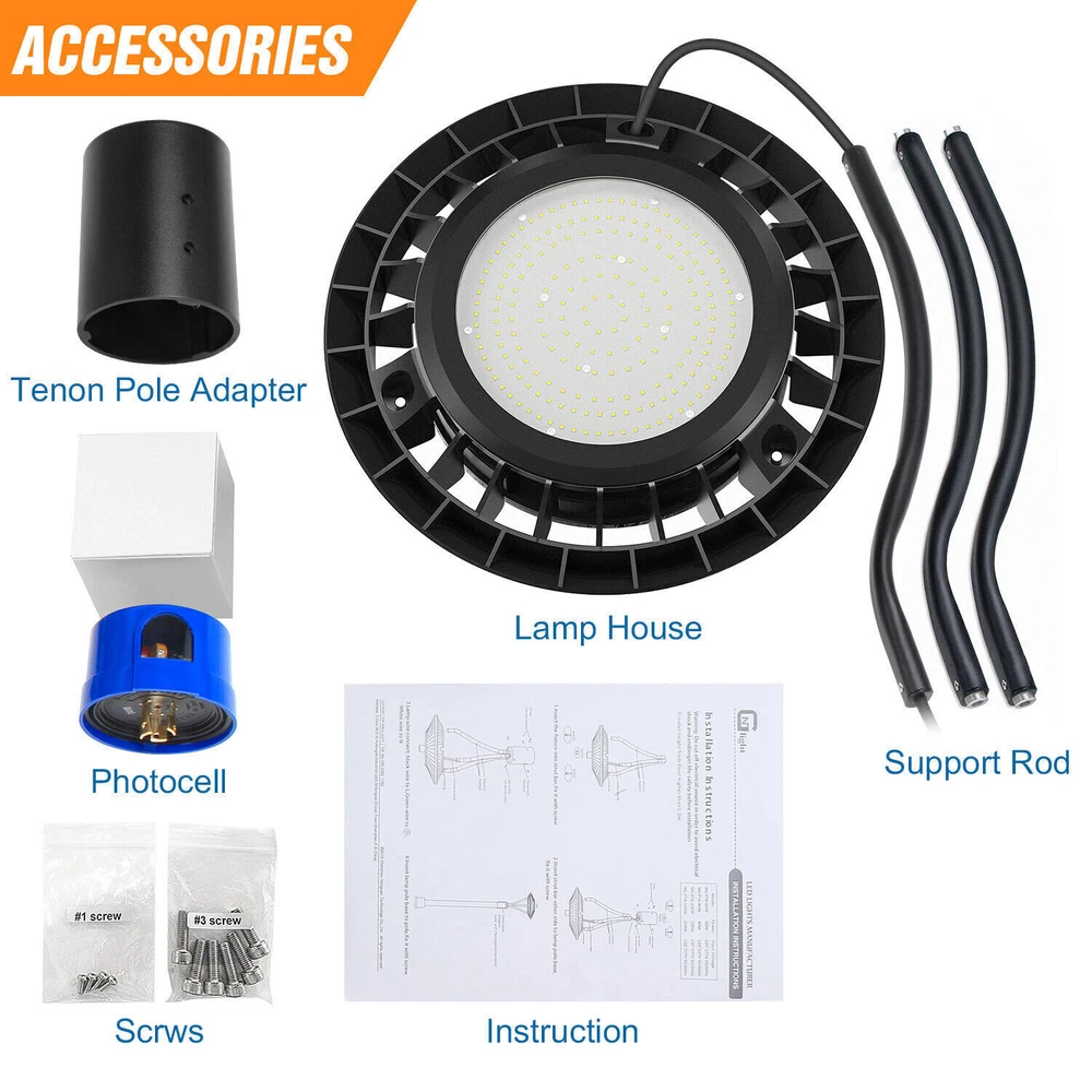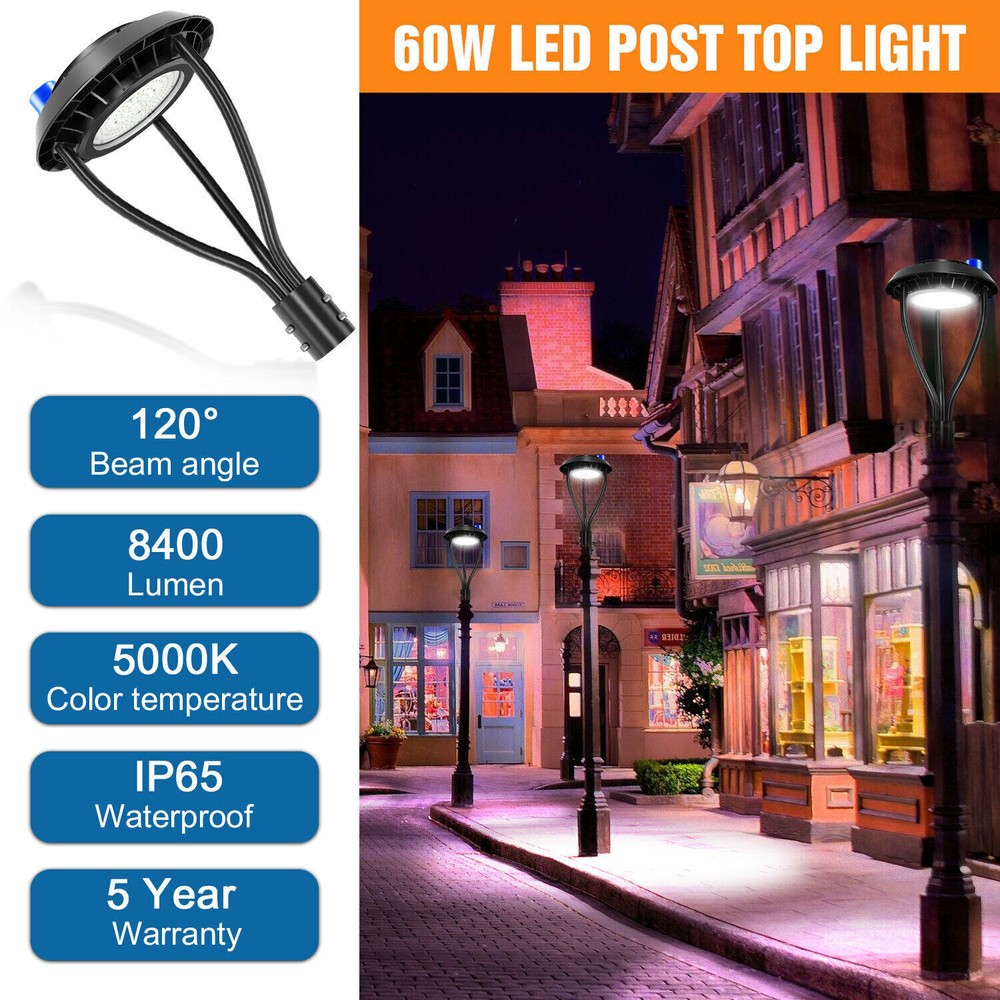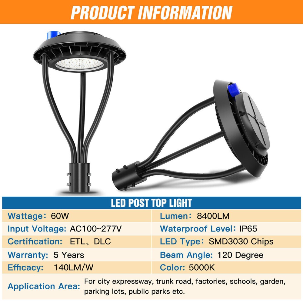 Product Description 60W LED Circular Area Pole Light [400W Equal] Street Garden Pathway Road Lights Light Up Larger Area - The 60w light post bring 8400Lm with SMD3030 chips, up to 140lm/watt, AC 100-277V universal voltage and 120°beam angle. 5000K color temperature of lighting is a nice choice for street light illumination. Anti-shock, anti-moisture, no glare, no strobe light, no ghosting, protecting your eyes. Dust to Dawn Photocell - The Led circular post top pole light comes with photocell sensor outside automatically turns ON at sundown/night and light post at sunrise/daytime with dusk to dawn, high power factor >0.9, more than 50000hours lifespan, reduce your electricity consumption, save your electronic bill. Provides a continuous, efficient outdoor lighting environment. Commercial Grade Material - The DLC/ETL Listed post pole light fixture made of die-casting aluminum body + protective glass cover. The scientific design helps the exterior light post top to dissipate better, achieve the best use of the led lighting post. IP65 waterproof for drying, wet environment, sandstorms, snowstorms, and harsh weather conditions. Wide Application - The circular post top design give the lamp a uniform brightness and can be applied to a variety of outdoor scences, such as pathway, street, front yard, city expressway, trunk/rustic road, factories, playground, school, garden, courtyard, parking lot, public park, walkway, exterior, driveway, store, farmyard or any other commercial and industrial area. Installation and Warranty - The pole mount of our post area light fits for a 2 3/8-inch OD tenon & less than or equal to 3 inch standard pole, very easy to install and transfor(Please see the video on the product page for more installation info). KUKUPPO offer you lasting safety and reliability backed by a 5-year warranty. For a bulk order, email us in advance to get a different offer. Rated Wattage: 60W Luminous Flux: 8400Lm Color Temperature: 5000K Protection Grade: IP65 Material : Aluminum Body+Glass Cover Input Voltage : AC100-277V 50/60Hz Dimension: Dia 460x625 mm Base: 2 Pins Wire Power Factor: >90% Beam Angle : 120 degrees Average Lifetime : More than 50000 hours Flexible Installation The pole mount of our post area light fits for a 2 3/8-inch OD tenon & less than or equal to 3 inch standard pole, very easy to install and transfor Commercial Grade Material DLC/ETL Listed quality. Scientific design helps the exterior light post top to dissipate better, achieve the best use of the led lighting post. Durable Support Rod Made of thick aluminum, stable and strong, waterproof and rustproof. High performance quality provides with lasting safety and reliability. Ultra Bright LED Chips With SMD3030 chips, up to 140lm/watt. Anti-shock, anti-moisture, no glare, no strobe light, no ghosting, protecting your eyes. Kindly Note Please note that the light can not be used IN the water. Please confirm the wire connection is right while installing. Maintenance Please pay attention to the dust protection of led post top lights. Please use a rag to stain the water and wipe it in the same direction. ●Don't force it back and forth to avoid damage to the garden lights. ●Don't switch the power switch frequently to avoid unnecessary energy loss. About Us Payment Shipping Returns Contact Us SHENZHEN NUOGUAN TECHNOLOGY CO. LTD founded in 2010. We are high-technology comany specialized in manufacture Commercial and industrial LED light. Advanced production equipment and excellend R&D ability help us to combining service ,production sell together provide top-level products to our customers. 1. Payment is expected within 7 days of auction close. Or Unpaid Items will be forfeited per eBay . 2. Taxes may be applicable at checkout as states adopt new laws and regulations regarding sales tax collection. 1. We ONLY ship to USA . 2. Orders processed within 1-2 business day of payment verification. There’s no Delivery service or courier service on Saturdays, Sundays or Public Holidays. 3. We have 3 different warehouse in US,so due to stock status and time differences, we will choose to ship your item from our first available warehouse for fast delivery. 4. We offer Free Shipping within the Lower 48 states! All packages are sent via UPS or USPS.The delivery time for UPS Ground is typically 2-5 business days. We strive to ensure 100% satisfaction for each and every one of our customers. we offer a 30-day 100% money-back guarantee on all eBay orders. If your item isn't just as you wished, simply send it back to us and we'll refund or replace your item. Please note that all returns must be authorized by our Customer Service department. please contact us though message first if you have any problem. USA Warehouse. Fast shipping! We are appreciated your purchasing form our eBay store. Office Time: 9:30 - 18:30, Monday - Saturday (UTC+8) Please contact us with eBay Message. We will respond you within 24 hours on business day. About Us SHENZHEN NUOGUAN TECHNOLOGY CO. LTD founded in 2010. We are high-technology comany specialized in manufacture Commercial and industrial LED light. Advanced production equipment and excellend R&D ability help us to combining service ,production sell together provide top-level products to our customers. Payment 1. Payment is expected within 7 days of auction close. Or Unpaid Items will be forfeited per eBay . 2. Taxes may be applicable at checkout as states adopt new laws and regulations regarding sales tax collection. Shipping 1. We ONLY ship to USA . 2. Orders processed within 1-2 business day of payment verification. There’s no Delivery service or courier service on Saturdays, Sundays or Public Holidays. 3. We have 3 different warehouse in US,so due to stock status and time differences, we will choose to ship your item from our first available warehouse for fast delivery. 4. We offer Free Shipping within the Lower 48 states! All packages are sent via UPS or USPS.The delivery time for UPS Ground is