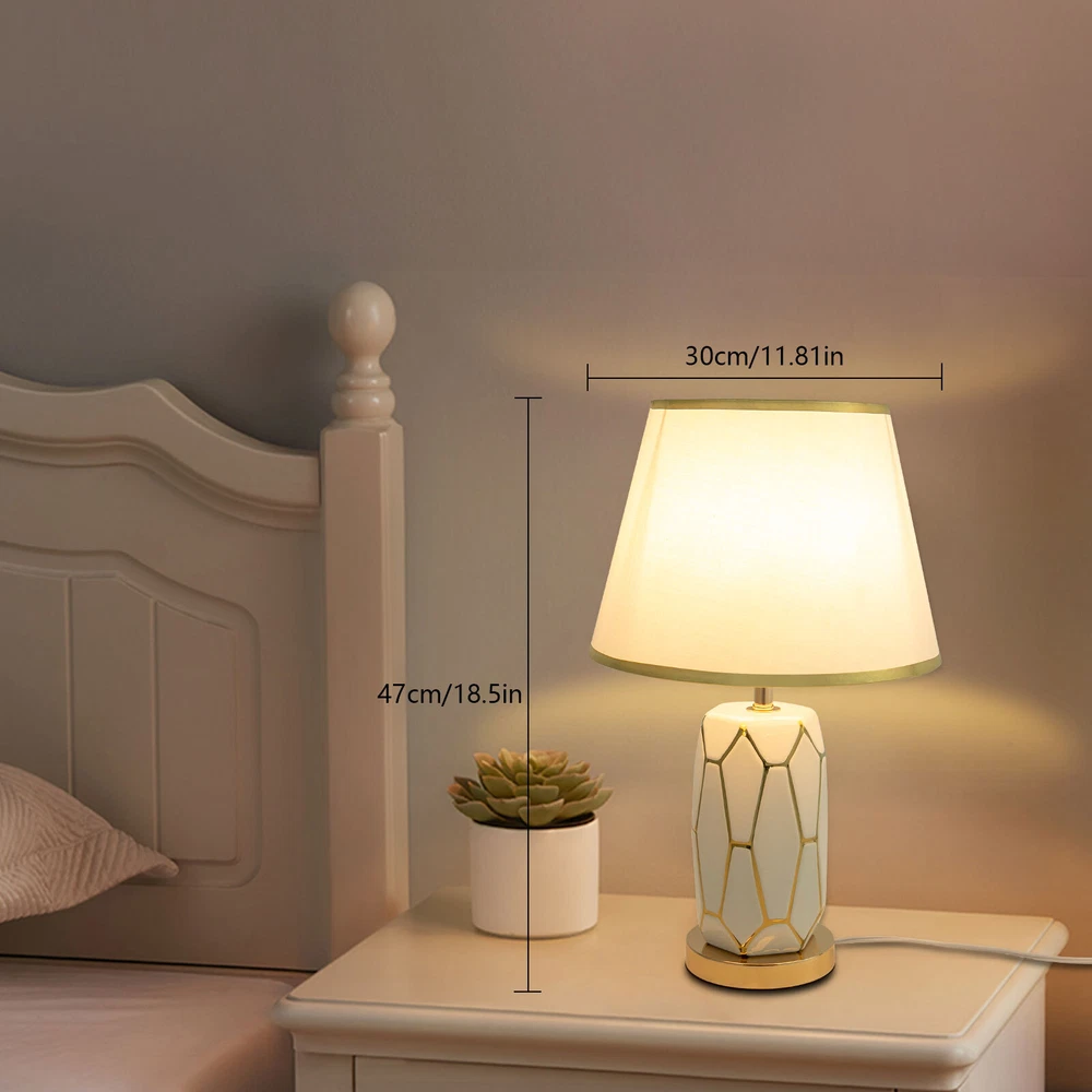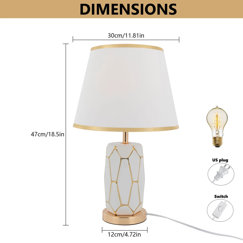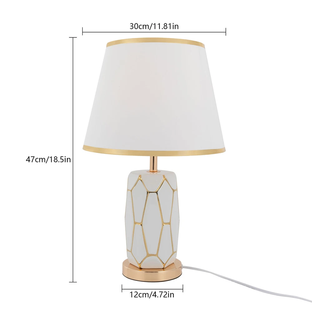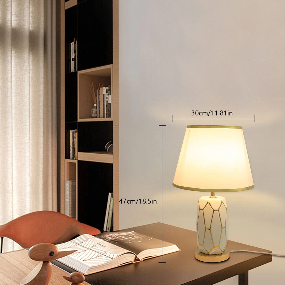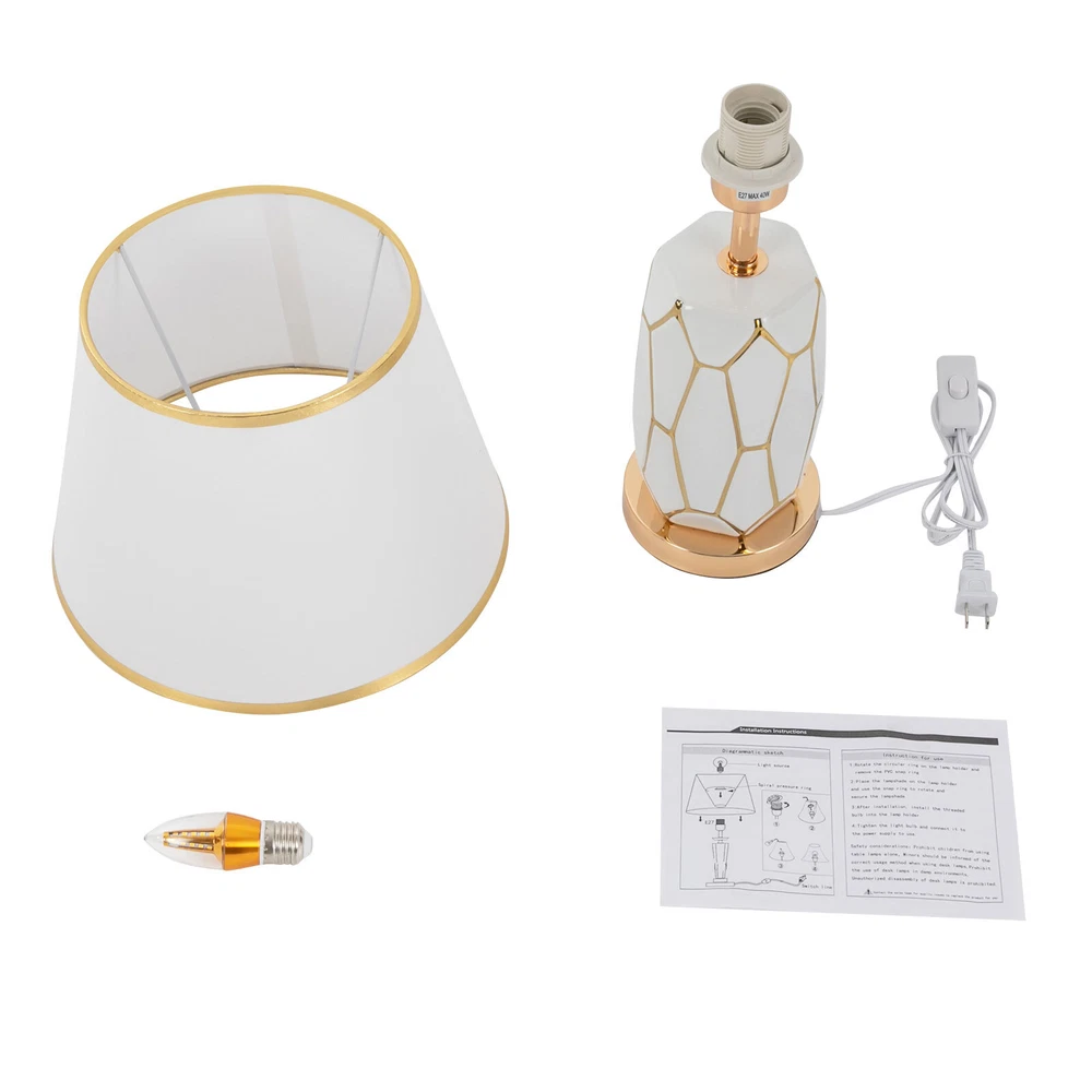 Specifications Material: Ceramic, Cloth Style: Modern Color: White Type: Table Lamp Process: Electroplating, Polishing, Grinding Assembly Required: Yes Mounting Type: Tabletop Indoor/Outdoor Usage: Indoor Power Source: Corded Electric Plug Type: US Standard Controller Type: Hand Control Switch Type: Push Button Efficiency: E Power Cord Length: 1.5m/4.92in Voltage: 100-250V Max. Bulb Power: 60W Light Source: 1* E26/E27 Bulb (Not Included) Applicable Area: 5m²/53.82ft² Base Diameter: 12cm/4.72in Product Size(L*H): 30*47cm/11.81*18.5in Package Included 1* Table Lamp 1*Power Cord 1* English Installation Diagram Welcome Description This table lamp is made of high-quality ceramic and cloth through electroplating, polishing and grinding processes, which is ideal for adding a touch of aesthetics and sophistication to any space. Its button design allows for convenient use. If you are looking for inspiration for your home decoration and ambient lighting, then this item is a great option . Key Features Build to Last: Our product is made of high-quality ceramic and cloth through electroplating, polishing and grinding processes, so it is resistant to deformation, oxidation, corrosion, and high temperatures, and has a long service life. Bedside Lighting Assistant: The cloth round lampshade of 11.81 inches in diameter and E26/E27 light source( not included ) help emanate a suitable radiance within 53.82ft² , so you can enjoy a relaxing bedtime reading. Modern Decoration: Fusing the aesthetics of contemporary art and the spirituality of design, this table lamp is a work of art with clean lines and simple style. It can fit into most home decoration styles and bring you an enjoyable visual experience. Easy to Use: You simply install the lampshade and bulb, insert the plug into the socket, and press the switch to turn it on, enjoying a peaceful bedtime. In addition, you can also install dimmable bulbs and adjust the light colors in 3 levels to suit different environments. Easy to Clean: Thanks to the simple structure, detachable lampshade, and smooth surface, you can easily wipe it clean with a rag. Beautiful Appearance: The elegant white body and umbrella-shaped lampshade allow the light to cast a charming illumination effect, creating a romantic visual atmosphere for you. Ideal Gift: Because of its beautiful appearance and classic design, you can give it as a gift to your friends or colleagues on Christmas, Thanksgiving, housewarming, and other holidays. Protective Package: To prevent damage to the product due to bumps in transit, we place foam to protect the product as much as possible. Quality Service: We are honored that you have chosen our product. We have sufficient confidence in the quality of the product so that you can buy it confidently. But if you have any questions, you can contact our customer service, he will patiently answer and solve your problems. Details Sturdy Base: The 4.72 -inch round base increases the stress area and makes the whole fixture more stable. Standard Lamp Holder: The standard E26/E27 lamp holder is compatible with LED, halogen, incandescent lamps, etc., making it easy for you to replace and purchase. Long Power Cord: It reduces the constraints of use and can be placed next to the bed to easily switch the light on and off. Application With a lighting area of 53.82ft² , it is ideal for studies, hallways, living rooms, bedrooms, bars, aisles, foyers, hotels, corridors, cafes, children's rooms, libraries, billiard parlors, end tables, office tables, and other indoors. Specifications Material: Ceramic, Cloth Style: Modern Color: White Type: Table Lamp Process: Electroplating, Polishing, Grinding Assembly Required: Yes Mounting Type: Tabletop Indoor/Outdoor Usage: Indoor Power Source: Corded Electric Plug Type: US Standard Controller Type: Hand Control Switch Type: Push Button Efficiency: E Power Cord Length: 1.5m/4.92in Voltage: 100-250V Max. Bulb Power: 60W Light Source: 1* E26/E27 Bulb (Not Included) Applicable Area: 5m²/ 53.82ft² Base Diameter: 12cm/4.72in Product Size(L*H): 30*47cm/11.81*18.5in Package Included 1* Table Lamp 1*Power Cord 1* English Installation Diagram Notes Please note that the E26/E27 bulb is not included in the package. Please read the installation diagram completely before use. And pay particular attention to the safety instructions included. Please use the lamp within the applicable voltage range and clean lamps regularly. Please cut off the power supply when you clean the light or replace light bulbs. Please allow the slight color difference caused by the shooting light and 1-3cm error due to manual measurement, and make sure you do not mind before you order. Payment Delivery details Terms of sales About us Contact us Payment We accept ebay payment 。 Fees such as import duties, taxes are not included in the item price or shipping costs. These charges are the buyer's responsibility. Delivery details Shipping: 2-9 working days to: USA Terms of sales We maintain high standards of excellence and strive for hundred percent customer satisfaction. Feedback is very important to us. We hope that you contact us immediately before you give neutral or negative feedback, so that we can address your concerns. It is impossible to address issues if we do not know about them! About us Your satis faction is our ultimate goal. We work hard to earn your trust and future business. Our certified technicians have tested each item before shipping. The unit comes with 1 year limited warranty on all manufacturing defects. a) If you receive a defective item, you may return it or ask for a discount. Please contact us within 14 days after you receive the package. b) What you returned must be intact and in its original packaging as re? u. Customer is responsible for shipping costs of the returned item. c) We will cover the cost of shipping back t with the shipping rate indicated in the registration page. We will send you a new unit or refund the full payment you paid. Th