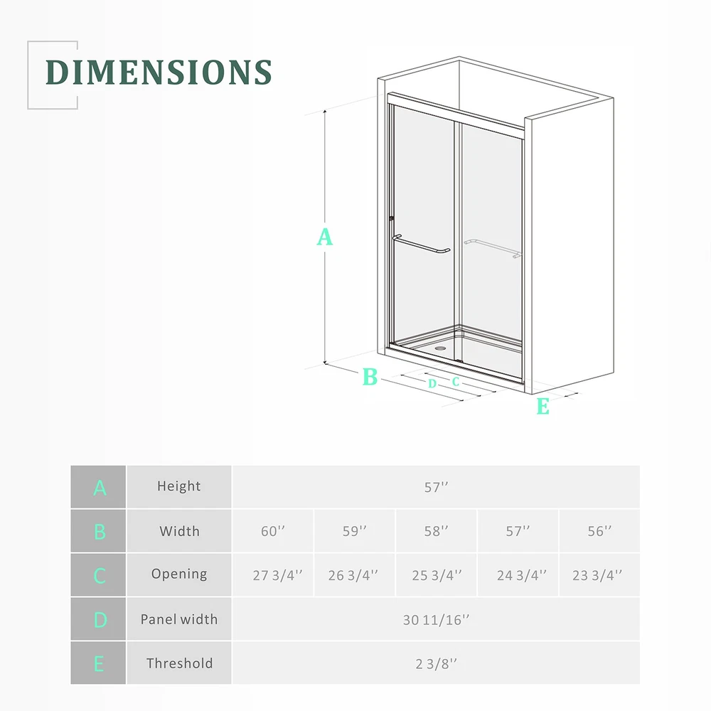 Double Sliding Bathroom Door Glass Design The 56-60''x 57'' tub shower silding door allows you to use either on the left or right door to access the tub, a space-saving solution. Hardware Finish:Chrome. High-quality Accessories All the hardware of this tub chrome top quality bathroom shower door is high-quality stainless steel, including 2 large solid rollers, 2 handles and thickened top track. High-quality stainless steel hardware ensures smooth, durable and rust-proof. Built-in rollers, tested for 100,000 times for durability, ensure your tub bathroom door glass slides smoothly, quietly and durable. The stainless steel handle can be used as a towel rack, provide a place to hang clothes and towels. Adjustable Width The top rail can be trimmed 4 inches for width adjustment (56-60 inches) by cuting the top and bottom rais. Our bathtub chrome shower silding door are designed to fit most standard tubs and provide a sleek, seamless appearance. Upgrade your bathroom with a stylish top quality bathroom shower door that combines appearance and function. Safety Tempered Glass The tub chrome bathroom door glass is designed with SGCC/ANSI-certified 1/4" (6mm) thickened clear tempered panel, which not only creates a spacious and open feeling, but also effectively resists damage. Durable and easy to maintain, it can resist shower water and soap dirt. Easy to install The illustruction and all the necessary installation accessories are in the package, easy to install. Due to the heavy glass, the shower silding door is recommend to be installed by two professional people. CHROME GLASS SHOWER DOOR ENJOY YOUR CLEAN SHOWER TIME ADVANCED DETAILS DESIGN As a professional bathroom product manufacturer, we always provide you with better products and more efficient services, but the following service terms need to be known to you: 1: If you find some problems with the product after receiving the goods, please do not discard the product, because we need you to provide pictures or videos of the relevant faults to better serve you. 2: Please note that we do not bear the installation/assembly costs. If you find a fault during the installation of the product, we will not bear or reimburse this cost because we stipulate that all parts must be checked before booking. 3: Delivery within the United States only, excluding Alaska/Hawaii, Puerto Rico, Guam, Saipan, APO/FPO, US Protectorates and PP Box. Usually the delivery time is 1 to 7 business days. If you still have not received the goods after 7 business days, please contact us immediately and we will track the order for you. 4: If your goods are damaged when delivered, you must refuse the order and describe the damage on the receipt. Just fill in "the goods are damaged". If you accept the goods and the damage is not noted on the receipt, we reserve the right not to refund or replace your goods. If you are not satisfied with your purchase, please contact us within 7 days. Please note that there is a 20% restocking fee and all shipping and handling charges are the responsibility of the buyer.
