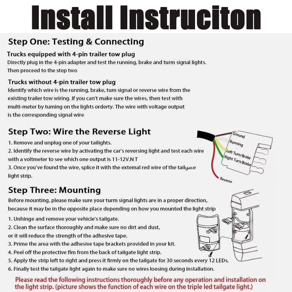 Product Description If there are any problems after you purchased, please message us by ebay firstly, we will help!! Please don't leave neutral or negative feedback or open a return request without any communication. Features: Waterproof 4-pin trailer connector included. Universal Fit for most truck, SUV, for jeeps and RV for pickup etc Can attach to any smooth surface by its adhesive double-side tape on the back. Flexible and easy to installation even can mounted to the rear window,party household decoration and so on. Long lifespan,over 70000 hours. Made by OEM approved & ISO certified manufacturers in materials that meet or exceed strict OEM requirements. Specifications: Brand New,100% high quality. Input voltage: DC12V LED power: 6W Strip light Length: 60 inch Strip light width : 0.63inch Strip light height: 0.2inch (5mm) Waterproof: IP68 Material: SMD LEDs+Silicone Fuse amperage: 5A Led quantity: 432pcs (144pcs Red SMD + 144pcs White SMD + 144pcs Amber SMD) Light Color: Red for DRL and Brake, White for Reverse Lights,Yellow for Flow Turn Signal and Double Flash . Working TEMP: -20° F - 150° F Waterproof Rate: IP65 Lampholder Interface: Standard 4 PIN connector Light Angle: 180° Waterproof Mode: Epoxy waterproof Note: 1.This led strip only performs one function. When both brake and turn signal are applied, only the brake light on the LED strip is turned on.The turn signal will start functioning until the brake is released. 2. Well conductive standard 4-pin flat plug.Simple installation with User Manual.If you encounter an unsuitable situation, you can try to go to the nearest car repair shop for decoding adaptation. Some car models need to be decoded before they can be used normally.(Reverse light may require wiring) 3. Professional installation is highly recommended (No instruction included) 6 Functions for LED Strip: 1, Running mode, all red LEDs light up(dipped beam) 2, Brake mode, all Red LEDs light up(high beam) 3, Reverse mode, all White LEDs light up 4, Turn left mode, left Amber LEDs sequentially light up 5, Turn right mode, right Amber LEDs sequentially light up 6, Hazard Emergency Double Flash Mode:left & Right indicator sequentially flowing from center to both sides. Package include: 1x 60" LED Strip Tailgate Light strip General Installation Information: For reference only 1. It is recommended that you test the bar for full functionality before mounting. 2. Unhinge and remove your tailgate. 3. Clean the area thoroughly. Any dirt or dust can reduce the strength of the adhesive 4. If you afraid it may be fall off,you can buy Adhesive Booster at your local and Prime the area with it. 5. Peel off the red protective film from the tape side of the bar 6. Apply the bar left to right, pressing firmly every 12 LEDs for 30 seconds. 7. Finally, test your lights one last time to make sure no wires came loose during installation. Shipping Returns Payment Contact US All items will be shipped in 48 hours after receiving your payment . We ship this item to US only via USPS/UPS/Fedex,etc. It usually takes 3-6 working days to deliver. Many factors may cause package delays, such as location, weather, and the products in the order. We hope you can understand. If you have any questions, please send us an email and we will handle it for you as soon as possible. Thank you. International package usually takes about 7-18 working days to reach you. Please wait paitently,thanks We only ship to confirmed Ebay addresses. Your Ebay address MUST MATCH your Shipping address ▲▲▲ Please contact us first before you sent a return request ▲▲▲ Any problems you meet, we will help to solve it,We will ensure that customers do not suffer losses, please don't worry.Trust us!!! 1) No NEED TO RETURN . If you received an incorrect, damaged, defective, or item not as described, Just Contact us directly by ebay messages,send us the photos, videos, we will give you the partial or full refund or replacement on our cost. 2) If you sent a return request ,please selete the reason for return: Changed my mind/Just didn't like it/Order by mistake .Thanks for your cooperation. Return products must also be in its original condition: including box, packaging and all other accessories. Please email us your return tracking number too,thanks. 1.We accept PayPal, MasterCard, Visa, American Express, Discover and etc payment. 2.Payment is expected within 7 days of auction close. Unpaid Items will be forfeited per eBay . 3.Immediate payment needs to be processed for items. 4. Please Note: The buyer is responsible for any applicable import duties and local taxes. Our Working Time: (GMT+8)Monday to Friday,9:00am-18:00pm. For inquires and customer support, please send your emails via ebay email system. All emails will be responded to within 24 hours during working days. Weekends Time will be responded to within 24-48 hours . Please be patient and give us some time, we will solve your problem ASAP. You can also send photos or videos for us to quickly answer your questions. Thank you very much,and thanks for your understanding. We appreciate your business and strived to improve our customer service and our commitment to quality. We will leave a 5-star positive feedback immediately after payment is received. We appreciate a 5-star positive feedback as much as you do.It is very important for us. Please DO NOT give us a neutral or negative review. We are a growing small store and we will do our best to improve every thing. Please give us a chance. Really!!! Appreciated!! NEED YOUR SUPPORT!!! Shipping All items will be shipped in 48 hours after receiving your payment . We ship this item to US only via USPS/UPS/Fedex,etc. It usually takes 3-6 working days to deliver. Many factors may cause package delays, such as location, weather, and the products in the order. We hope you can understand. If you have any questions, please send us an email and we will handle it for you as soon as possible. Thank you. International package usually ta