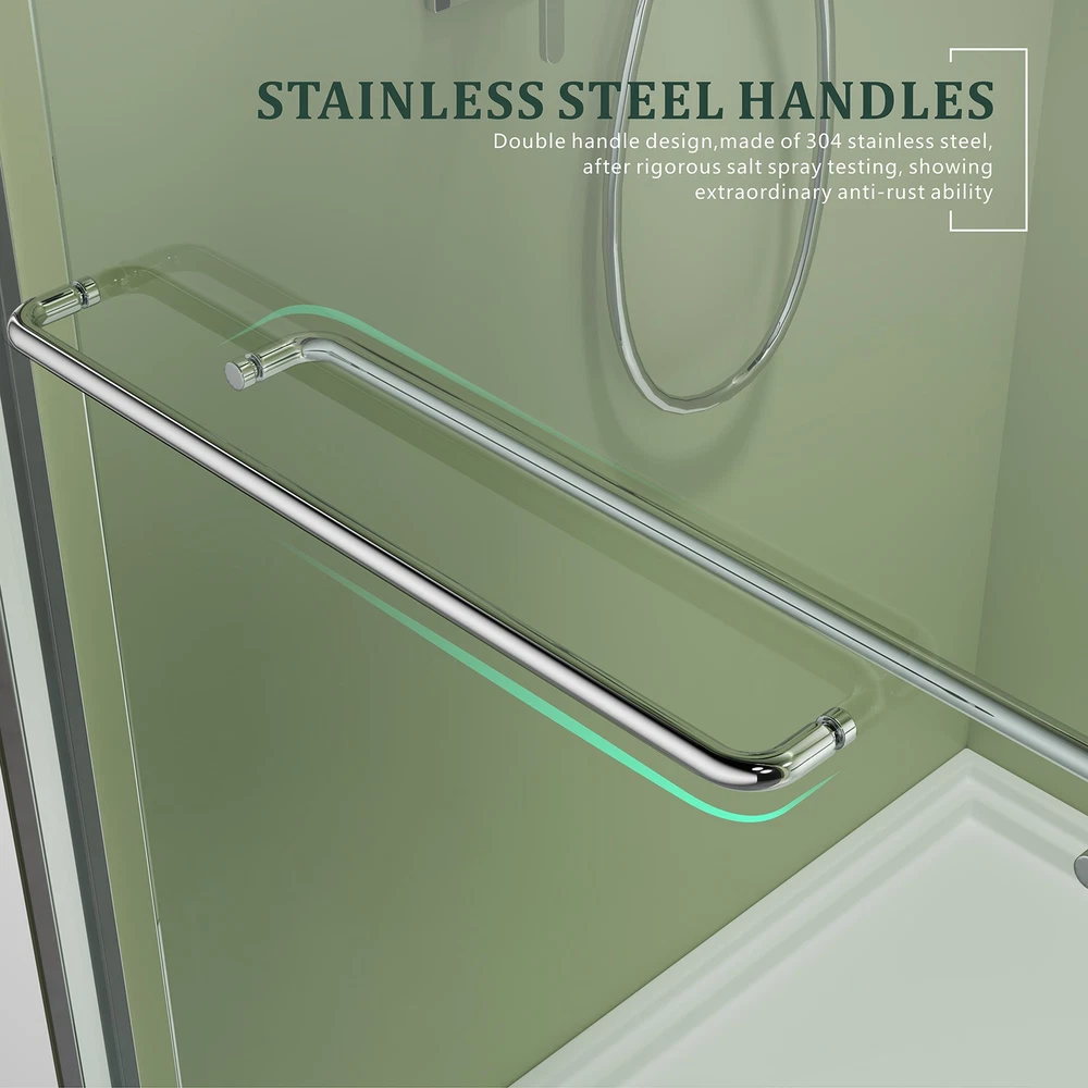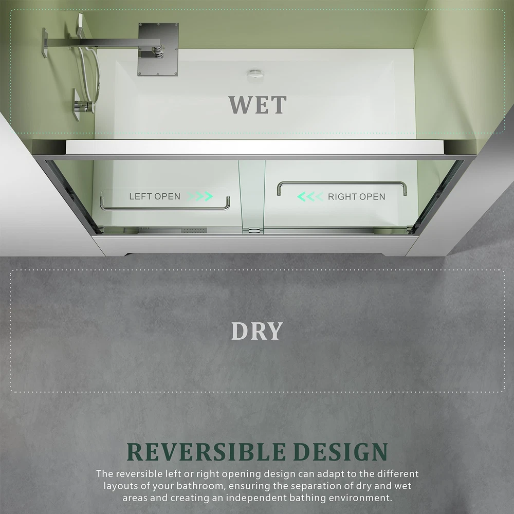 Double Sliding Framed Shower Door Design The 56-60''x 57'' tub door with glass allows you to use either on the left or right door to access the tub, a space-saving solution. Hardware Finish:Chrome. Adjustable Width The top rail can be trimmed 4 inches for width adjustment (56-60 inches) by cuting the top and bottom rais. Our bathtub chrome door with glass are designed to fit most standard tubs and provide a sleek, seamless appearance. Upgrade your bathroom with a stylish double sliding door that combines appearance and function. Safety Tempered Glass The tub chrome framed shower door is designed with SGCC/ANSI-certified 1/4" (6mm) thickened clear tempered panel, which not only creates a spacious and open feeling, but also effectively resists damage. Durable and easy to maintain, it can resist shower water and soap dirt. High-quality Accessories All the hardware of this tub door with glass is high-quality stainless steel, including 2 large solid rollers, 2 handles and thickened top track. High-quality stainless steel hardware ensures smooth, durable and rust-proof. Built-in rollers, tested for 100,000 times for durability, ensure your tub chrome double sliding door slides smoothly, quietly and durable. The stainless steel handle can be used as a towel rack, provide a place to hang clothes and towels. Easy to install The illustruction and all the necessary installation accessories are in the package, easy to install. Due to the heavy glass, the framed shower door is recommend to be installed by two professional people. CHROME GLASS SHOWER DOOR DURABLE TEMPERED GLASS ENJOY YOUR CLEAN SHOWER TIME ADVANCED DETAILS DESIGN As a professional bathroom product manufacturer, we always provide you with better products and more efficient services, but the following service terms need to be known to you: 1: If you find some problems with the product after receiving the goods, please do not discard the product, because we need you to provide pictures or videos of the relevant faults to better serve you. 2: Please note that we do not bear the installation/assembly costs. If you find a fault during the installation of the product, we will not bear or reimburse this cost because we stipulate that all parts must be checked before booking. 3: Delivery within the United States only, excluding Alaska/Hawaii, Puerto Rico, Guam, Saipan, APO/FPO, US Protectorates and PP Box. Usually the delivery time is 1 to 7 business days. If you still have not received the goods after 7 business days, please contact us immediately and we will track the order for you. 4: If your goods are damaged when delivered, you must refuse the order and describe the damage on the receipt. Just fill in "the goods are damaged". If you accept the goods and the damage is not noted on the receipt, we reserve the right not to refund or replace your goods. If you are not satisfied with your purchase, please contact us within 7 days. Please note that there is a 20% restocking fee and all shipping and handling charges are the responsibility of the buyer.