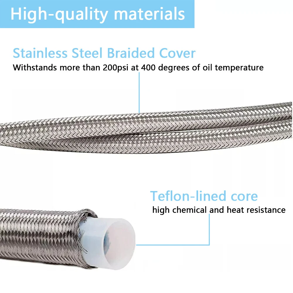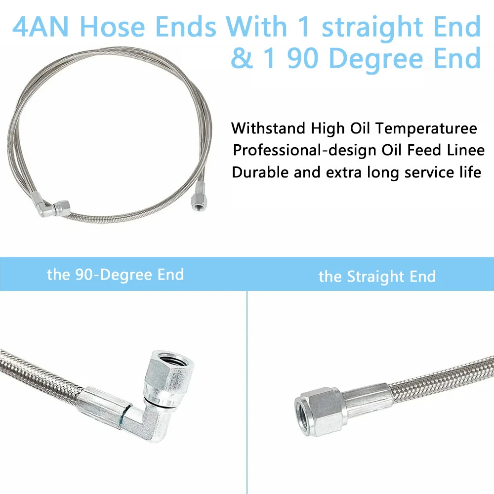 60inch Length 4AN Remote Turbocharger Sensor Steel Braided Turbo Oil Feed Line Function This steel braided turbo oil feed line connects your turbo chargers oil gallery to the engine, it drains the oil away from the bearings inside the turbo charger. Material Made of heavy duty steel for great reliability and long service life; Manufactured to specification, meet or even exceed standard in function, performance and quality. Features This line is 60 inches length, and the hose end is 4AN(0.4375” OD), comes with 1 Straight End and 1 90 Degree End. Package included 1 * 4AN hose.