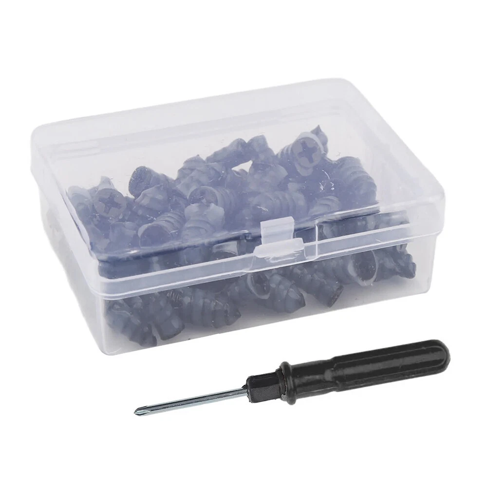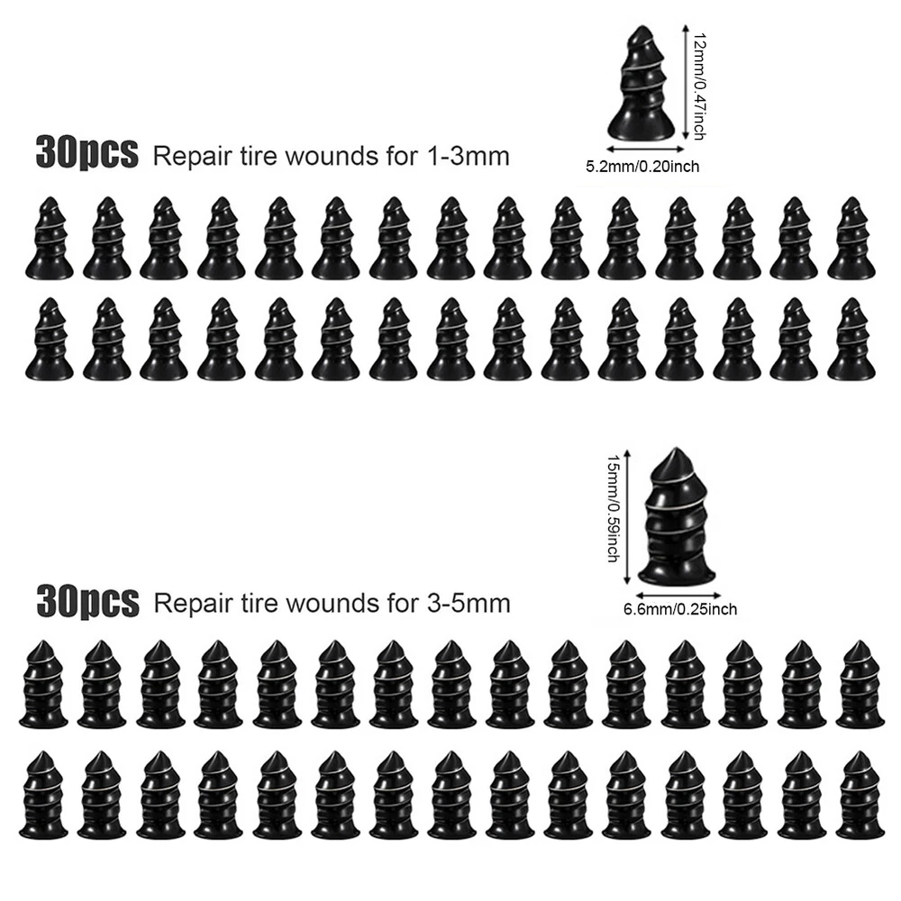 Product Feature: - Easy To Use: The simplest way to repair tires, Simply to insert the nail into the tire wound for a simple and efficient patching job. Repair your tire by yourself, and save your time. Emergency repair tools, easily repair punctures without removing the tire from the rim. - 2 Sizes: 60PCS total and we provide 2 sizes of tire repair nails for you, smaller one is approx. 5.3 x 12mm/0.2 x 0.47 inch and larger one is about 6.6 x 15mm/0.26 x 0.59 inch. - Premium Material and Good Seal: These rubber tire screws are made of high-quality materials rubber and iron, wear-resistant and durable. The middle thick thread can Effectively enhance the bite force between the screw and the tire, with a good sealing effect. - Easy Carrying: Compact package, easy for you to store and carry while traveling, driving, biking and so on. Repair tires by yourself! - Widely Application: These motorcycle tire repair tools have a wide range of usage, suitable for cars, mountain bikes, electric bikes, motorcycles, trucks, and other tubeless vehicles. Specification: Type:Tire Repair Kit Material:Rubber Small Size:about 0.2 x 0.47 inch Large Size:about 0.25 x 0.59 inch Package Included: 60 x Screw tire plugs 1 x Screwdiver On Sep 24, 2024 at 21:47:23 PDT, seller added the following information: