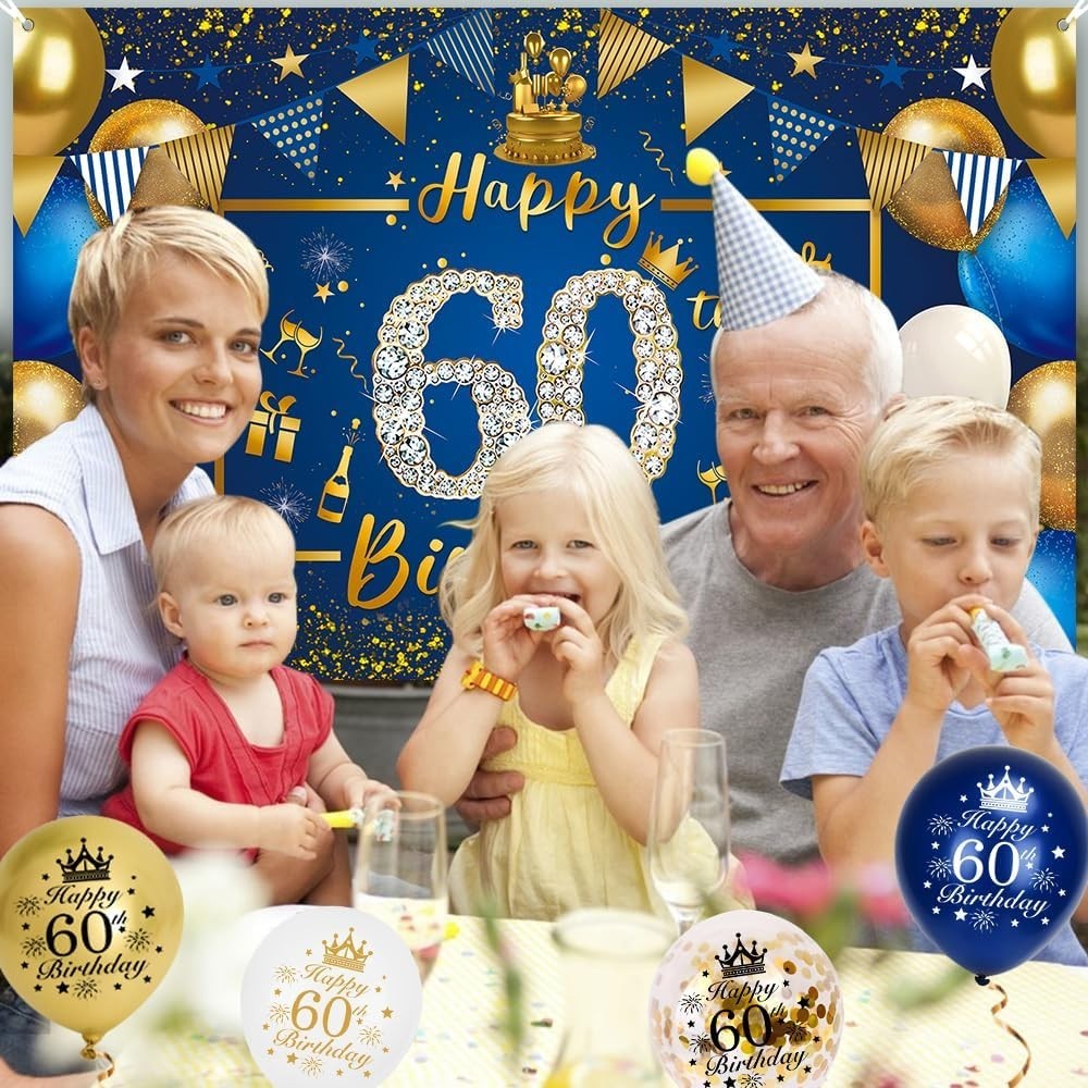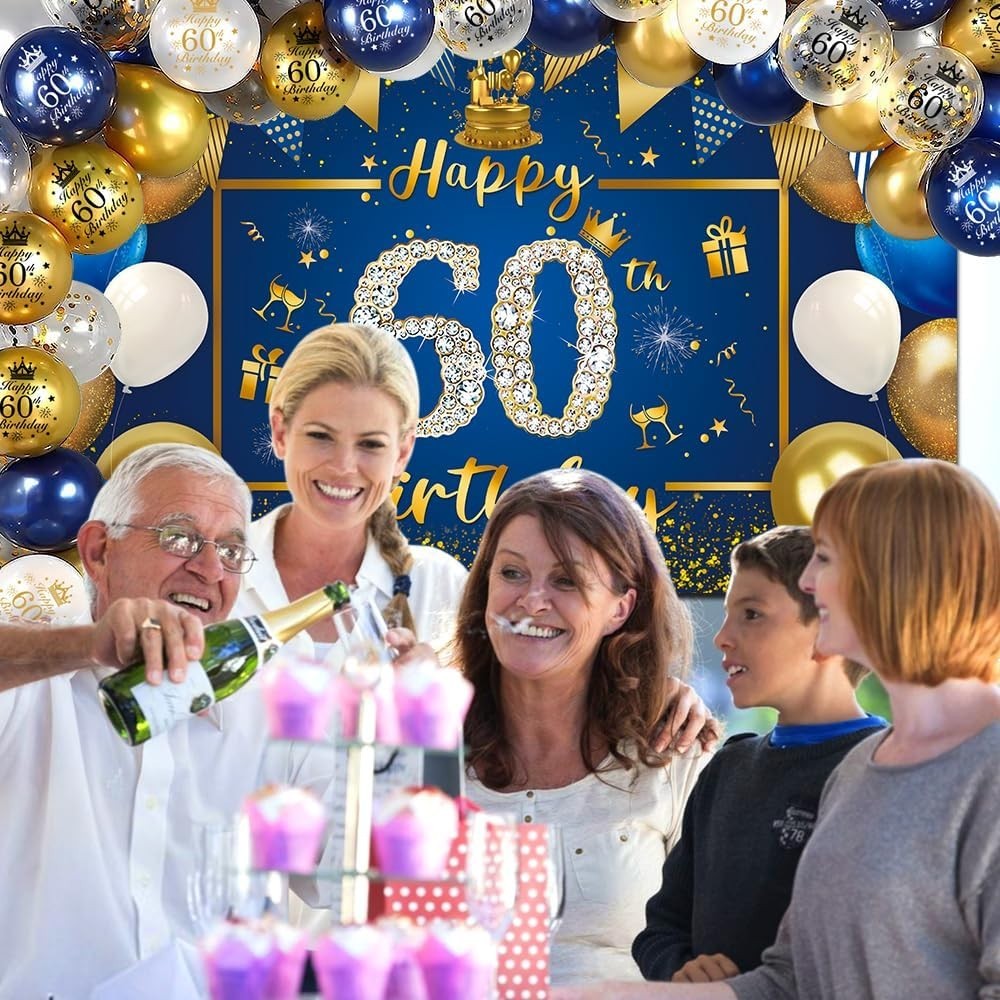 Celebrate a man's 60th birthday in style with this blue and gold banner and balloon set. The party supplies include cupcake toppers, ribbon, and flags, all made from paper, aluminium, and rubber materials. The branded decorations are perfect for adding a touch of elegance to the birthday celebration, whether it's a themed party or a surprise event. Made in China, these blue-themed decorations are sure to make the birthday boy feel special on his special day.