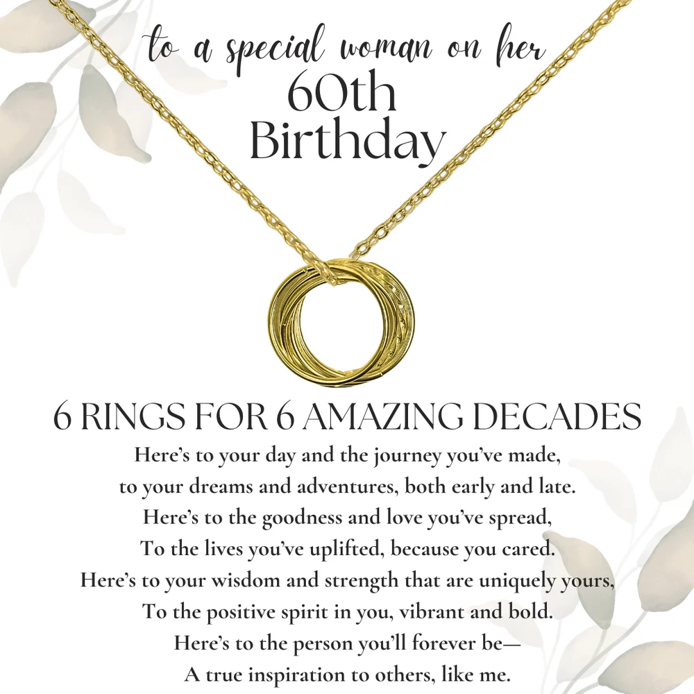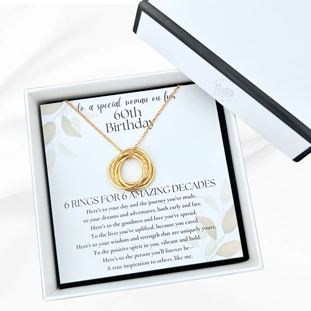 Sixty Years, One Extraordinary Life – Sterling Silver Gold Plated 6-Ring Necklace Turning 60 is more than just a birthday—it’s a celebration of a life well-lived, memories cherished, and love shared . This Sterling Silver 6-Ring Necklace is a meaningful tribute to six incredible decades, with each interlocking ring symbolizing strength, wisdom, and the many lives she has touched. Whether you're honoring your mother, grandmother, sister, or a dear friend , this timeless keepsake is a beautiful way to celebrate her journey and remind her how truly special she is. Elegant & Meaningful Design Premium S925 Sterling Silver Gold Plated – Handcrafted for lasting beauty and durability. Six Interlocking Rings – Each ring represents a decade of love, strength, and resilience. Symbol of Unity & Timeless Elegance – A delicate yet powerful reminder of her life’s journey. Gift-Ready Packaging – Includes a luxury gift box, silver polishing cloth, and a heartfelt message card. Adjustable & Comfortable Fit – Features a 16” + 2” extender chain for the perfect length. S925 Sterling Silver Gold-Plated – A warm and sophisticated finish, perfect for everyday luxury. Why Choose This Necklace? This isn’t just jewelry—it’s a symbol of love, legacy, and strength . Designed to be both elegant and meaningful , this necklace is a thoughtful way to celebrate her incredible 60-year journey . Handcrafted with Care – Expertly made with premium materials for quality that lasts. Lightweight & Skin-Safe – Nickel-free, lead-free, and hypoallergenic for all-day comfort. A Gift to Remember – Comes beautifully packaged, ready for gifting—no extra wrapping needed. Designed for a Lifetime of Wear Durable & Tarnish-Resistant – Crafted from high-quality S925 Sterling Silver Gold Plated . Hypoallergenic & Safe for Sensitive Skin – Free from harsh metals, ensuring irritation-free wear. Strong & Secure Clasp – Keeps the necklace in place while offering a comfortable fit. How to Wear & Adjust Place the necklace around the neck. Secure the clasp for a comfortable fit . Adjust the 2-inch extender to achieve the perfect length. Wear daily as a reminder of strength, love, and cherished memories . What Customers Are Saying "I got this for my mom’s 60th birthday, and she absolutely loves it! The quality is amazing, and the symbolism makes it so meaningful. It brought tears to her eyes—such a perfect gift!" – Lisa M. (Verified Buyer) Frequently Asked Questions Q: Is this necklace adjustable? A: Yes! The chain includes a 2-inch extender , allowing for a customizable fit. Q: Will the necklace tarnish over time? A: No! It is made from high-quality S925 Sterling Silver Gold Plated , ensuring lasting shine. Q: Is this necklace suitable for sensitive skin? A: Yes! It is nickel-free, lead-free, and hypoallergenic , making it safe for everyday wear. Q: Does it come in a gift box? A: Yes! It arrives gift-ready in a luxury box with a silver polishing cloth and heartfelt message card . Celebrate Her Journey – Order Now Perfect for birthdays, milestone celebrations, or a heartfelt surprise , this Sterling Silver 6-Ring Necklace is a timeless way to honor 60 incredible years . Add it to your cart today and give her a gift she’ll treasure forever!