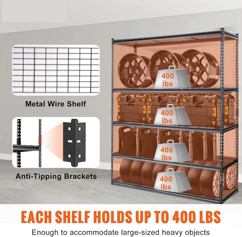 Description: 1. Material: Black Finished Durable Steel Construction, Say goodbye to rust and oxidation—this utility shelf features a premium powder coating that resists scratches and ensures long-lasting performance. Designed for both functionality and style, this shelving unit is perfect for any season, providing reliable storage for tools, supplies. 2. Design: You can adjust the height of the storage shelves according to the size of the item.The spacing of each layer of this wire shelf can be adjusted.shelves adjustable leveling feet allow the wire shelving unit to be placed on uneven ground--a simple twist is all it takes to stabilize.wire shelving unit wire shelf storage shelves . 3. Function: This storage shelves provide an enormous amount of space and strong shelves.The wire shelving unit doesn't occupy too much space,but it can create more additional space.Maximum weight capacity per shelf is 400lbs 4. Tip: The wire shelving unit is simple to assemble, You only need to spend 15min to install it’s storage shelves wire shelf wire shelving unit. 5. Occasion: These robust garage shelving racks offer ample space to neatly store tools, equipment, and supplies, promoting a clutter-free environment. These shelves are perfect for garages, workshops, kitchens, and more. With their sturdy construction and generous dimensions, these shelving units helping you stay organized and making access to your items easier than ever. Package Include: 1x Storage Shelves