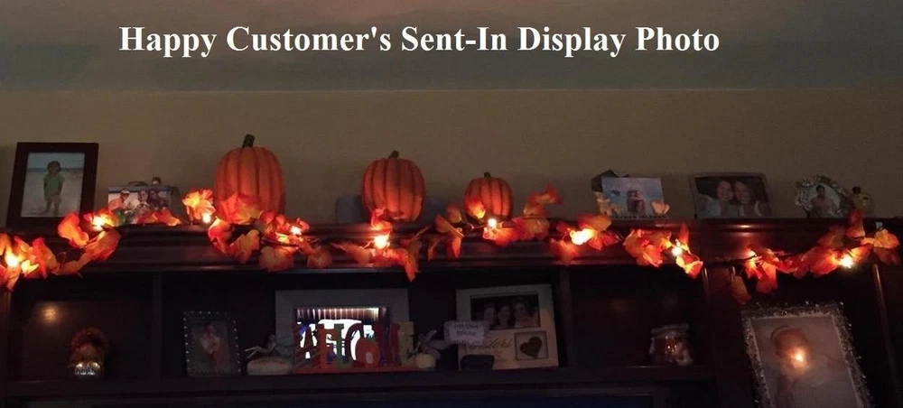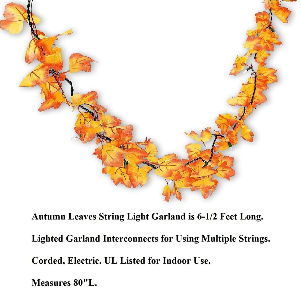 6-1/2 Ft Autumn Leaf String Lights Maple Leaves Indoor/Outdoor Electric Set #507 6-1/2 Ft Autumn Leaf String Lights Maple Leaves Indoor/Outdoor Electric Set #507 Click images to enlarge Description 6-1/2 Ft Autumn Leaf String Lights Maple Leaves Indoor/Outdoor Electric Set. Brilliant polyester leaves accent this string of mini lights, creating a dazzling effect. A great way to decorate for your Thanksgiving dinner or other autumn gatherings, it's perfect for around a window or door, or along a banister or mantel! Details: Measures 80"Long Made of Plastic with Polyester Leaves Please Note - Recommended For Indoor Use Only Light Sets Interconnect Plugs into Standard Outlet UL Listed ~Buy more than one item at the same time from our eBay store and save in shipping costs!~ (If buying different items, just put them all in your cart before paying, to get the combined shipping discount!) WARNING TO CALIFORNIA RESIDENTS: The materials used as colored decorations on the exterior of this product contain lead and/or cadmium, chemicals known to the State of California to cause birth defects or other reproductive harm. For more information, go to www.P65Warnings.ca.gov/product Shipping We use UPS SurePost, UPS, USPS and FedEx SmartPost to deliver our products to your home, depending on which method is more efficient for your order. We use suppliers for some of our orders and our suppliers will choose the service that is used for these orders. PLEASE MAKE SURE YOUR ADDRESS CAN BE VERIFIED BY USPS. Please allow 7-10 days for the item to reach your home. We cannot be responsible for items shipped to incorrect or incomplete addresses, which may result in the cancellation of your order. YES, we do combine shipping! The highest shipping cost item ships at regular price, and each additional item ships at $2.00 more in additional shipping charges. If you are buying several different items from our store, put them all into your cart before paying to get the combined shipping discount. Terms of Sale Unless otherwise noted, we accept returns up to 30 Days after your purchase, through the eBay Returns System. Please use eBay to contact us if there is any problems or issues with your order. In some cases, we order the item purchased from one of our suppliers, and it is shipped directly from our supplier to the customer. There are times when an item unexpectedly becomes unavailable from our supplier. We do our best to check on all of the items availability several timea a day. If an item is unexpectedly unavailable, we will issue a refund immediately. Contact Us Please use the message center in eBay to contact us. We check our message box in eBay several times a day. If you have any questions or concerns with your order, please feel free to contact us. We care very much about our customers being 100% happy with their purchases. We would very much appreciate you letting us resolve any issues you may have with your order by contacting us first, before taking any other unnecessary actions. Images sell! Get Supersized Images & Free Image Hosting Create your brand with Auctiva's Customizable Templates. Attention Sellers - Get Templates Image Hosting, Scheduling at Auctiva.com.