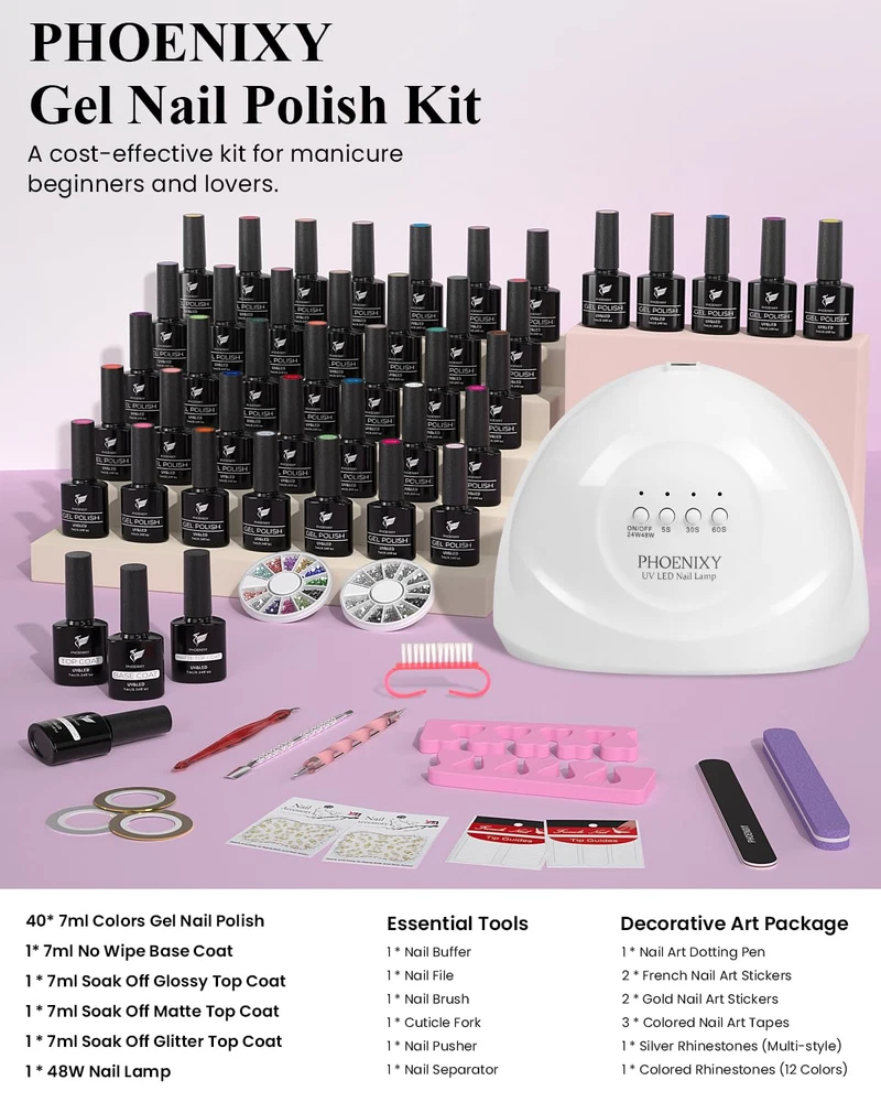 Store New Arrivals Add to Favorite View Feedback Contact Fast deliveries to the customer's home Quality customer service John Make the customers happy! 61 PCS Gel Nail Polish Kit with UV Light, 40 Colors Gel Nail Polish Set Spring Summer Collection with 48W Nail Lamp Manicure Starter Gel Nail Kit Base Top Coat Gifts for Women Description [PHOENIXY Gel Nail Polish Kit with Nail Light]: 40 colors 7ml gel nail polish, 7ml base coat, 7ml top coat, 7ml matte top coat, 7ml glitter top coat, 48W UV Nail Lamp, nail decorations and other manicure tools. A cost-effective kit for manicure beginners and lovers. With some practice, you can get beautiful nail art for all seasons and occasions- parties, holidays, work or daily life. [High Quality & Long Lasting]: Made of natural resin, Phoenixy gel nail polish contains botanical ingredients and lowest smell, harmless to skins or nails. The higher quality promises better adhesion and gloss, smooth application, and strong color-locking ability. The nail polish can last more than 3 weeks with proper application (keep your nails clean with file and buffer before applying base coat). [120 Effects of Colors]: Phoenixy gel nail polish kit includes 7ml glossy top coat,7ml matte top coat and 7ml glitter top coat. You get two effects of color for the price of 1. You can switch the three effects at your leisure time without the hassle of going to a nail salon, saving your time and money. [48W U V LED NAIL LIGHT]: Our auto-sensing 48W LED UV nail lamp contains 30 led light beads to efficiently cure each nail in all directions. Nail Light displays 3 timer settings (5s/30s/60s) to cure all kinds of gel swiftly and safely within 90-120 seconds. No harm to skins or nails. [Exquisite Gift For Women]: The gel nail kit is carefully selected with a wide range of classic and attractive colors. The bottle of base and top coat ensures higher texture and better sealing. This is a unique beauty gift set for women at birthdays, Valentine’s Day, Mother’s Day, Christmas or other festivals. [Committed Phoenixy Services] Long-distance shipping may damage the product. If there is any problem with Phoenixy gel nail polish kit( e.g. the product is not new or damaged, or items are missing), please feel free to contact us. Product Description Spring Colors Pink represents a happy mood, representing sweetness, tenderness, and innocence. Spring Colors Purple represents romance, mystery, nobility, uniqueness, and sunshine. Summer Colors Yellow represents warmth and closeness. 1 Pink 2 Purple 3 Yellow 1 Natural Resin 2 Natural Water 3 Low Odor Other customers are also interested in PHOENIXY Add to Cart Add to Cart Add to Cart Add to Cart Add to Cart Add to Cart Add to Cart Customer Reviews 4.2 out of 5 stars 288 4.2 out of 5 stars 288 4.2 out of 5 stars 288 4.2 out of 5 stars 160 4.2 out of 5 stars 160 4.2 out of 5 stars 160 4.2 out of 5 stars 160 Price $21.99 $ 21 . 99 $22.99 $ 22 . 99 $24.99 $ 24 . 99 $15.99 $ 15 . 99 $15.99 $ 15 . 99 $15.99 $ 15 . 99 $15.99 $ 15 . 99 Gel Nail Polish 40*7 ml 40*7 ml 40*7 ml 36*7 ml 36*7 ml 36*7 ml 36*7 ml Base Coat 2 PCS 2 PCS 2 PCS 2 PCS 2 PCS 2 PCS 2 PCS Top Coat Type glossy and matte glossy and matte glossy and matte glossy and matte glossy and matte glossy and matte glossy and matte Nail Light 48 W 48 W 48 W -- -- -- -- Manicure Tool ✔ ✔ ✔ ✔ ✔ ✔ ✔ Item model number SS9011 Item dimensions L x W x H 8.66 x 8.27 x 6.3 inches Special Feature Long Wearing Color 44 PCS Red Transparent Collection Finish Type Glossy Product Dimensions 8.66 x 8.27 x 6.3 inches; 3.64 Pounds Country of Origin China Type gel Model Name SS9011 Liquid Volume 10.41 Fluid Ounces Item Form Gel Included Components function(f) {var _np=(window.P._namespace("DetailPageProductOverviewTemplatesJava"));if(_np.guardFatal){_np.guardFatal(f)(_np);}else{f(_np);}}(function(P) { P.when('A').execute(function(A){ A.on('a:truncate:po-attribute-truncate-9:updated', function(data) { var isTruncated = !data.truncateInstance.getIfTextFits(); var seeMoreElement = document.getElementById('po-attribute-see-more-id-9'); if(seeMoreElement) { seeMoreElement.style.display = isTruncated ? '' : 'none'; } }) }); })); Gel nail polish, Base coat, Top coat, Matte top coat, Manicure tools, Nail decorations, 48W U V LED nail lamp See more ABOUT US We offer the best prices around on high quality products. Our E-store includes media such as books, movies, music and games while offering electronics, toys, sporting apparel, clothing, tools, general home, garden items and more. SHIPPING We are always working hard to ensure your package arrives as soon as possible. Please understand that some factors like weather, high postal traffic, and the performance of shipping companies are outside of our control. We offer free shipping to the lower 48 states and ship within 2 business days of payment, usually sooner. We do not accept P.O. Boxes. Please provide a physical address. For shipping outside of the continental USA, we only use eBay's Global Shipping Program. The item is shipped to KY and then sent to the rest of the world. International customers are responsible for all duties and taxes. Continue to 'check out' to calculate costs for shipping the item to your country. Messages regarding eBay's Global Shipping Program MUST be directed at eBay EXCLUSIVELY. RETURNS We offer a 30-Day Return Policy on items in which you are not completely satisfied with. You have the option of a full-refund or an exchange of the item. No returns are available on items shipped outside of the USA PAYMENT We accept PayPal. CONTACT US This page content is yet to come Please ad us to your favorite seller and visit again later Thank You CUSTOMER SATISFACTION We try our very best to make sure every customer is completely satisfied. If there's a problem, message us! We're happy to help. WE ACCEPT