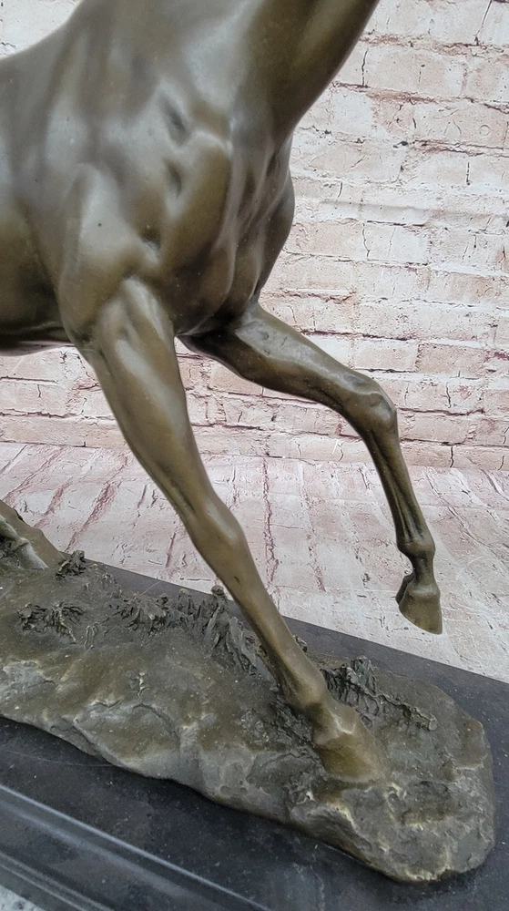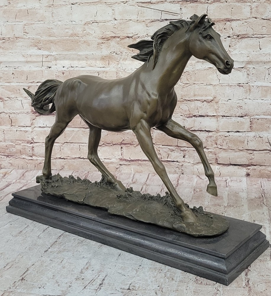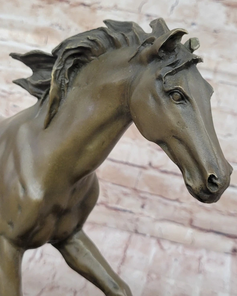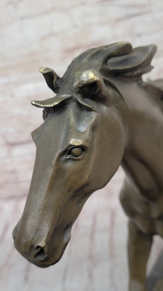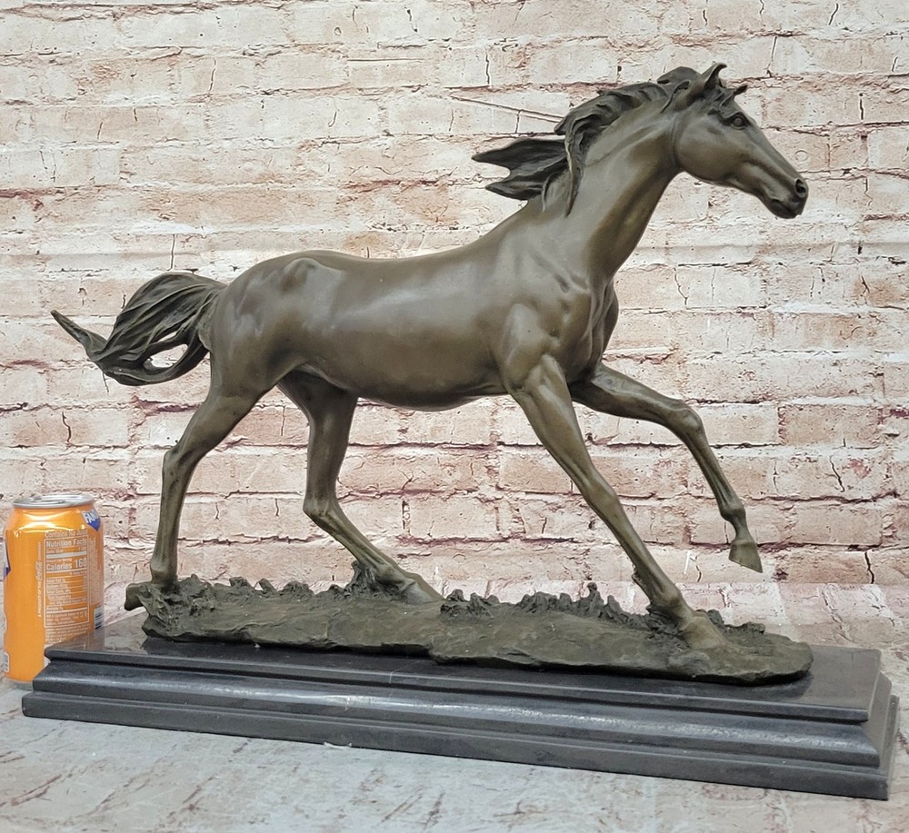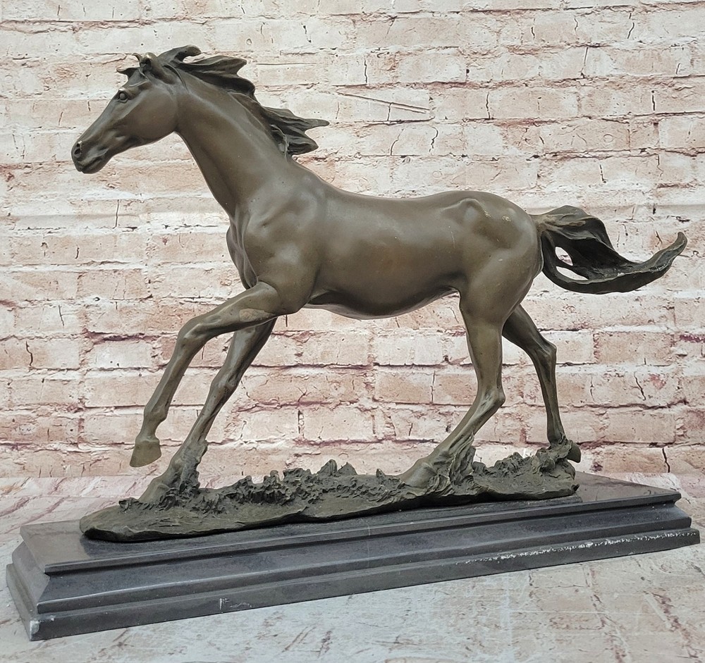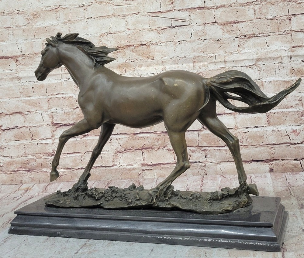 Condition : This sculpture is in perfect condition Bronze Dimensions with Marble Base: Height 15" X Width 24" Marble Dimensions:20" X 6.5" Height without base:14" Weight:35 LBS Inventory:18Y55210581 This captivating bronze sculpture captures the essence of a feral horse standing solemnly in a peaceful valley. The horse's demeanor exudes calmness and tranquility, with its long mane and untamed appearance symbolizing its wild nature. The lean body of the horse adds to its natural grace and beauty, making it an ideal piece for equestrian enthusiasts or anyone who appreciates the majestic beauty of horses. Resting on a sturdy black marble base, this sculpture is meticulously crafted using the lost wax method, a traditional technique that ensures the finest details are preserved with exceptional accuracy. The artist's signature, Mene, adds quality and value to the artwork, reflecting the skill and expertise behind its creation. Whether displayed in a home, office, or gallery, this sculpture serves as a timeless tribute to the untamed spirit of horses and the artistry involved in capturing their essence. It invites viewers to connect with the beauty of nature and the awe-inspiring presence of these magnificent animals, making it a cherished addition to any collection. Horse Lover Gift Equestrian Art Bronze Sculpture Statue Collector Artwork Gift Video will open in a new window Using the eBay App? Paste link into a browser window: [isdntekvideo]
