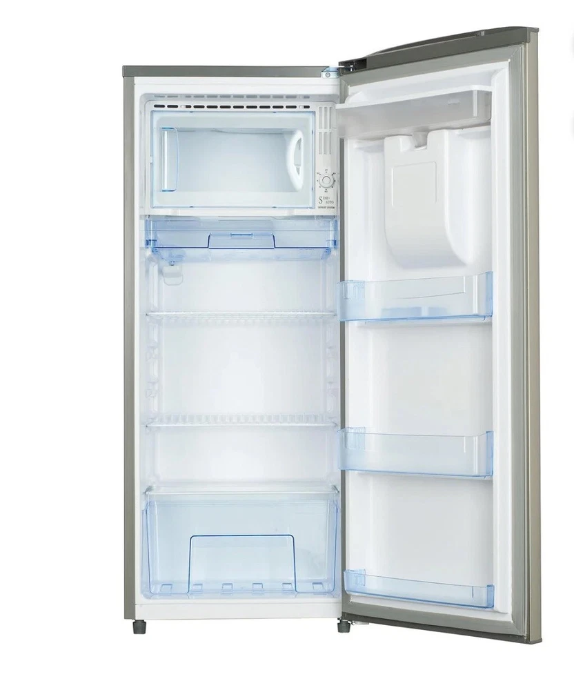 This 6.2 cu.ft refrigerator with a water dispenser is the perfect addition to any kitchen. It features a built-in top freezer and two drawers with ample storage space for all your groceries. The silver stainless steel finish adds a touch of elegance to any decor. The refrigerator has a manual defrost method and an opening door width of 38 inches, with a depth of 22 inches and a height of 51 inches. It has a cable length of 5 ft and comes with a unit quantity of 1. The Farberware brand guarantees quality and durability.