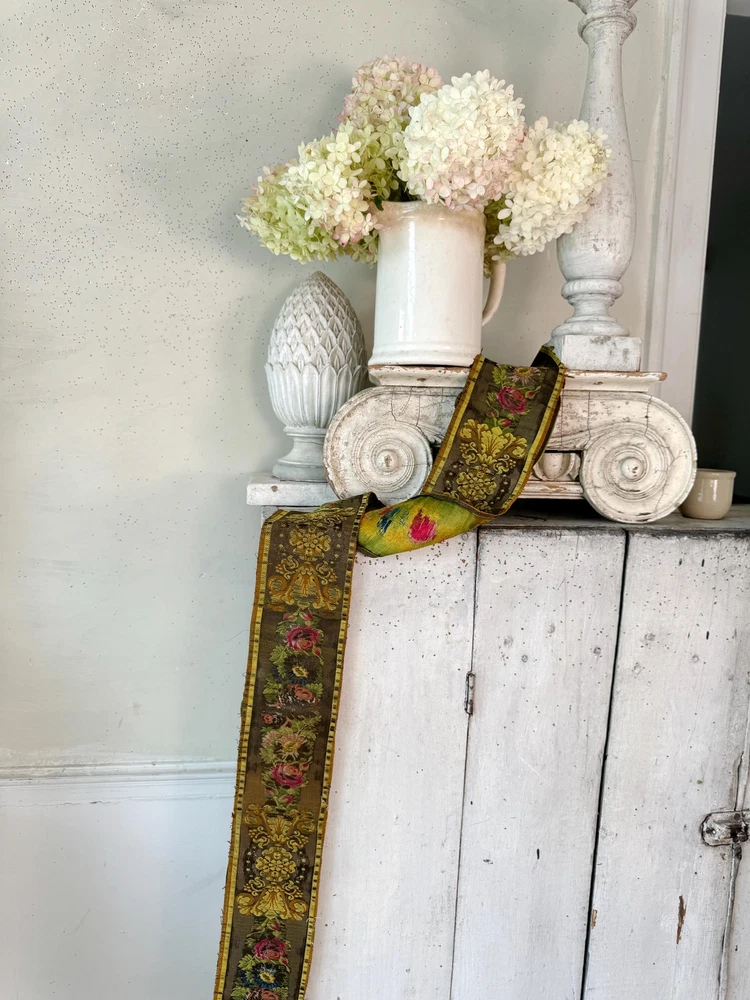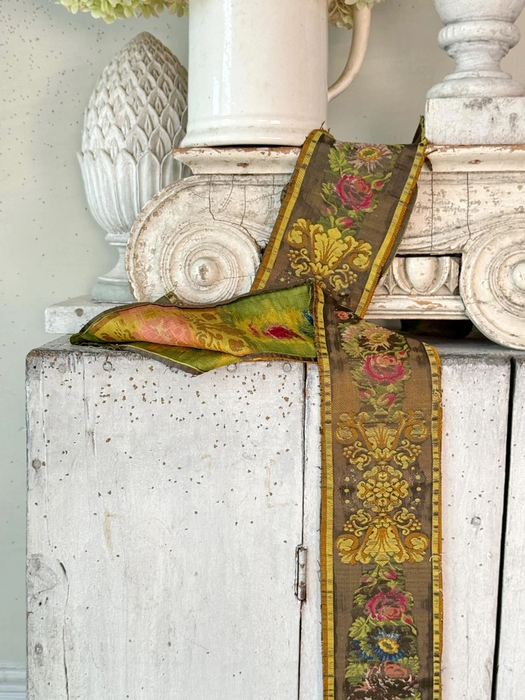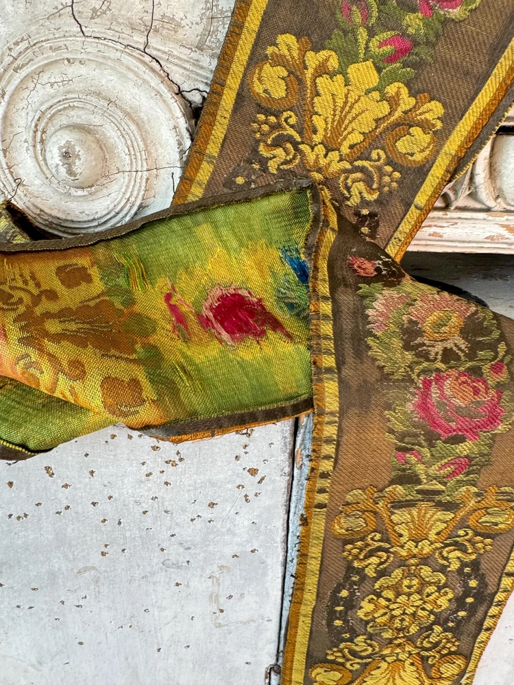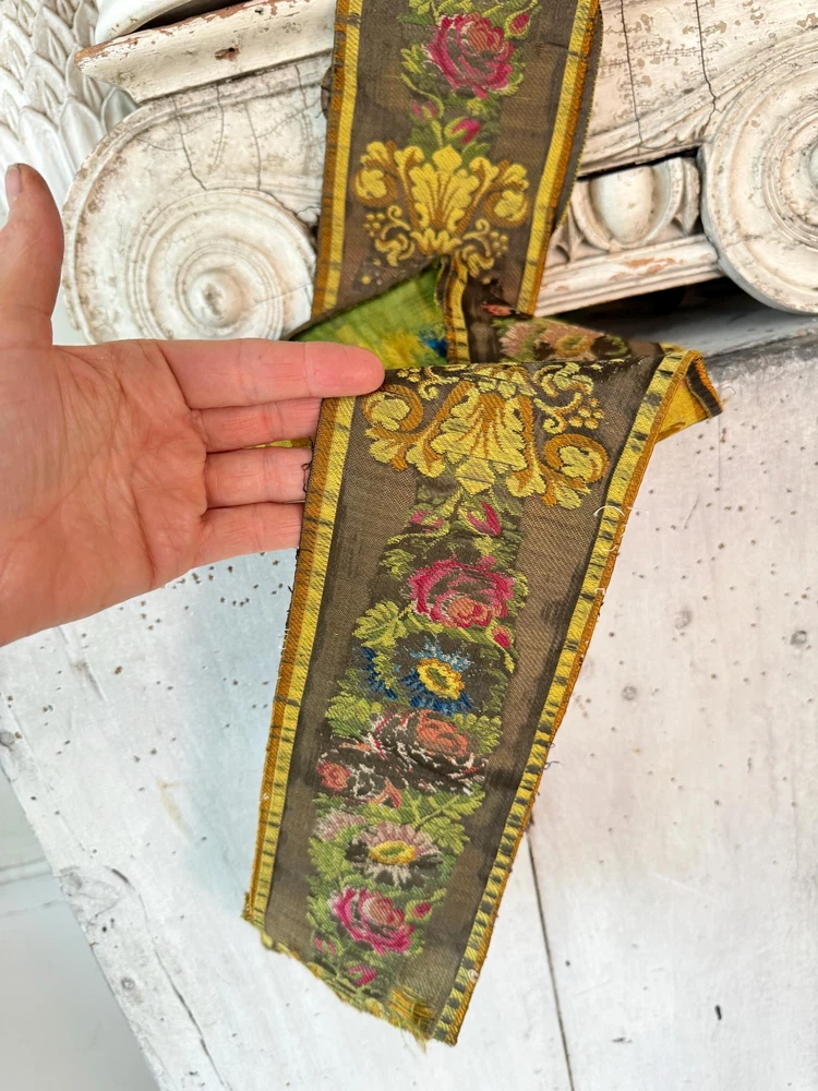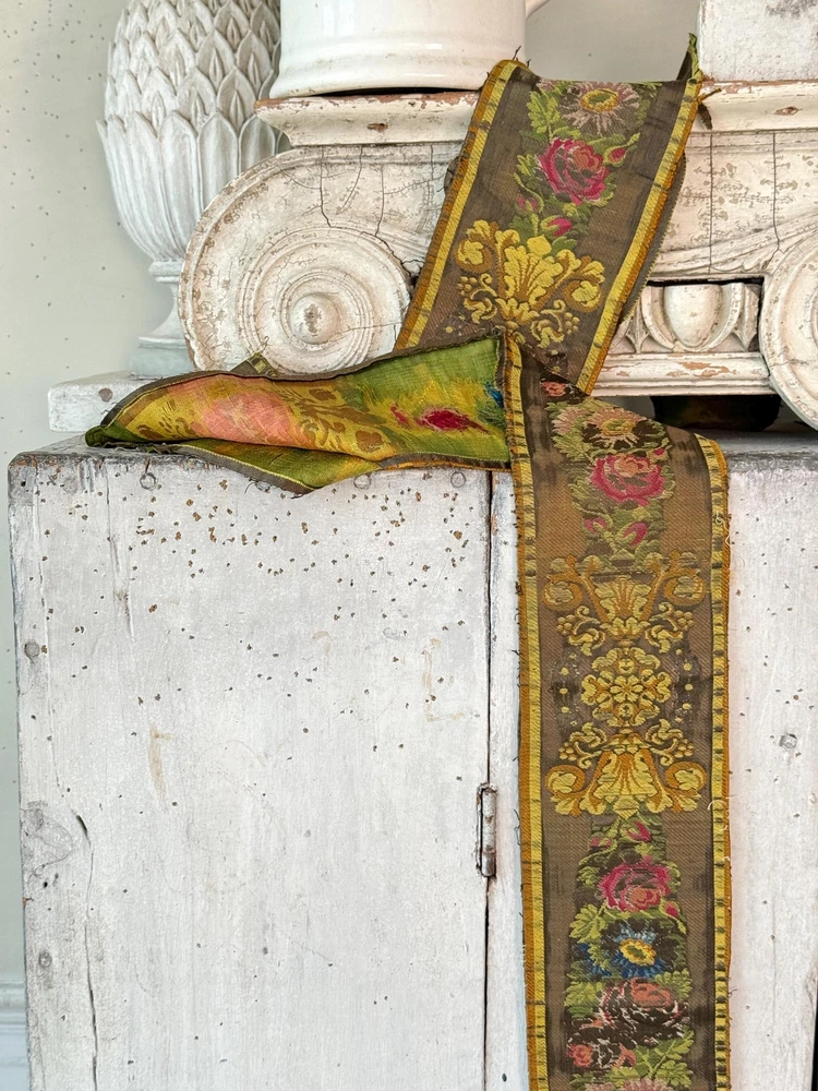 Welcome to the Textile Trunk! Please follow us on Instagram, we are @textiletrunk ! ~ A timeworn treasure! This brocade silk is a border dating from the 19th century ~ It's beautifully worn so this trim is ideal only for projects that require an aged fabric~ it's LOVELY and would add so much charm to any interior! I have another piece of this lovely trim, to view simply search my store for the words " timeworn brocade trim " Measurements : This lovely trim measures approximately 62 inches by 4 ~ CONDITION: This trim is in as found, not cleaned condition . There is uneven wear on this piece!! The side edges are worn and some of the silk threads are also! A timeworn beauty! Inventory : Shelf 4, 9902