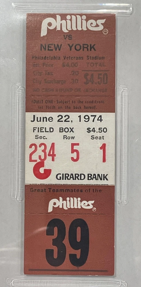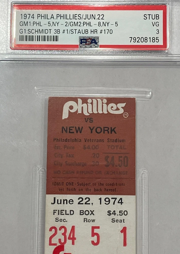 6-22-1974 Phillies ticket stub Hall of Famer Mike Schmidt hits his first Triple of his hall of fame career ! Ticket has been graded PSA VG - 3 10.00 priority shipping to anywhere in Continental U.S.