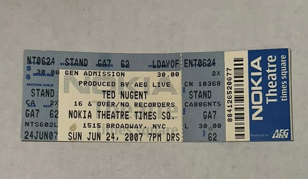 6/24/07 Ted Nugent Rock Concert Music Ticket Stub Nokia Theatre Times Square NYC